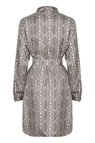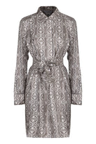 SHORT CHEMISIER DRESS WITH A SLIGHTLY ASYMMETRICAL HEM AND ROUNDED SLITS, MADE OF PURE SILK TWILL WITH MONOGRAM PRINT. IT FEATURES A WAIST BELT FOR A CUSTOMIZABLE FIT, AS WELL AS LONG SLEEVES AND A COLLAR THAT ADD A TOUCH OF CLASS. PERFECT FOR THE WARDROBE OF ANYONE WHO DESIRES A VERSATILE AND CHIC PIECE.