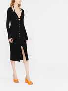 Featuring a flattering V-neckline and long sleeves, this midi-length dress offers both comfort and style with its form-fitting silhouette.