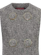 The sleeveless design showcases a classic crew neckline, while the front closure is adorned with large covered snap buttons in matching fabric, each detailed with personalized gold metal accents. Luxuriously lined with acetate and silk, this piece offers both comfort and refinement.