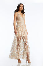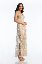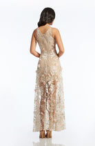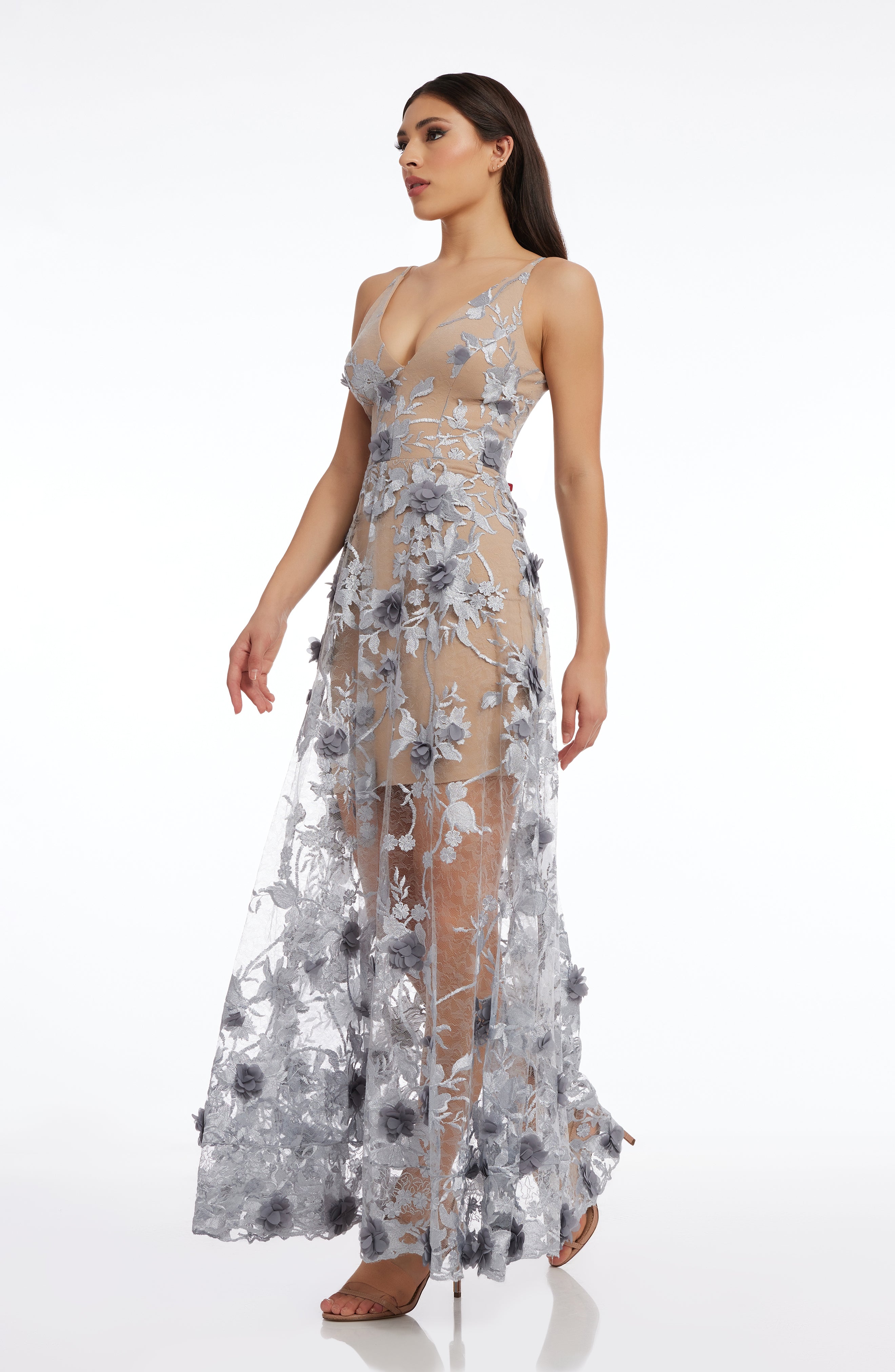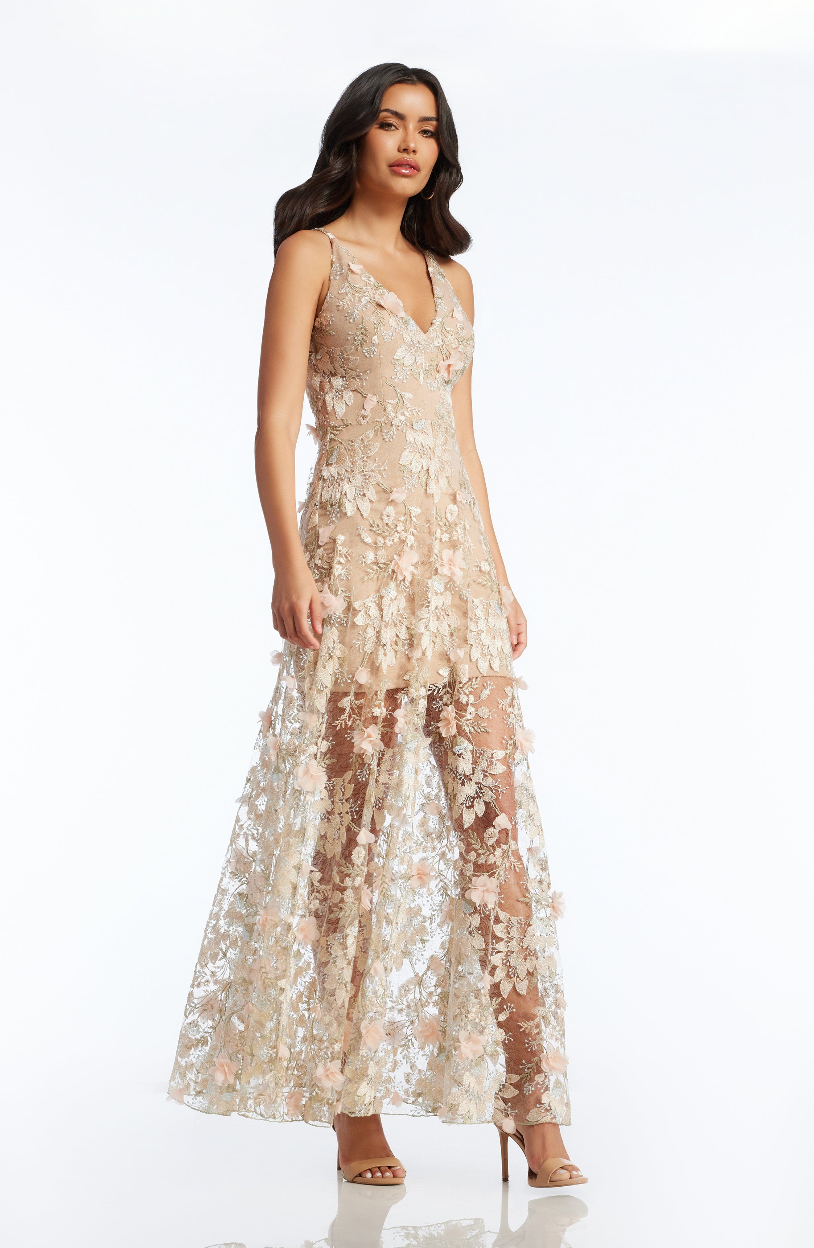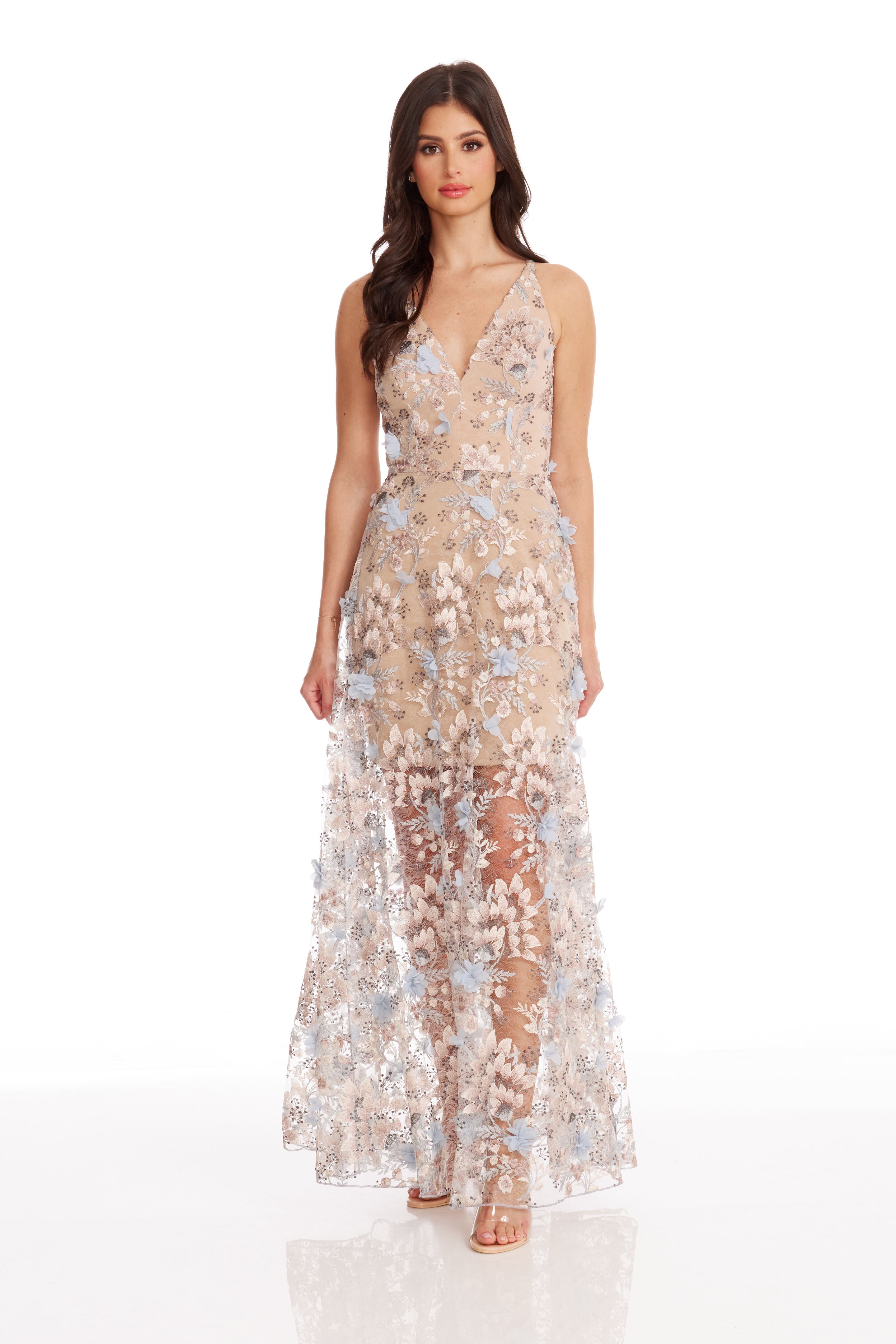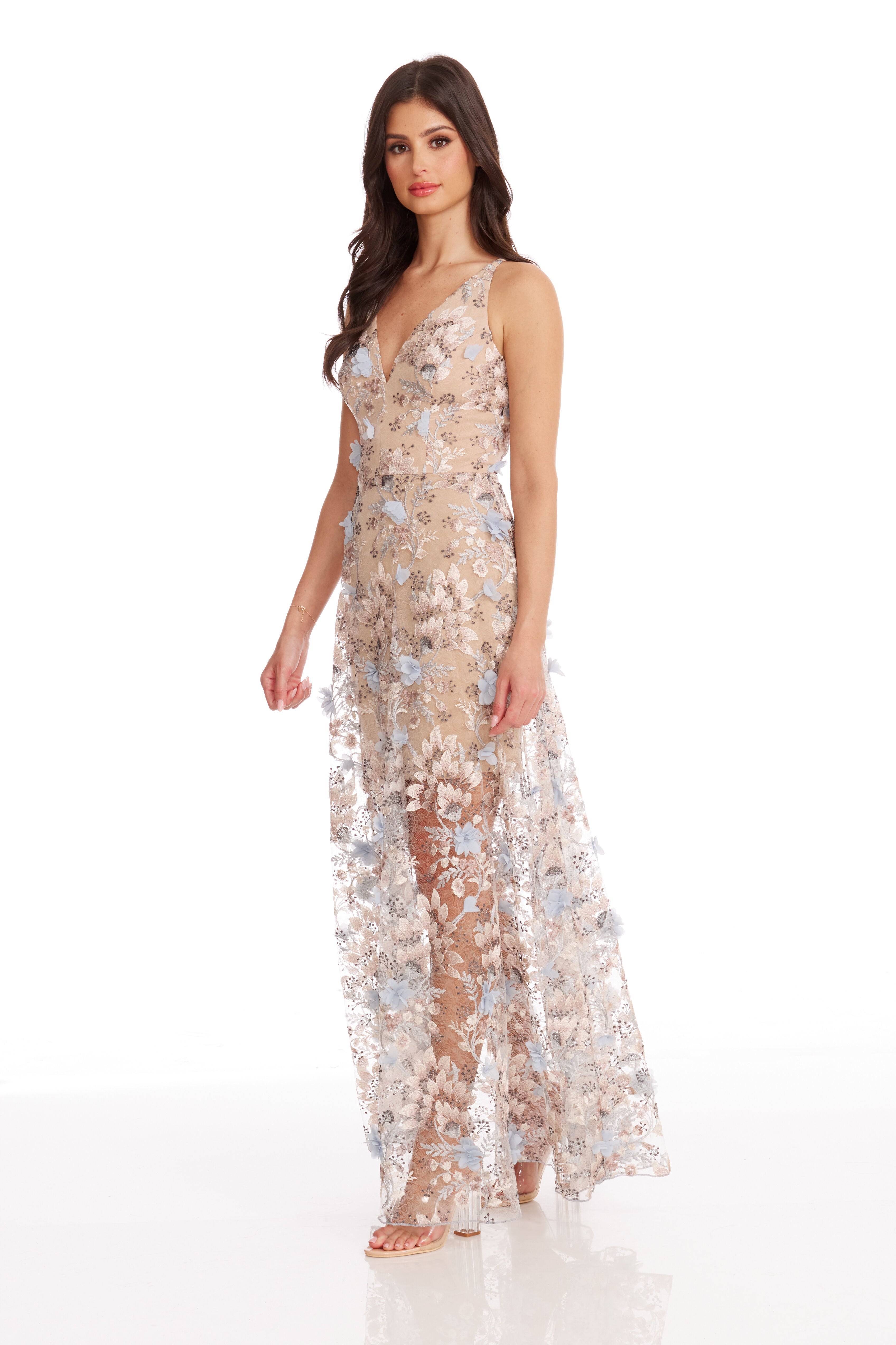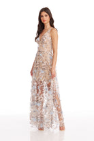 Fluttery appliqués create a lovely 3D effect on a sleeveless A-line gown featuring a plunging décolleté neckline and a sweeping peekaboo skirt. This ethereal dress is light weight with a soft nude underlay that will hug your curves.