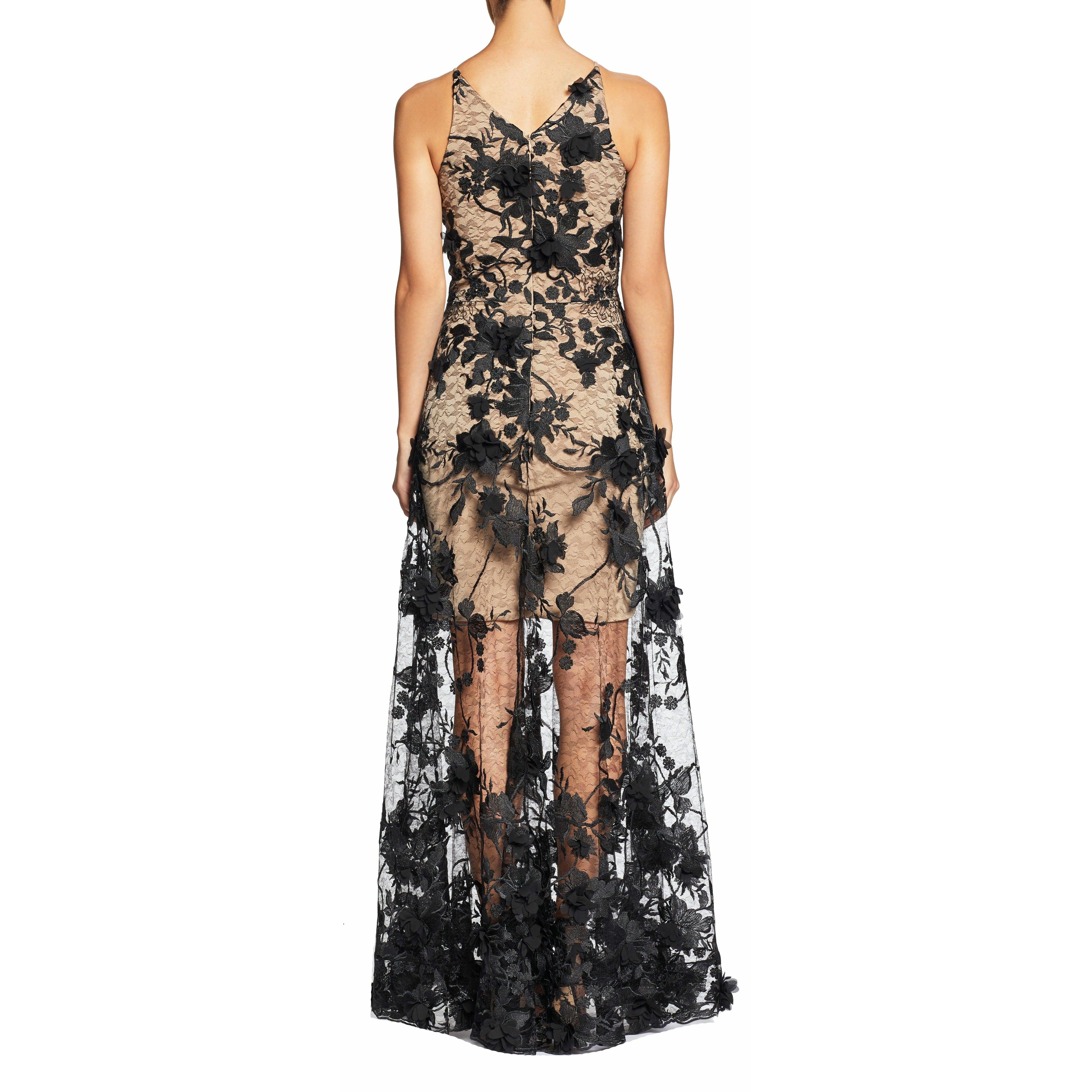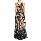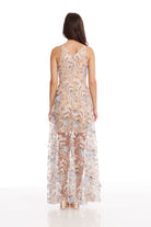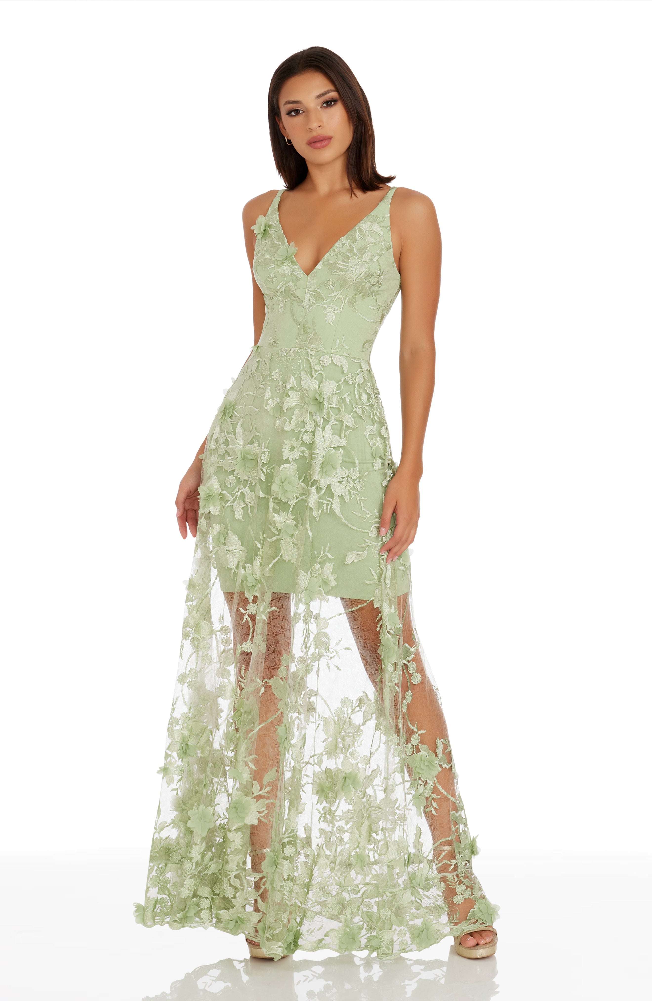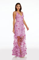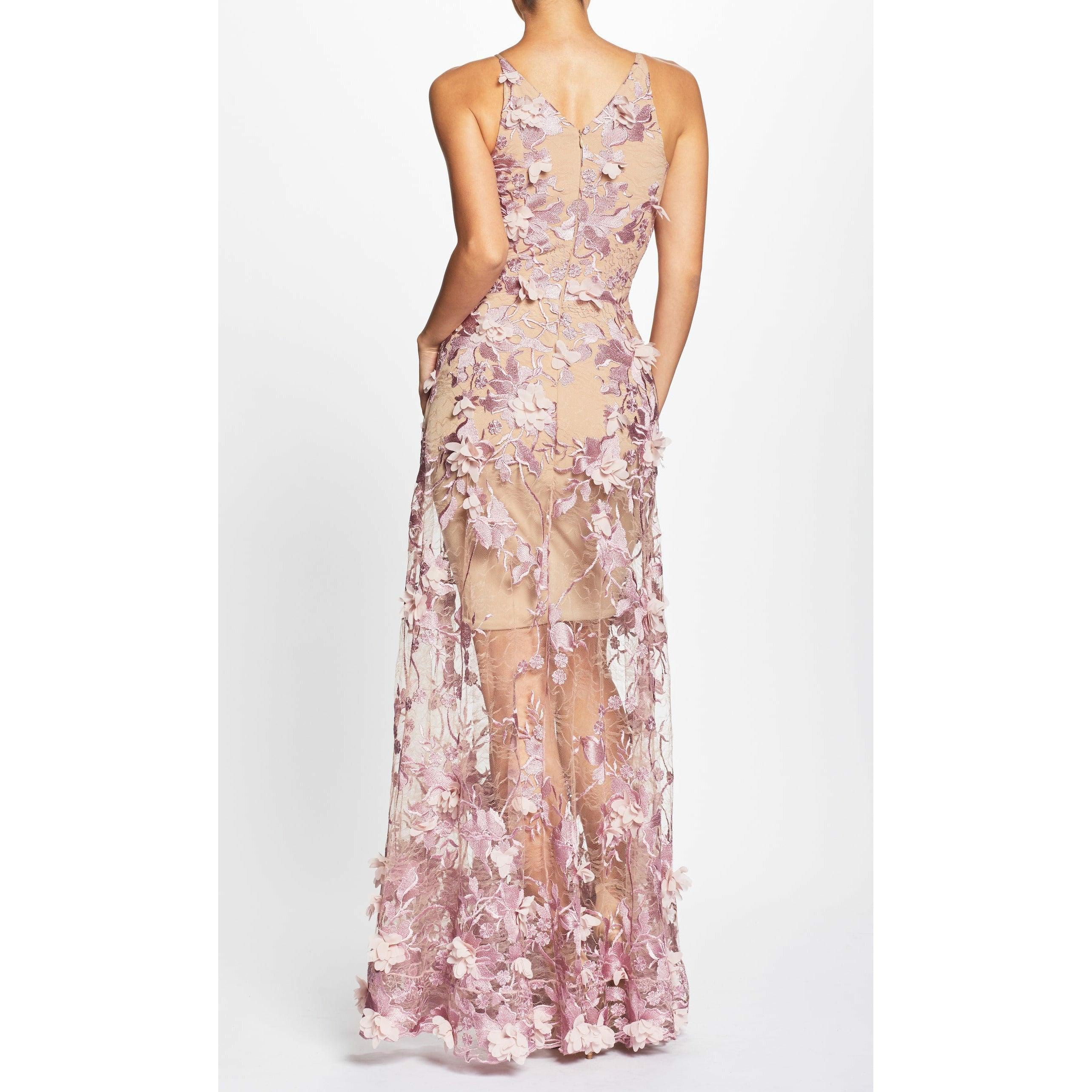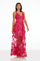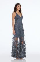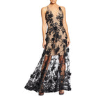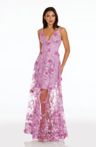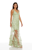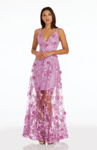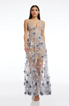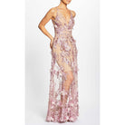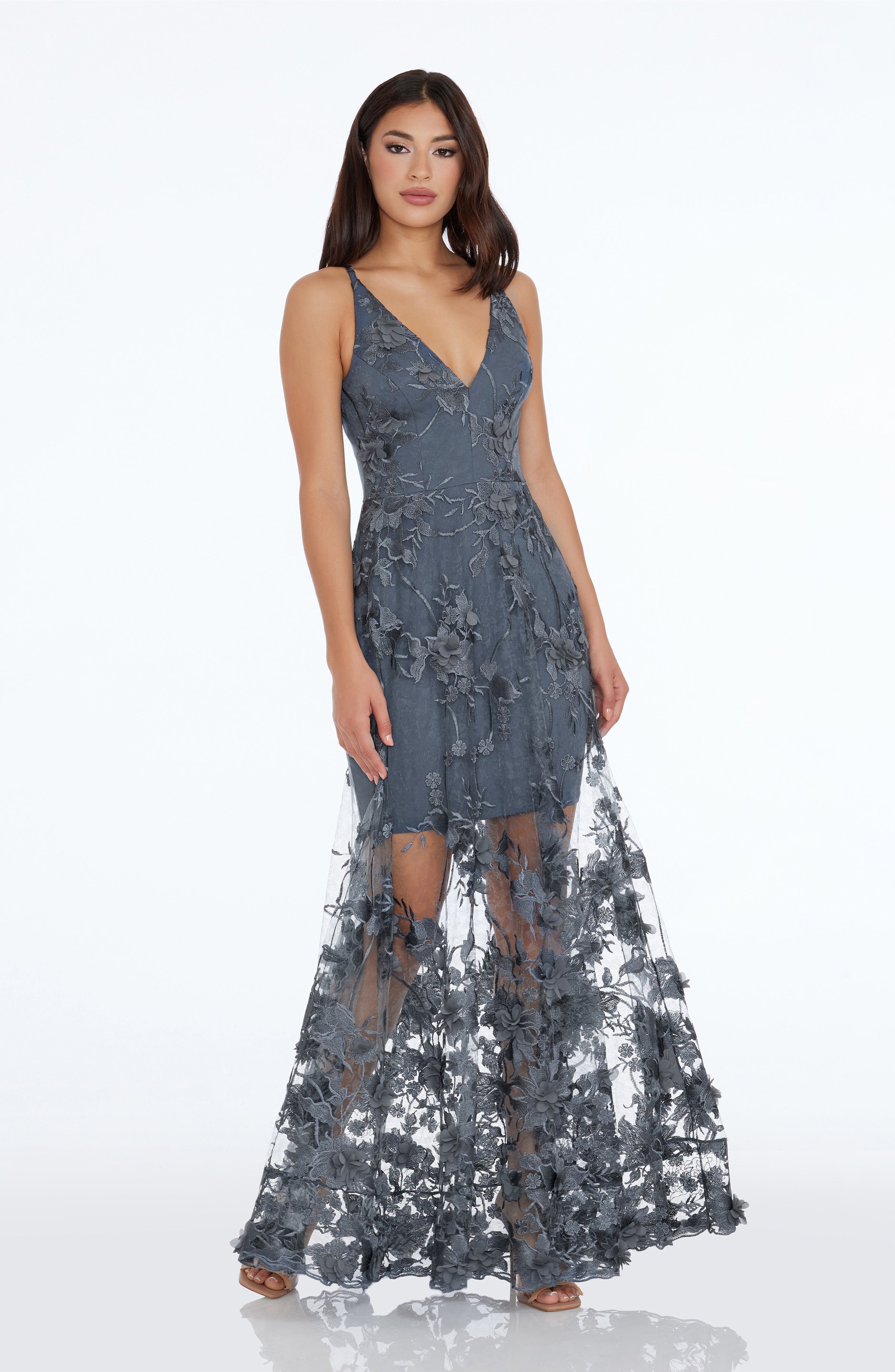 Fluttery appliqués create a lovely 3D effect on a sleeveless A-line gown featuring a plunging décolleté neckline and a sweeping peekaboo skirt. This ethereal dress is light weight with a soft nude underlay that will hug your curves.