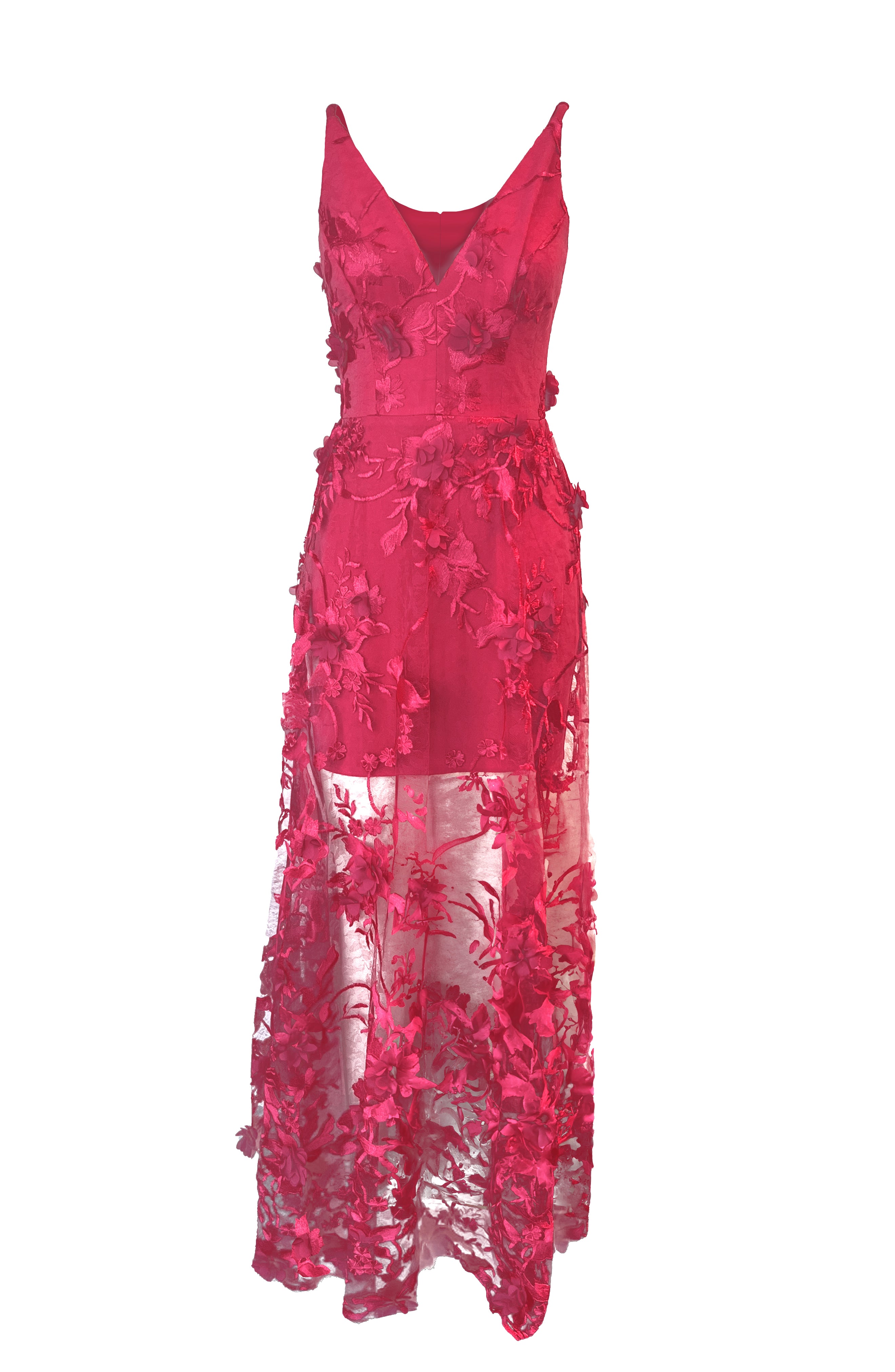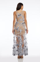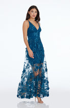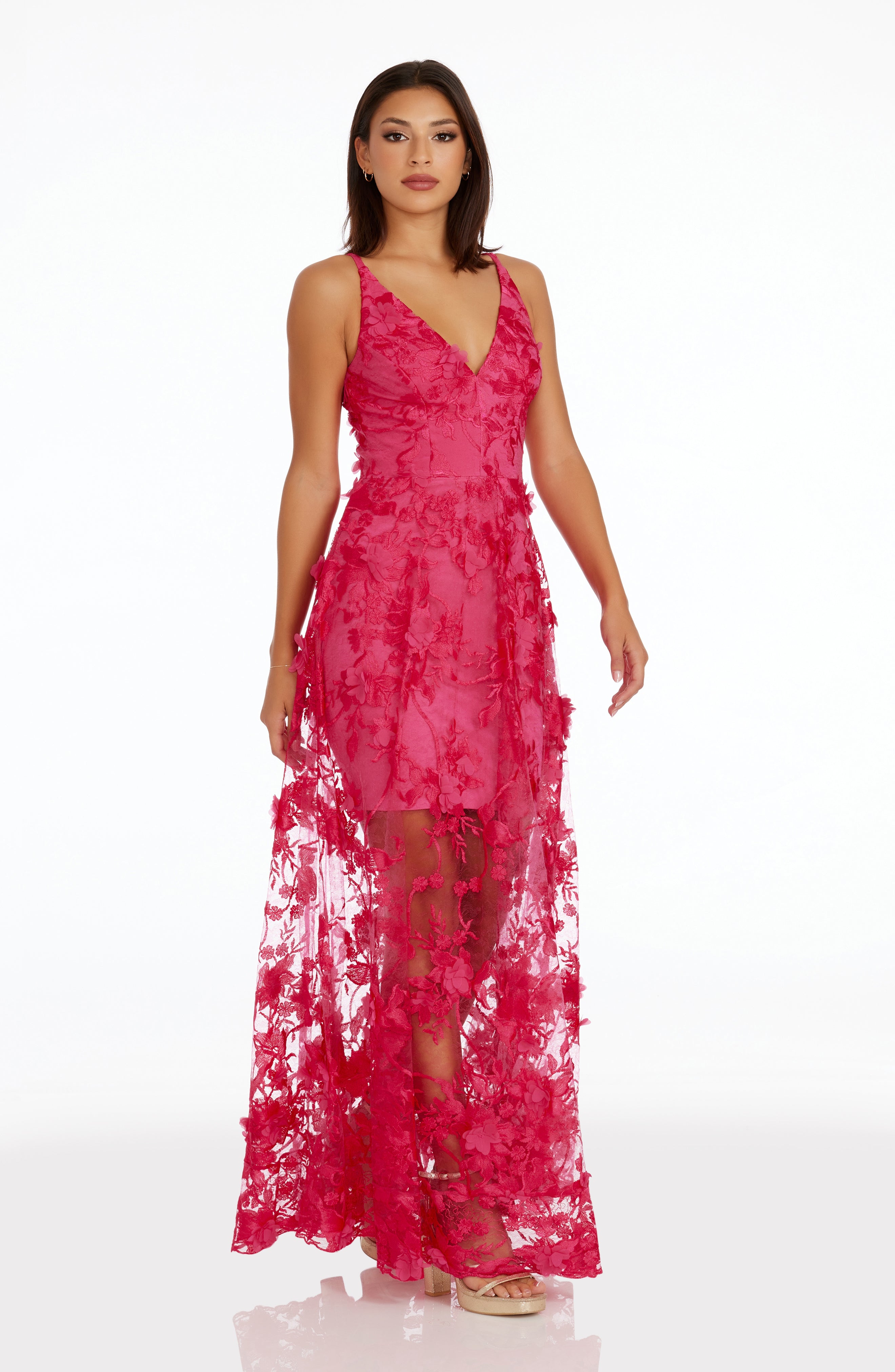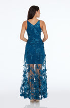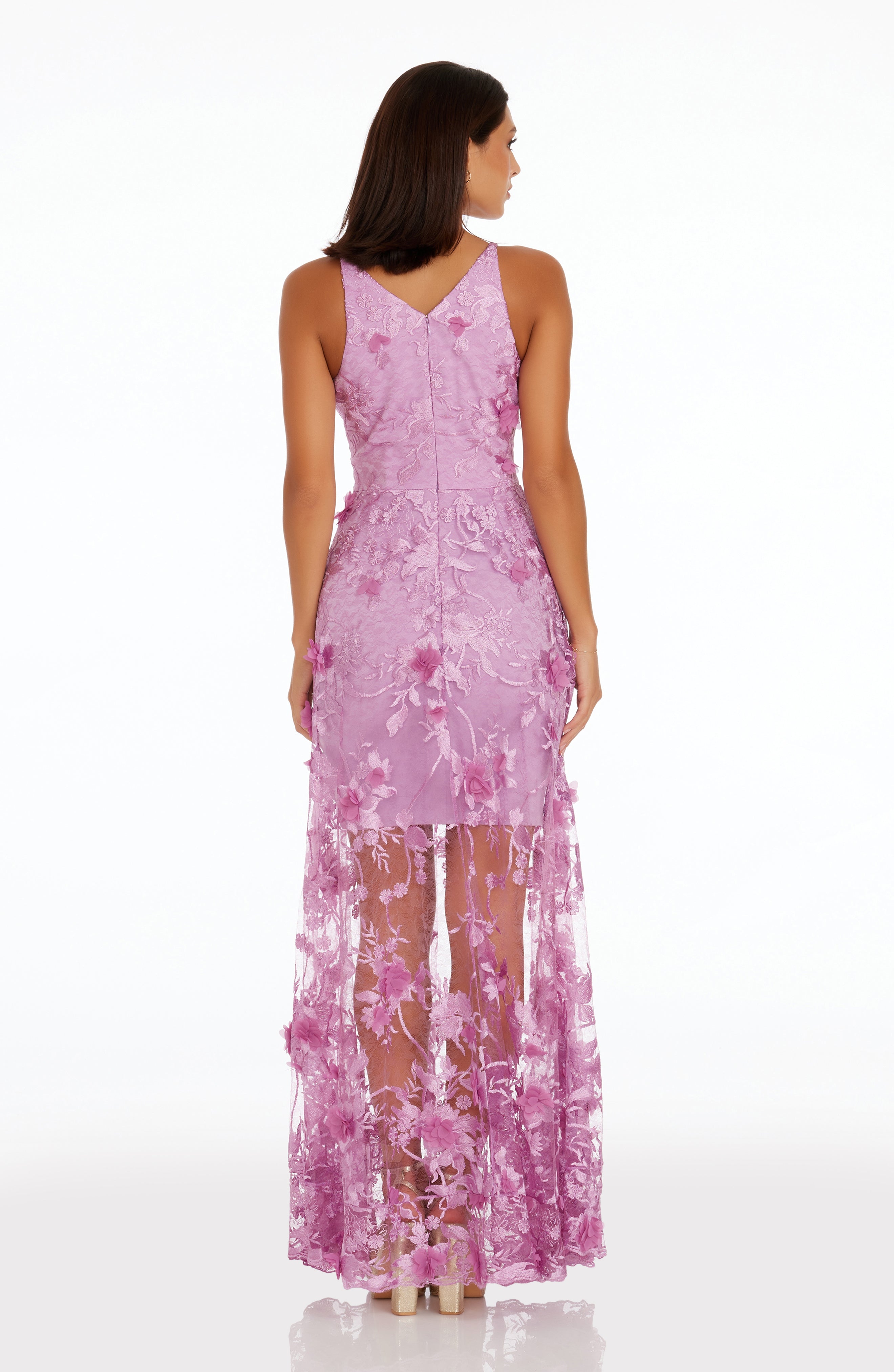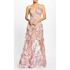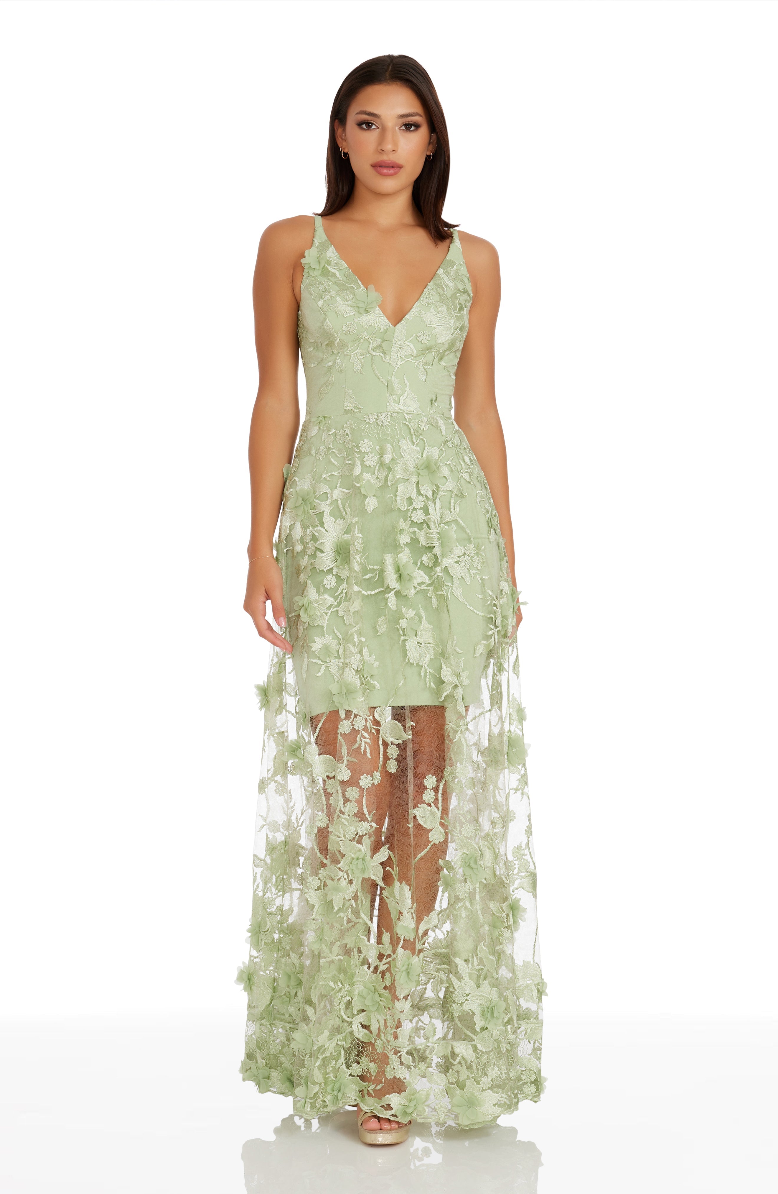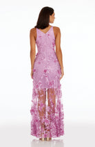 Fluttery appliqués create a lovely 3D effect on a sleeveless A-line gown featuring a plunging décolleté neckline and a sweeping peekaboo skirt. This ethereal dress is light weight with a soft nude underlay that will hug your curves.