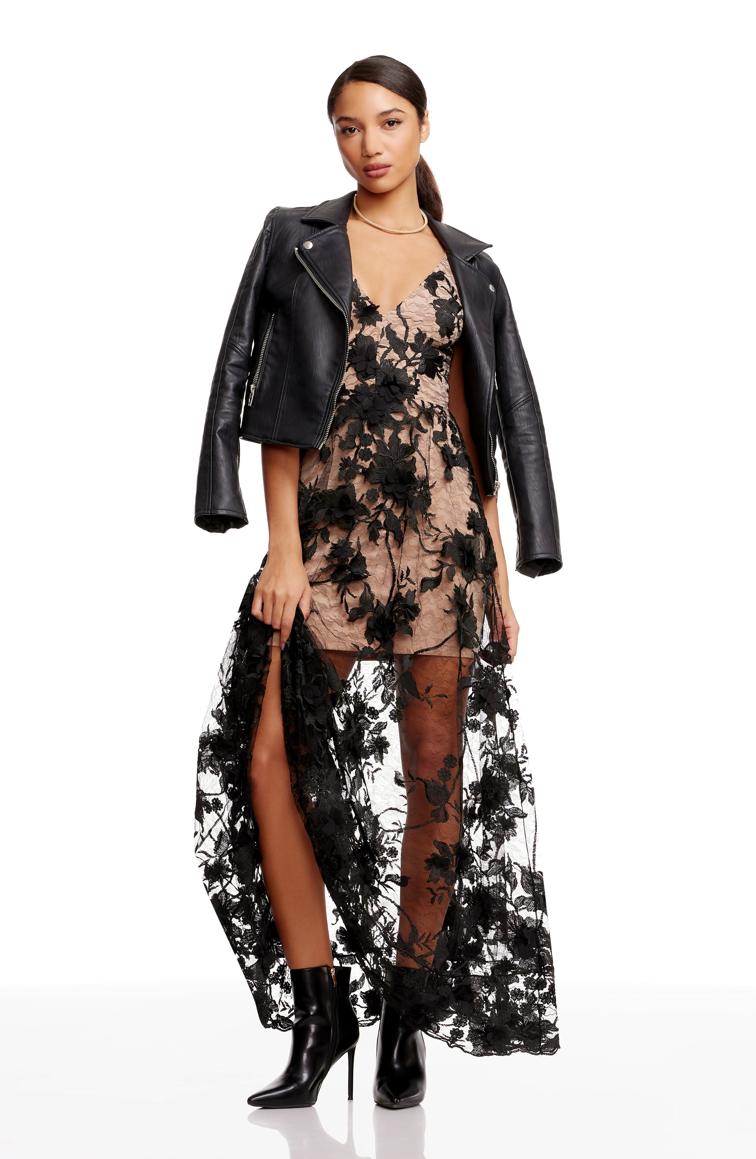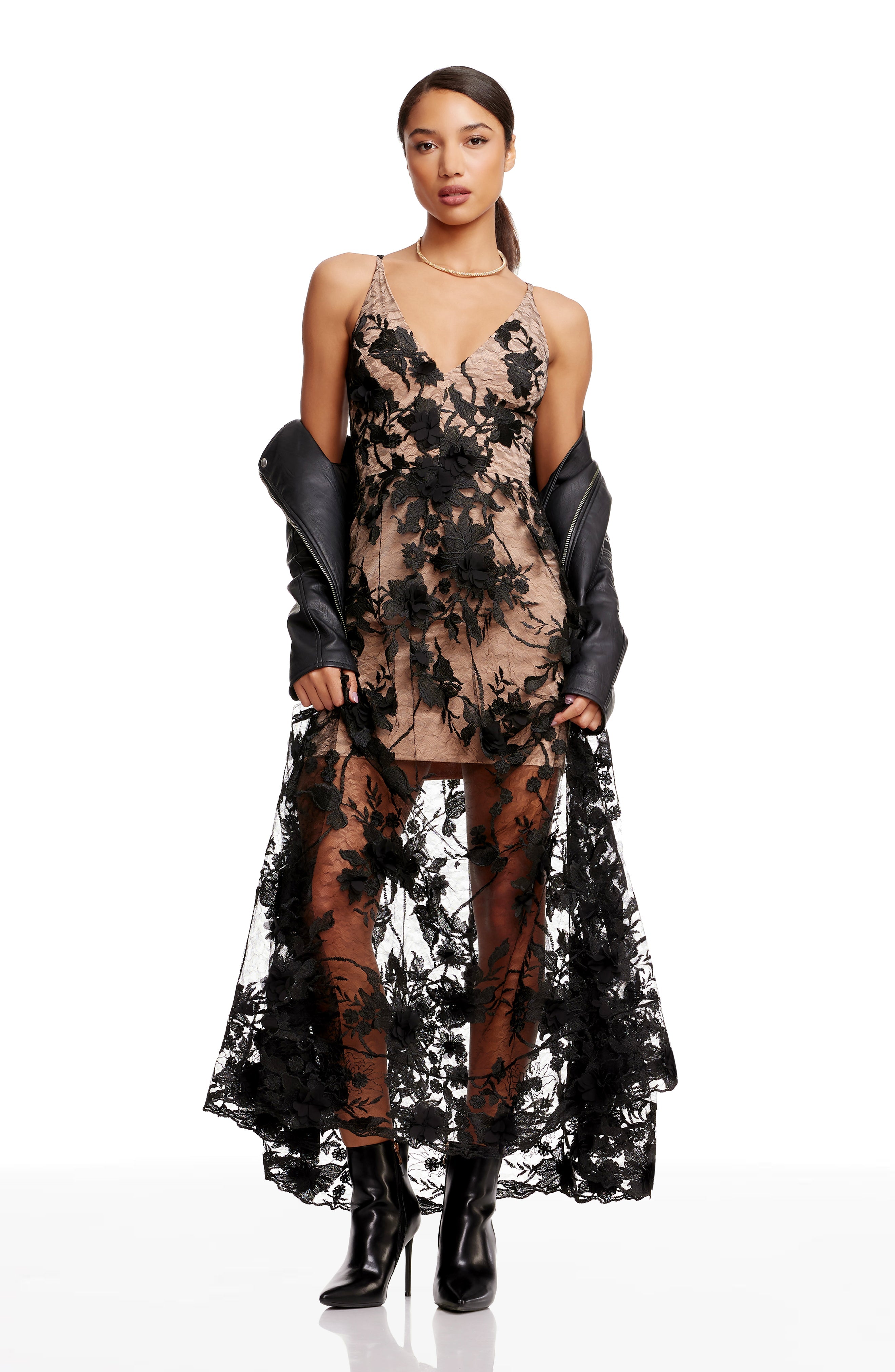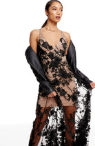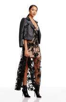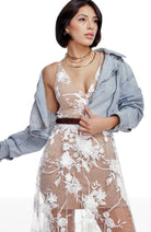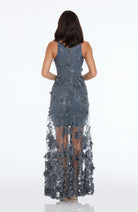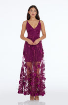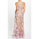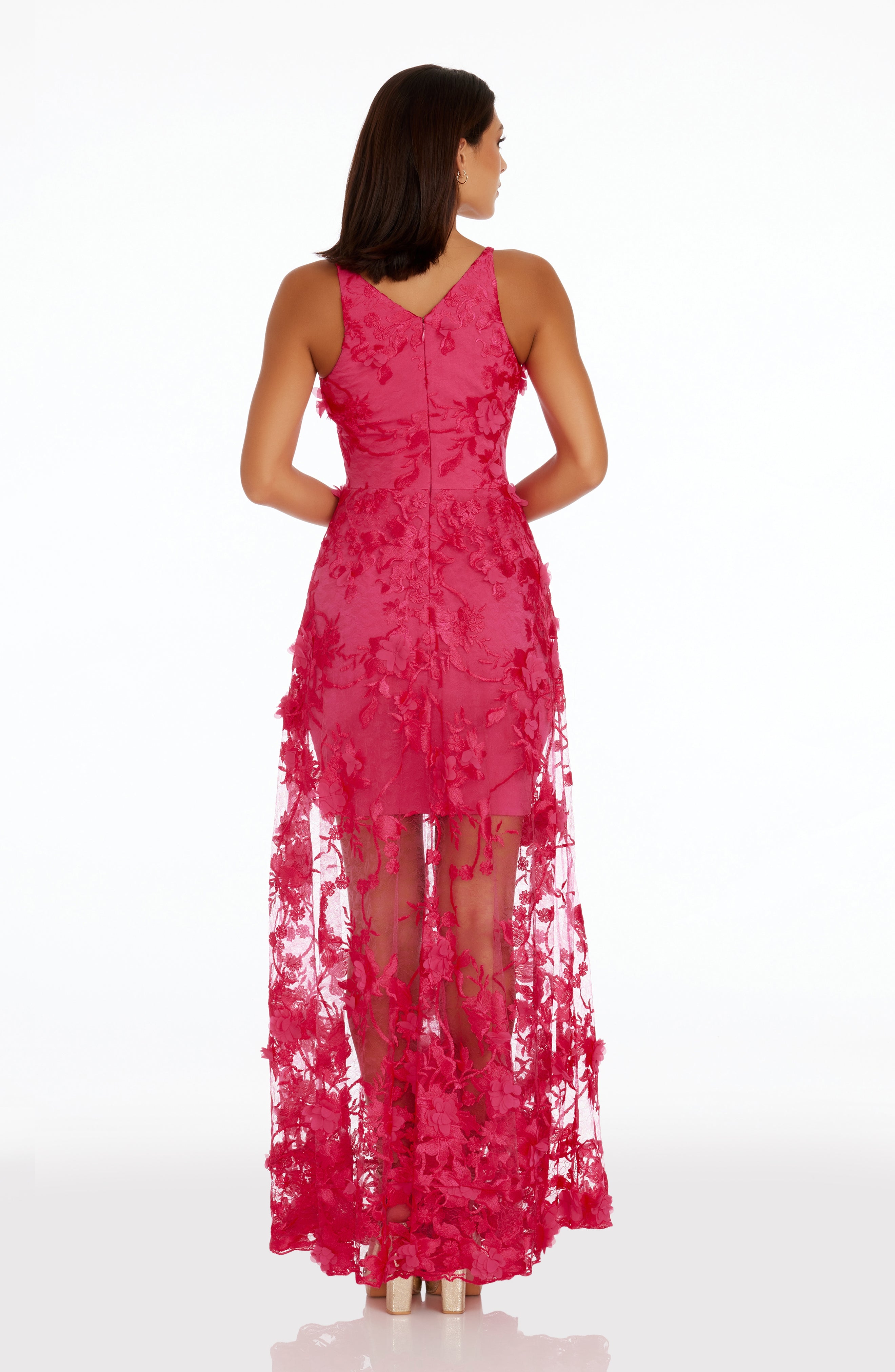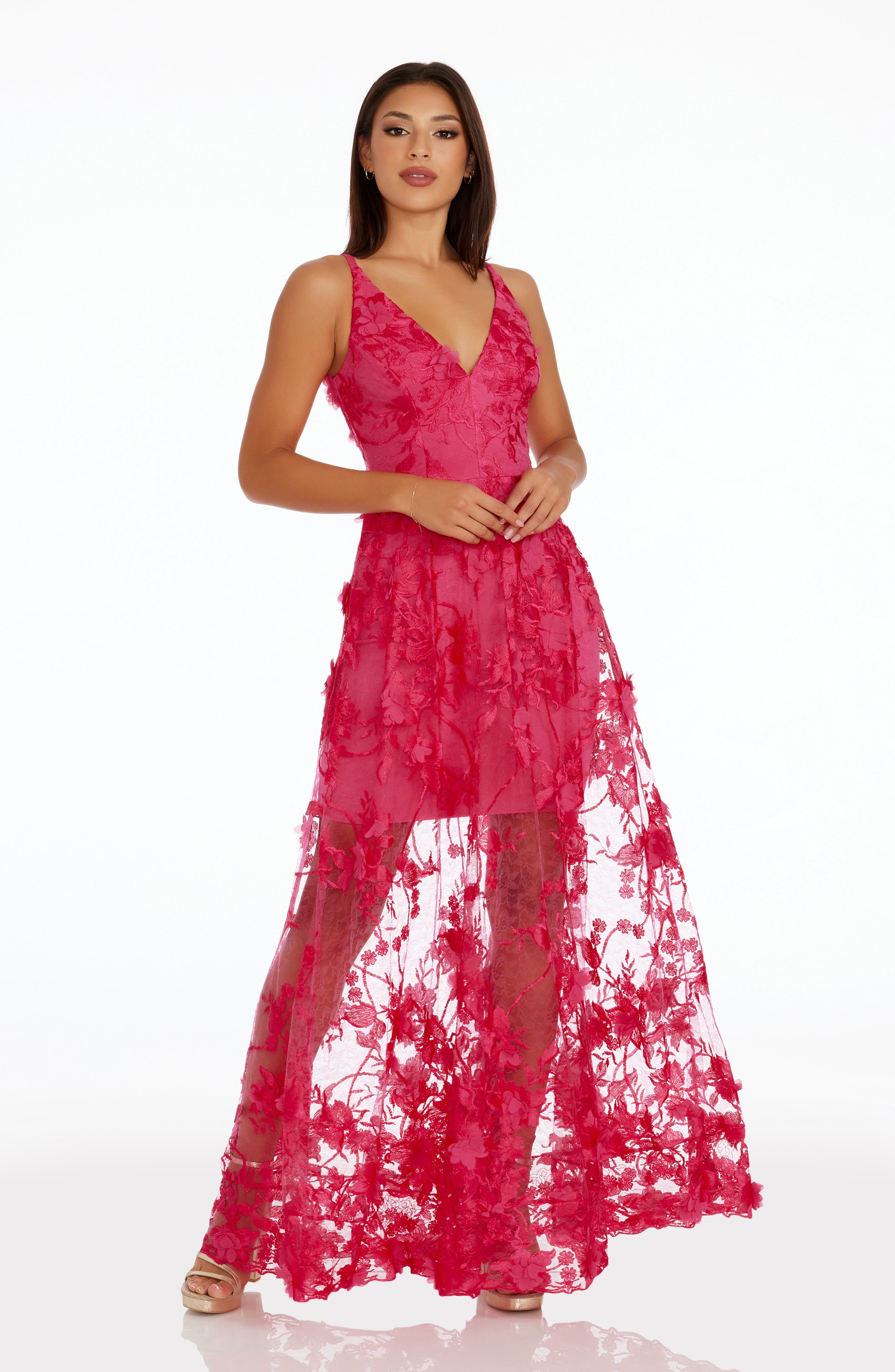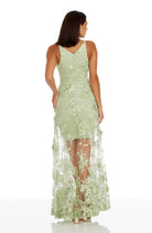 Fluttery appliqués create a lovely 3D effect on a sleeveless A-line gown featuring a plunging décolleté neckline and a sweeping peekaboo skirt. This ethereal dress is light weight with a soft nude underlay that will hug your curves.