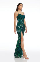 You'll feel sophisticated and confident in this gorgeous sweetheart mermaid gown, with a thigh-high front slit and fun flora sequin pattern. Tori is fully-lined with a body-con silhouette and moderate stretch.