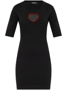 Featuring a flattering crew neckline and 3/4 sleeves, this mini dress showcases a distinctive heart motif with red detailing that adds a playful yet sophisticated touch.