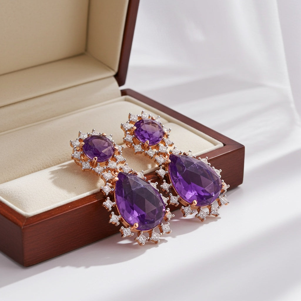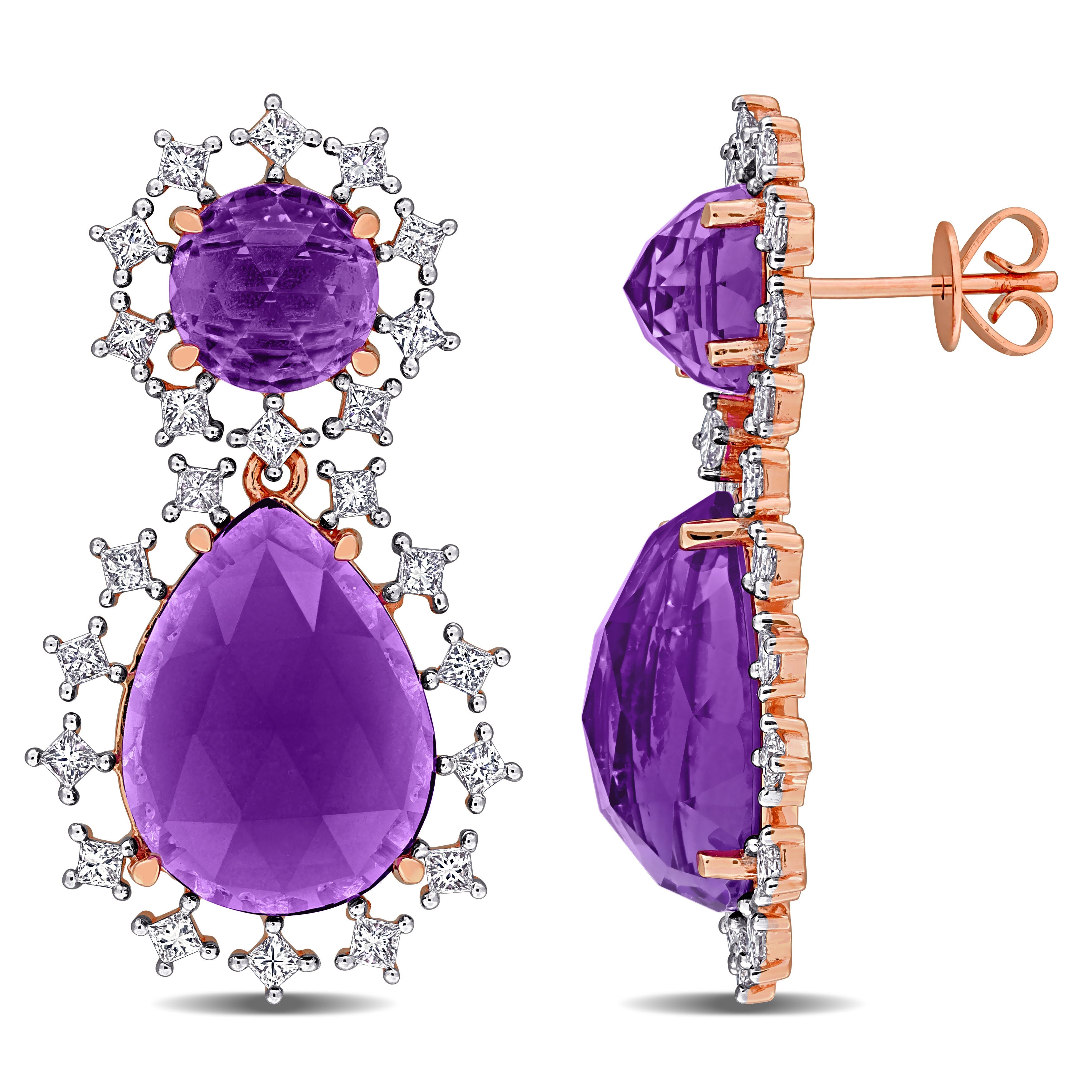 Embrace elegance and grace with these exquisite drop earrings, featuring a harmonious blend of pear and round rose-shaped amethysts, radiating with soft lavender hues. Each gemstone is meticulously set in warm 10K rose gold, enhancing their vibrant color with a romantic glow. The addition of princess-cut diamonds adds a brilliant contrast, their precision-cut facets sparkling with every movement, creating a dazzling effect.