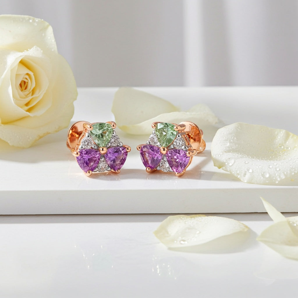 Multicolor Sapphire & Diamond Cluster Stud Earrings 14k Rose Gold