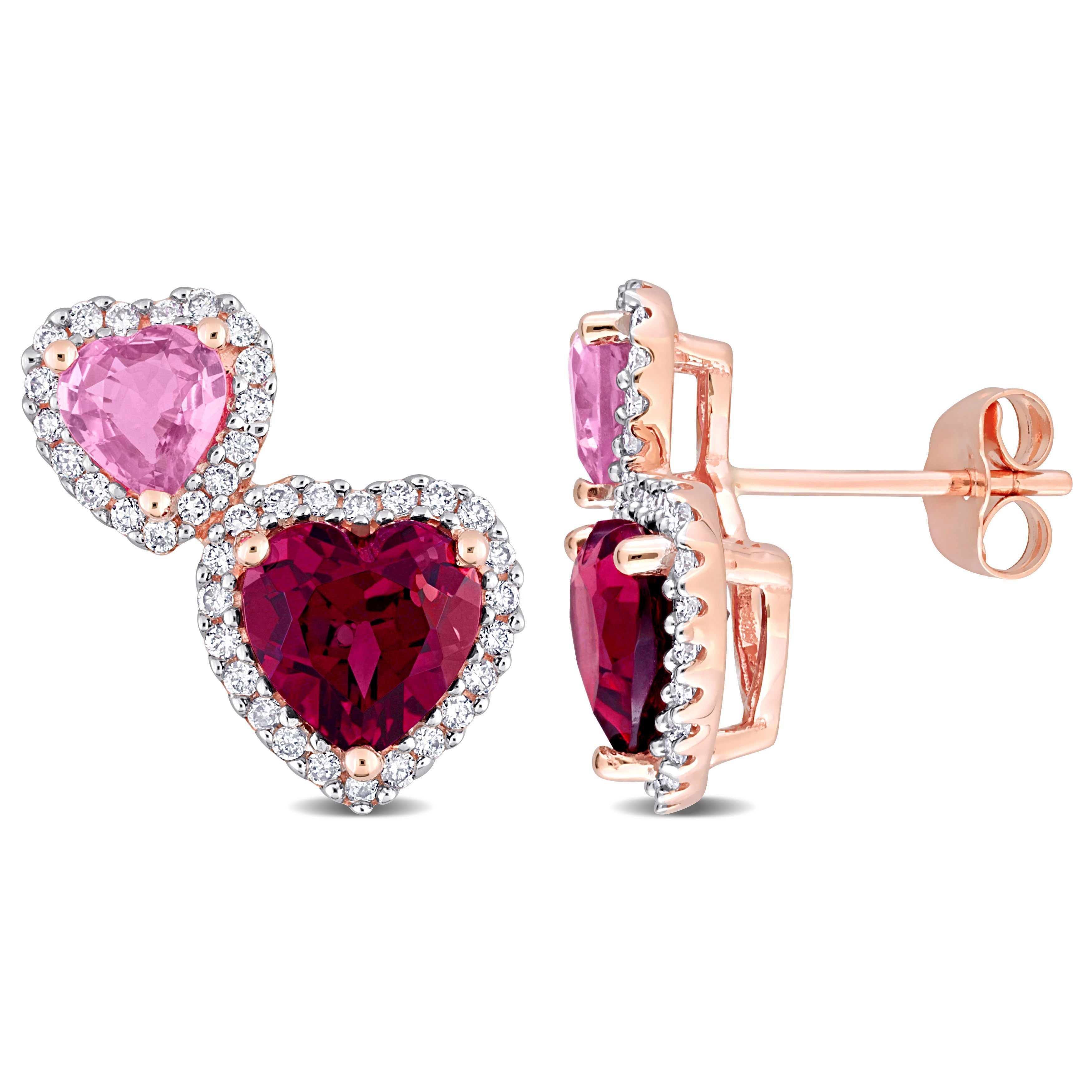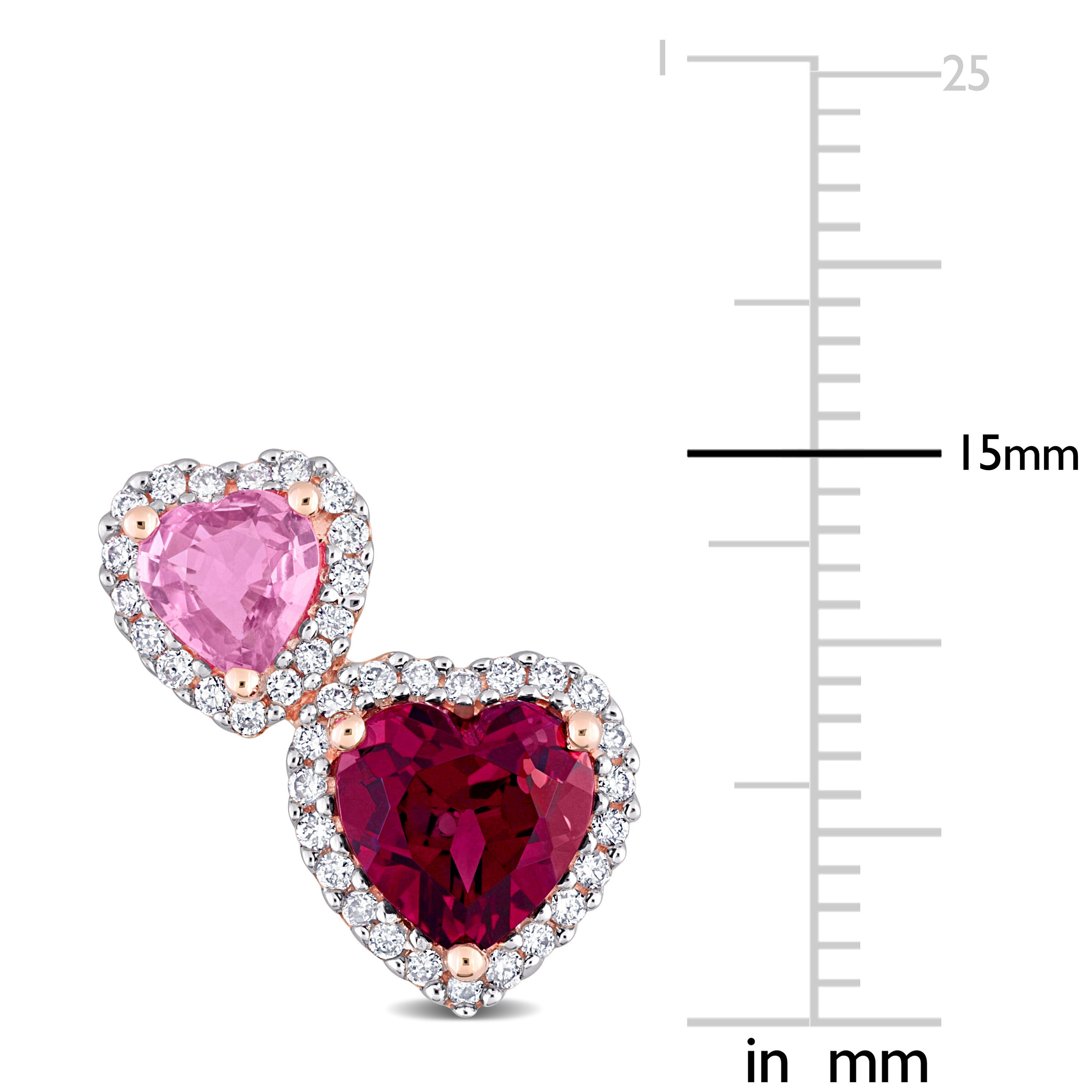 Rhodolite & Pink Sapphire & Diamond Heart 2-Stone Earrings in 14k Rose Gold