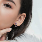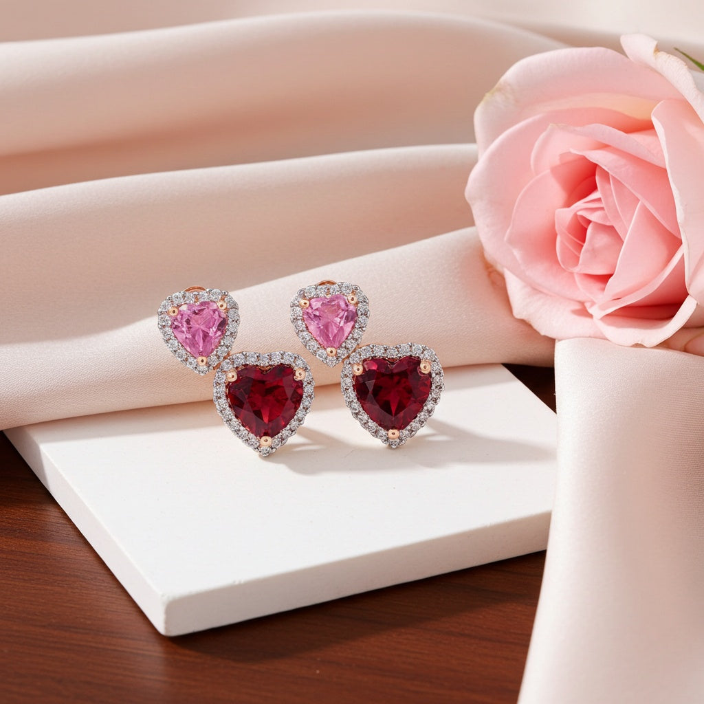 Celebrate romance and elegance with these stunning Rhodolite and Pink Sapphire 2-Stone Heart Earrings, exquisitely crafted in 14k rose gold. Each earring showcases two radiant heart-cut gemstones, a deep, captivating rhodolite and a soft, feminine pink sapphire nestled side by side in a harmonious embrace of color and brilliance. Encircling the gemstones is a shimmering diamond halo, adding a dazzling frame that enhances their natural beauty. The warm glow of rose gold perfectly complements the vivid hues, making these earrings a timeless expression of love and sophistication.