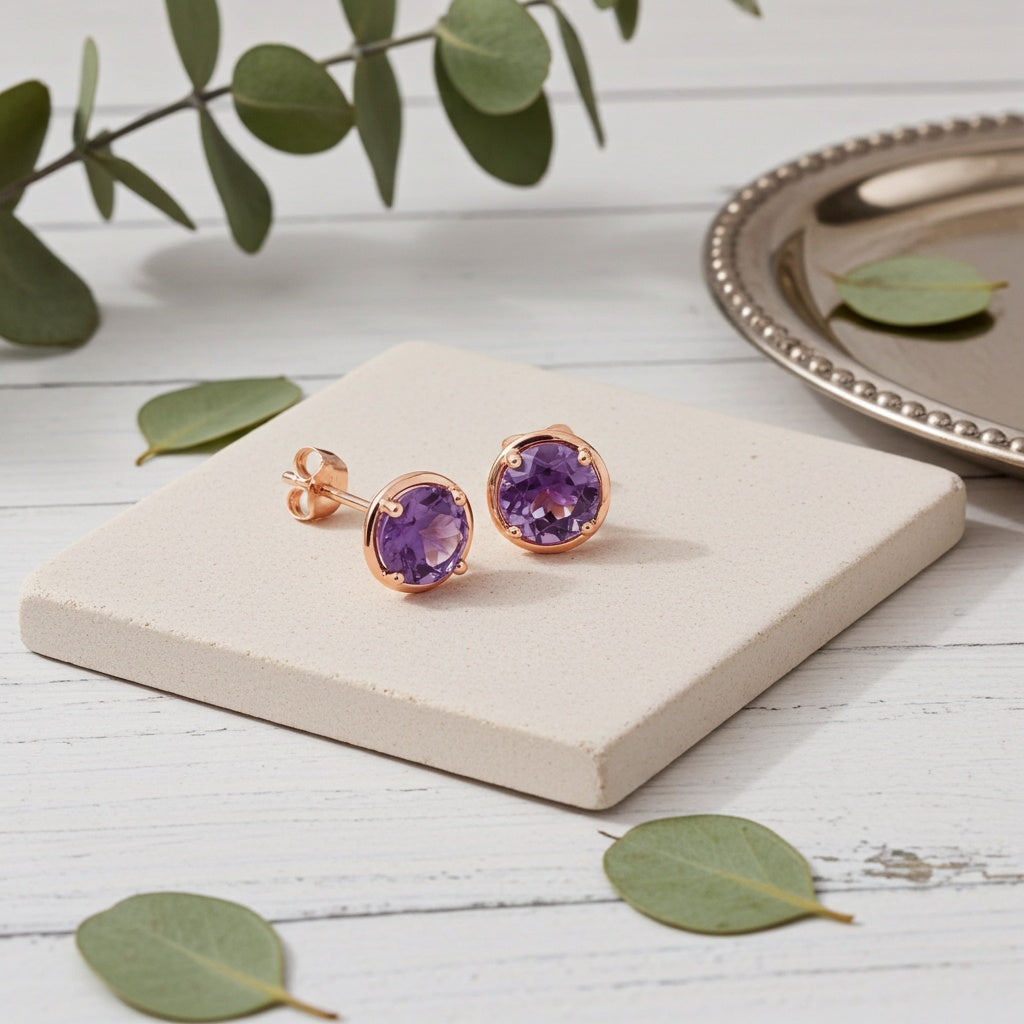 Round Amethyst Stud Earrings in 14k Rose Gold