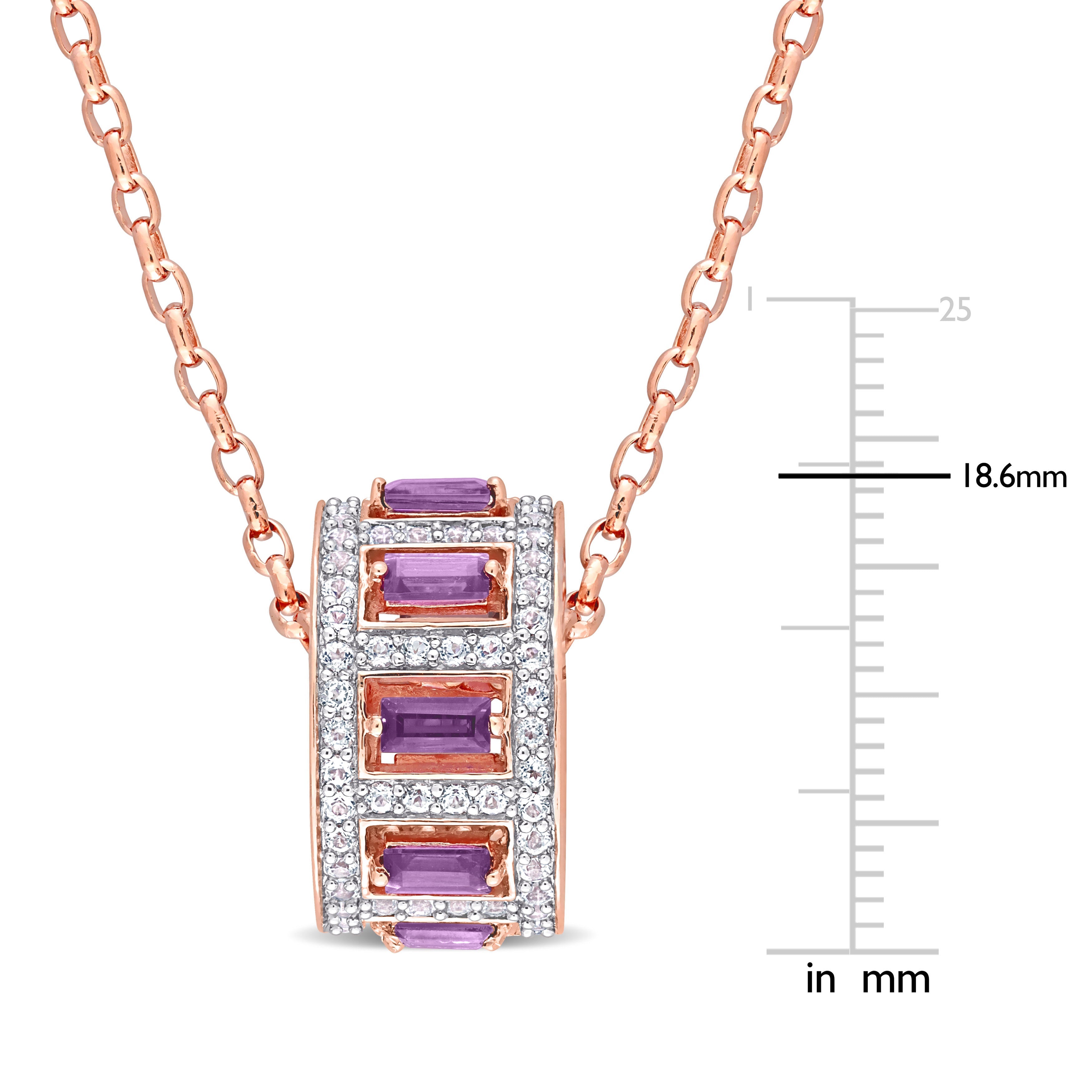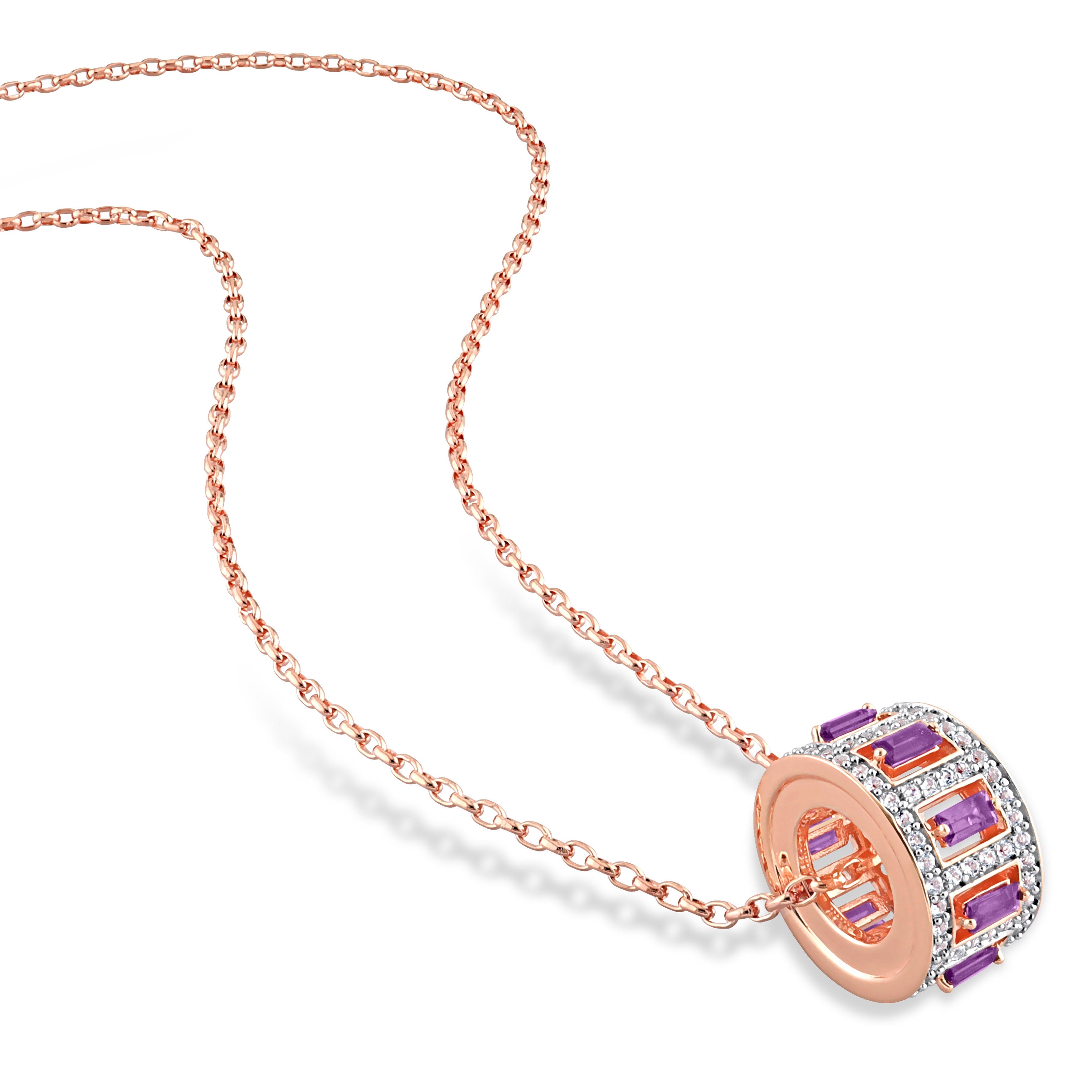 This lovely necklace is crafted in lustrous rose-plated sterling silver and features nine baguette-cut, prong-set amethyst gemstones alternating with round-cut, pave-set white topaz gemstones studded at both the edges. Suspended on 18-inch rolo chain and secures with a lobster clasp. This flickering and timeless necklace is sure to add a burst of color and class to any occasion.