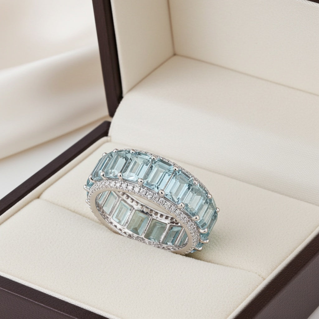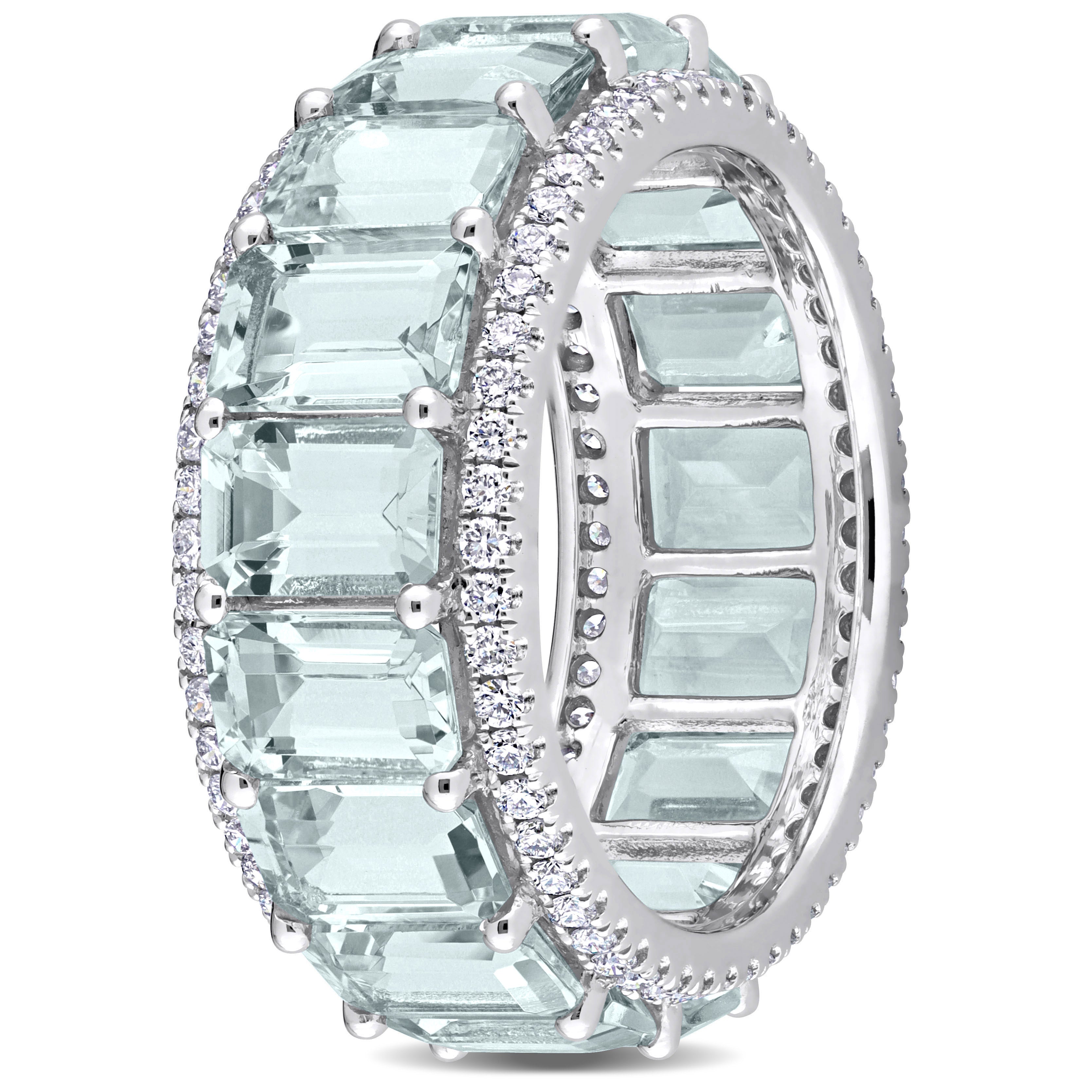 This shimmering eternity ring is crafted in 14-karat white gold. This luxurious anniversary style wedding band features octagon-cut aquamarine gemstones along with round-cut sparkling diamonds in a unique three-row eternity design. This bold eternity band is sure to add elegance to any ensemble. Enhanced with a high polish finish, this extraordinary gemstone and diamond ring will make a standout addition to any jewelry collection.