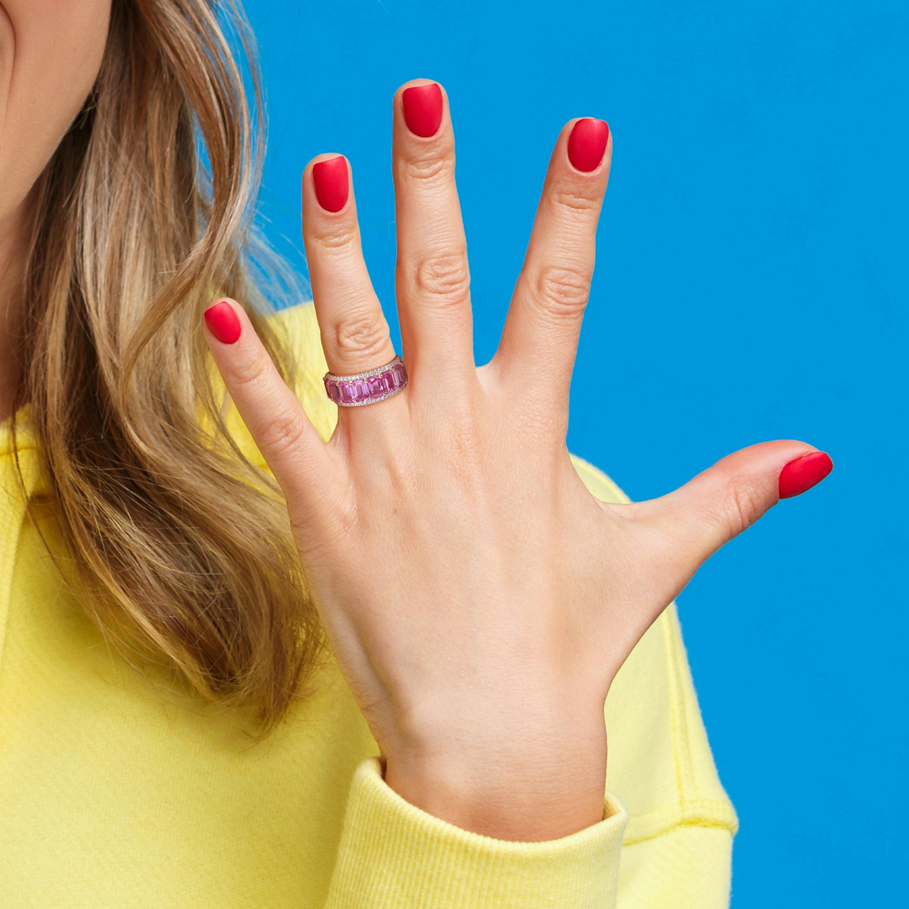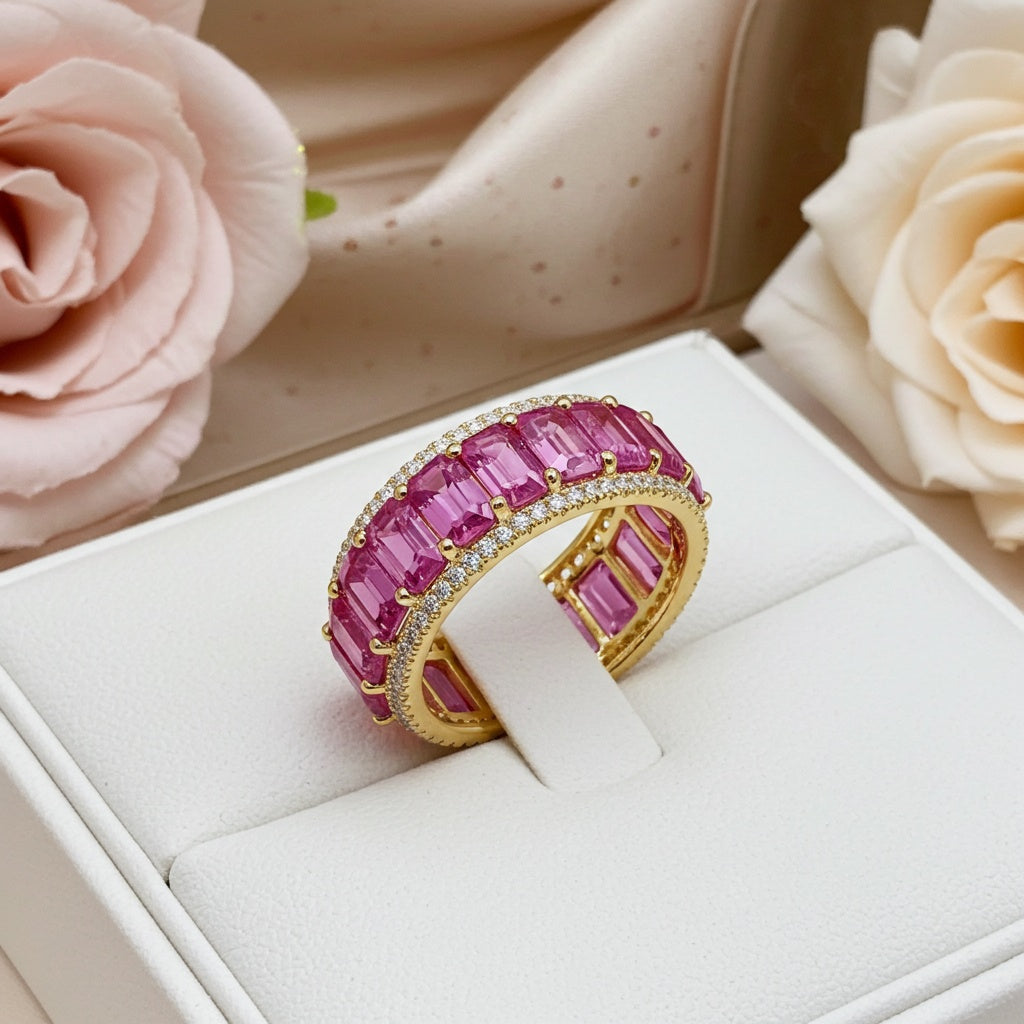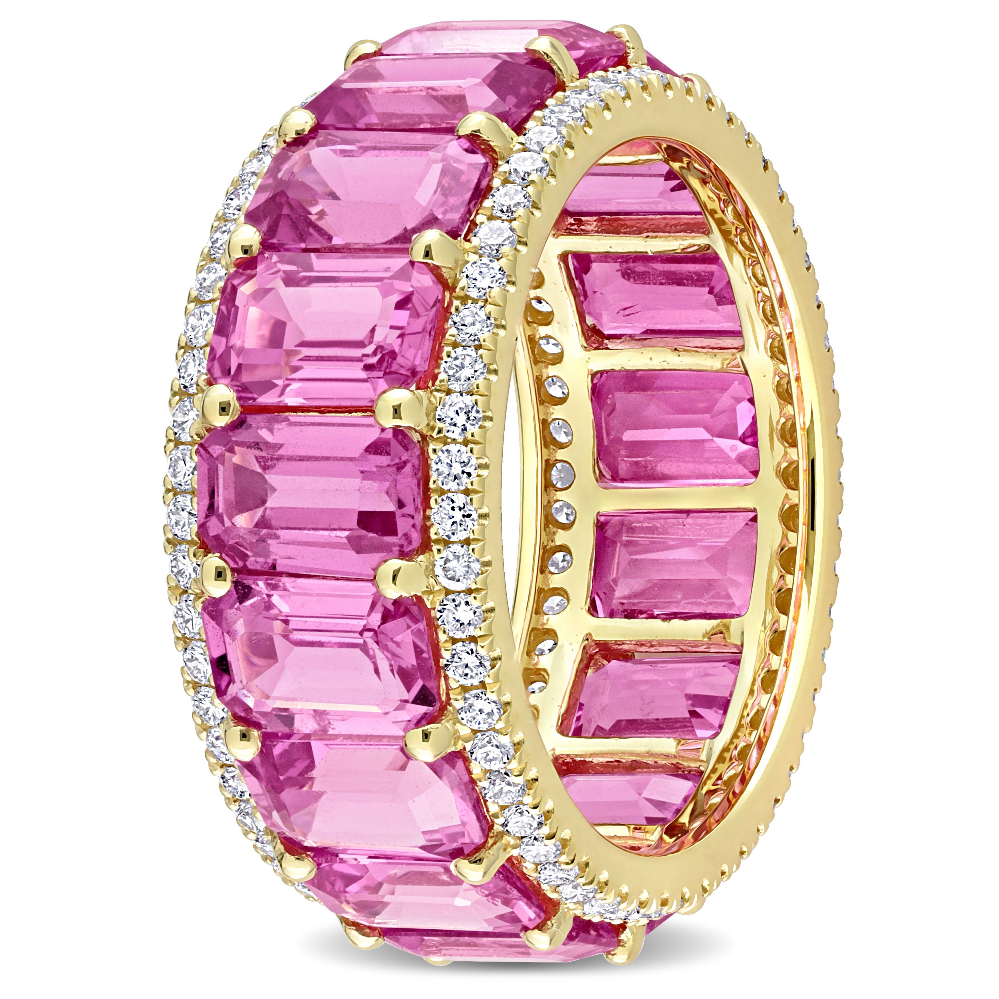 This shimmering eternity ring is crafted in 14-karat yellow gold. This luxurious anniversary style wedding band features octagon-cut pink sapphire gemstones along with round-cut sparkling diamonds in a unique three-row eternity design. This bold eternity band is sure to add elegance to any ensemble. Enhanced with a high polish finish, this extraordinary gemstone and diamond ring will make a standout addition to any jewelry collection.