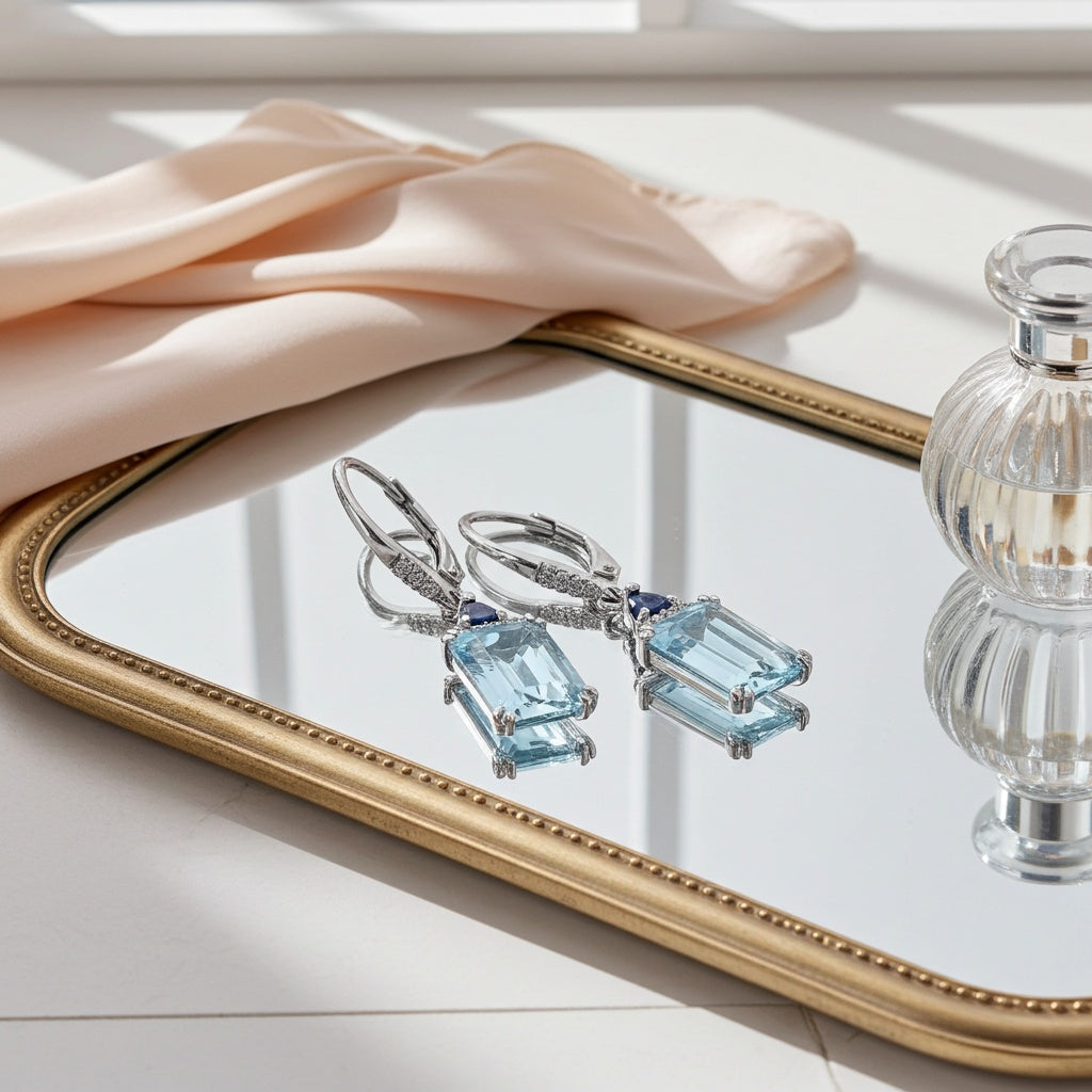 Enhance your elegance with these Dangle Leverback Earrings in Sterling Silver. These exquisite earrings showcase a combination of vivid blue sapphires and tranquil aquamarines, accented by dazzling diamonds. The leverback design ensures secure and comfortable wear, making these earrings a stunning addition to your jewelry collection.