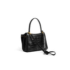 Introducing the Balenciaga Rodeo Small Bag, a sophisticated statement piece crafted from luxurious 100% calfskin leather with an exquisite textured finish. This structured satchel features elegant gold-tone hardware, including a distinctive turn-lock closure and a gracefully curved top handle for effortless carrying.
