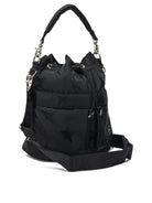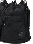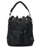 PORTER YOSHIDA "FLAG" CROSSBODY BAG MADE OF SHINY, TIGHTLY WOVEN NYLON JACQUARD FABRIC LAMINATED WITH COTTON FOR A SOFT, LIGHTWEIGHT TEXTURE. THE COMPACT SILHOUETTE FEATURES AN ADJUSTABLE AND REMOVABLE SHOULDER STRAP, AND A DETACHABLE HANDLE FOR DUAL USE. THE PORTER LOGO AND STAR PATTERN ARE INTEGRATED INTO THE SURFACE, CREATING A THREE-DIMENSIONAL EFFECT ACCORDING TO THE DIRECTION OF LIGHT. THE MAIN COMPARTMENT OPENS SIDEWAYS VIA A ZIPPER.