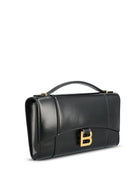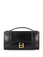 Elevate your evening ensemble with the Balenciaga Hourglass Clutch with Handle. This sophisticated piece features a structured silhouette in luxurious black leather, accented by the iconic gold-tone "B" logo closure that epitomizes the house's refined aesthetic.