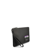 Elevate your everyday essentials with this sophisticated Balenciaga Leather Zipped Pouch, crafted from luxurious calf leather in a timeless black finish. This versatile piece features a convenient wrist strap for hands-free carrying, a secure zip-top closure, and practical card slots on the front for easy access to your most-used items.
