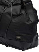 PORTER YOSHIDA "STRING" CROSSBODY BAG WITH COMPACT STRUCTURE AND SOFT SILHOUETTE. MADE OF SHINY NYLON TWILL FABRIC LAMINATED WITH COTTON, WITH EUROPEAN OILED LEATHER DETAILS. THE OPENING FEATURES AN APPLIQUÉD LEATHER DRAWSTRING, WHILE THE ADJUSTABLE SHOULDER STRAP ALLOWS IT TO BE WORN EITHER BY HAND OR OVER THE SHOULDER. THE INTERIOR INCLUDES A SINGLE HANGING POCKET WITH ZIPPER CLOSURE DESIGNED FOR PERSONAL ESSENTIALS.