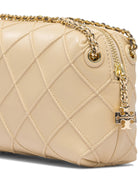 Elevate your everyday style with this exquisite white lamb leather crossbody bag from Tory Burch. Crafted from buttery-soft lamb leather with signature quilted detailing, this luxurious accessory features a sophisticated chain strap that adds a touch of elegance to any ensemble.