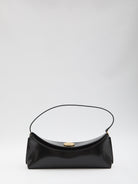 Crafted in elegant black leather with distinctive gold-toned hardware, this clutch features a unique oval-inspired shape that sets it apart from traditional evening bags.