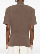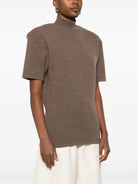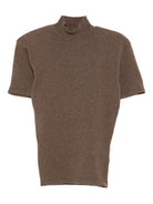 THIS KNITTED TOP WITH SHORT SLEEVES IN A BROWN SHADE IS MADE FROM A SOFT AND LIGHTWEIGHT FABRIC. IT FEATURES A RIBBED TURTLE NECK AND 3/4 SLEEVES. PERFECT FOR A CASUAL AND MODERN LOOK, IT IS IDEAL TO PAIR WITH JEANS OR ELEGANT TROUSERS FOR DIFFERENT OCCASIONS.