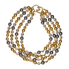 Product Description: Multi colored bead necklace from the Jackie Kennedy collection. The original sold at auction for $17,250. Four rows of satin gold, grey and clear Cultura pearls closed with a double hood clasp.