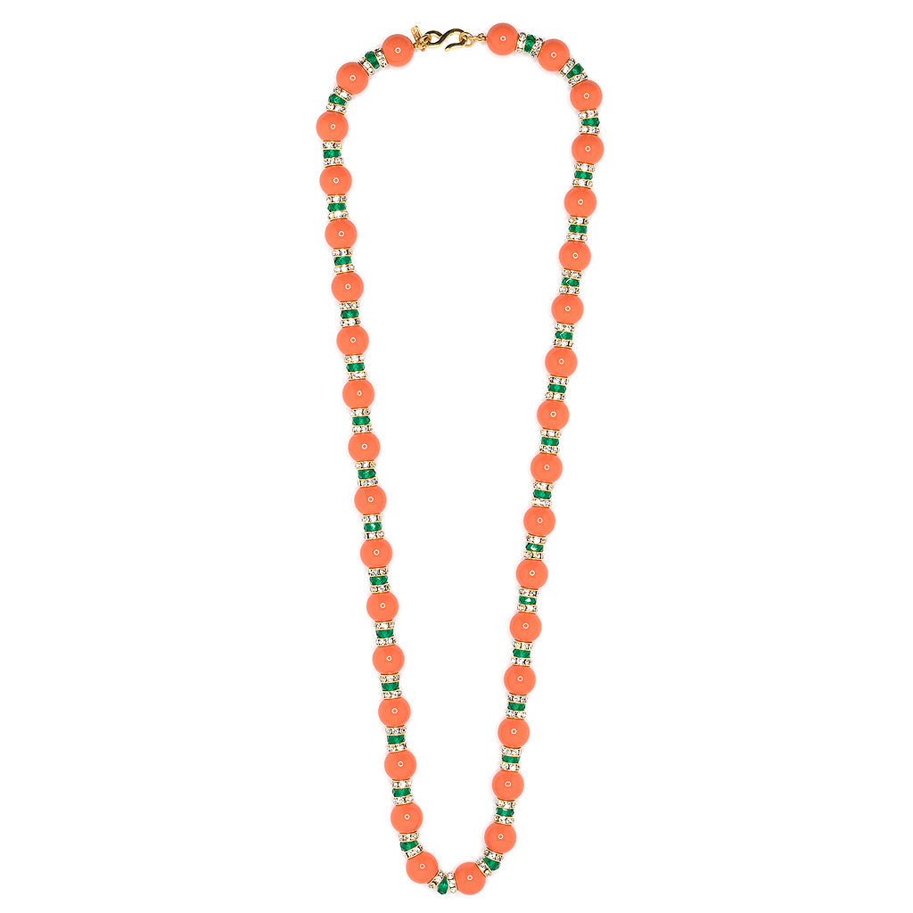 Product Description: Originally worn by the late Vogue editor Diana Vreeland, this coral bead necklace with crystal and emerald rhondells is fit for a modern day fashionista.