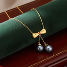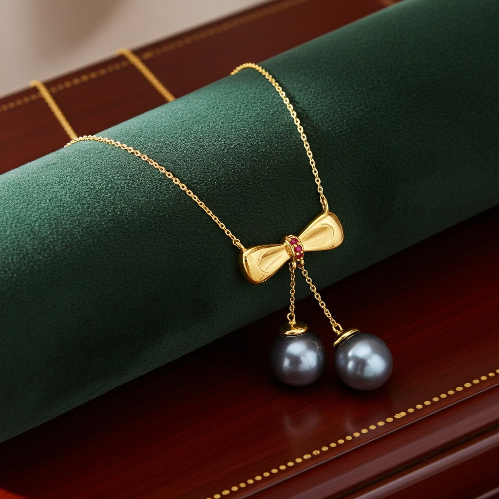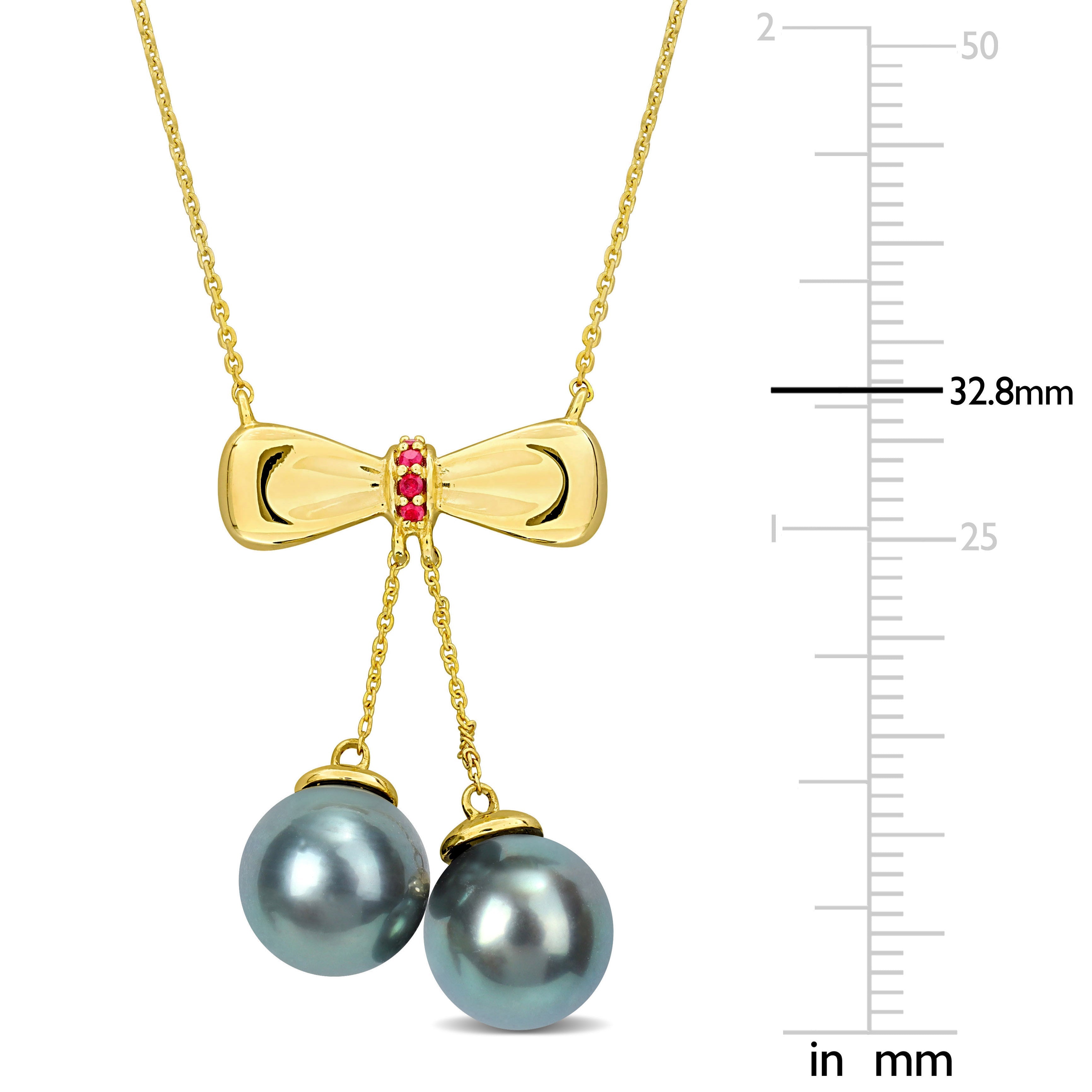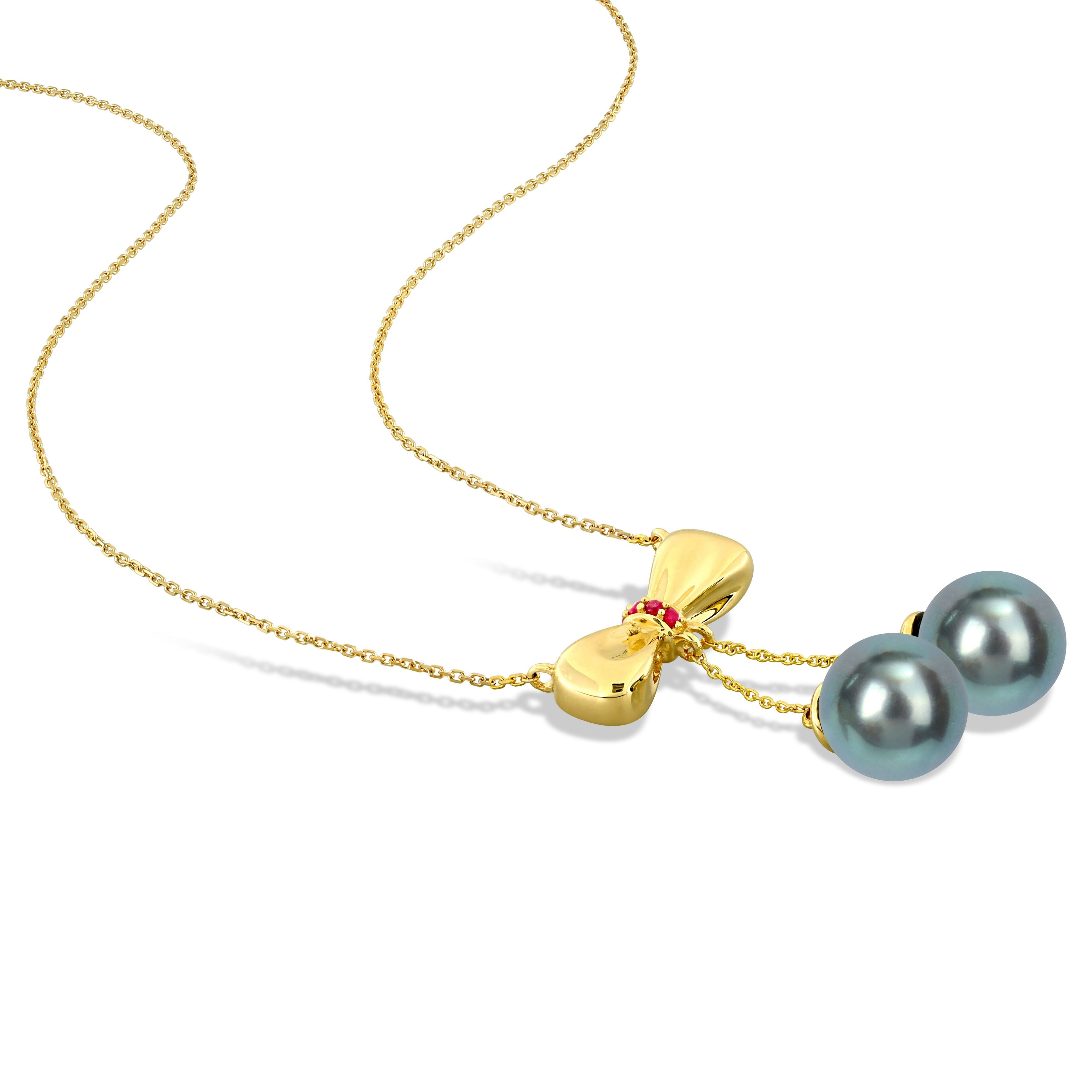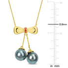 Cultured Tahitian Pearl & Ruby Bow Tie Drop Necklace 10k Yellow Gold