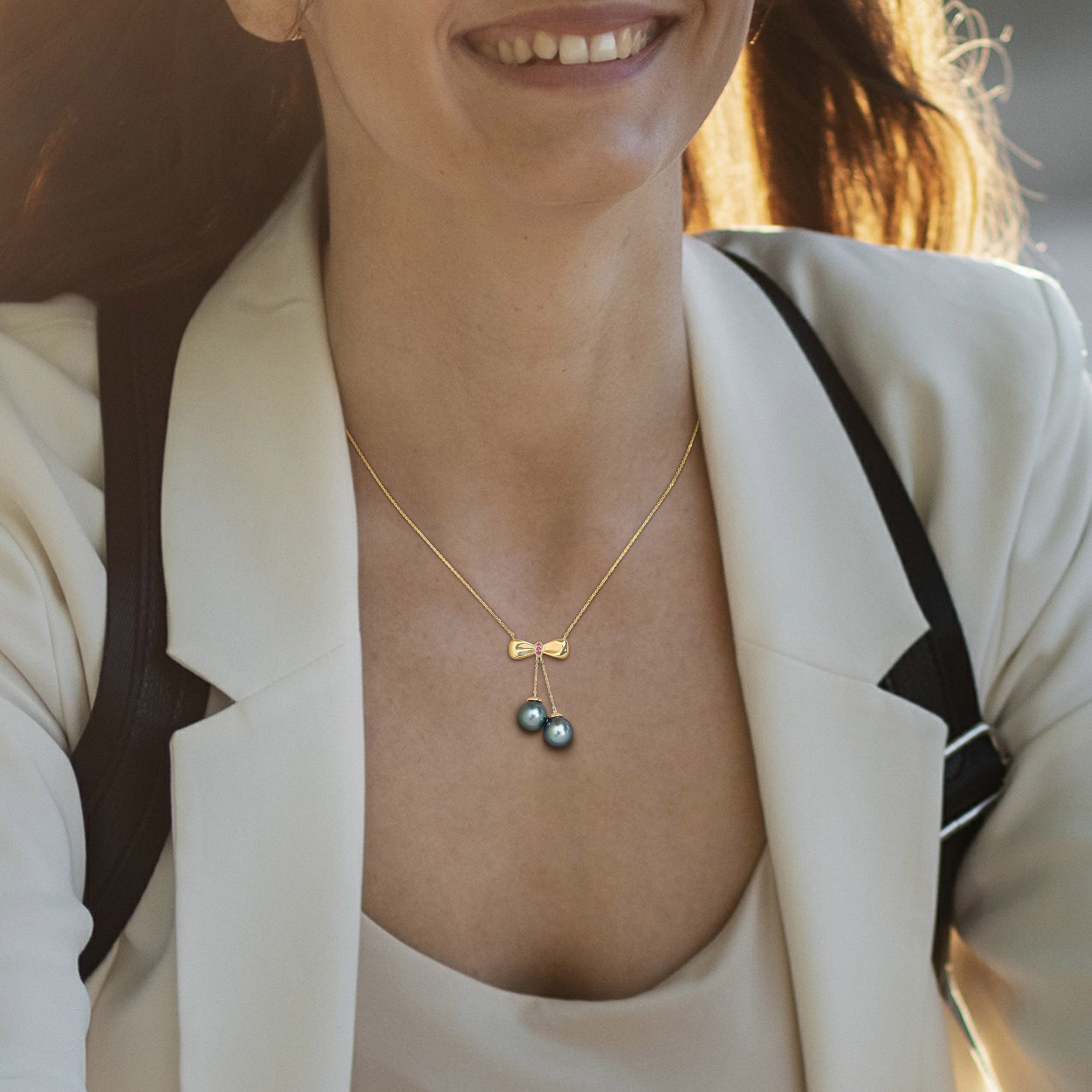 This timeless bow tie drop necklace is crafted in 10k yellow gold and features lustrous cultured Tahitian pearls complemented by vibrant ruby accents. The classic bow tie design beautifully highlights the elegant round pearls, while the delicate rubies add a touch of color and sophistication. With a length of 18 inches, this necklace is suspended from a refined cable chain and secured with a spring ring clasp, making it an effortless addition to any jewelry collection. A perfect balance of charm and elegance, this piece is ideal for elevating any look, from casual to formal occasions.