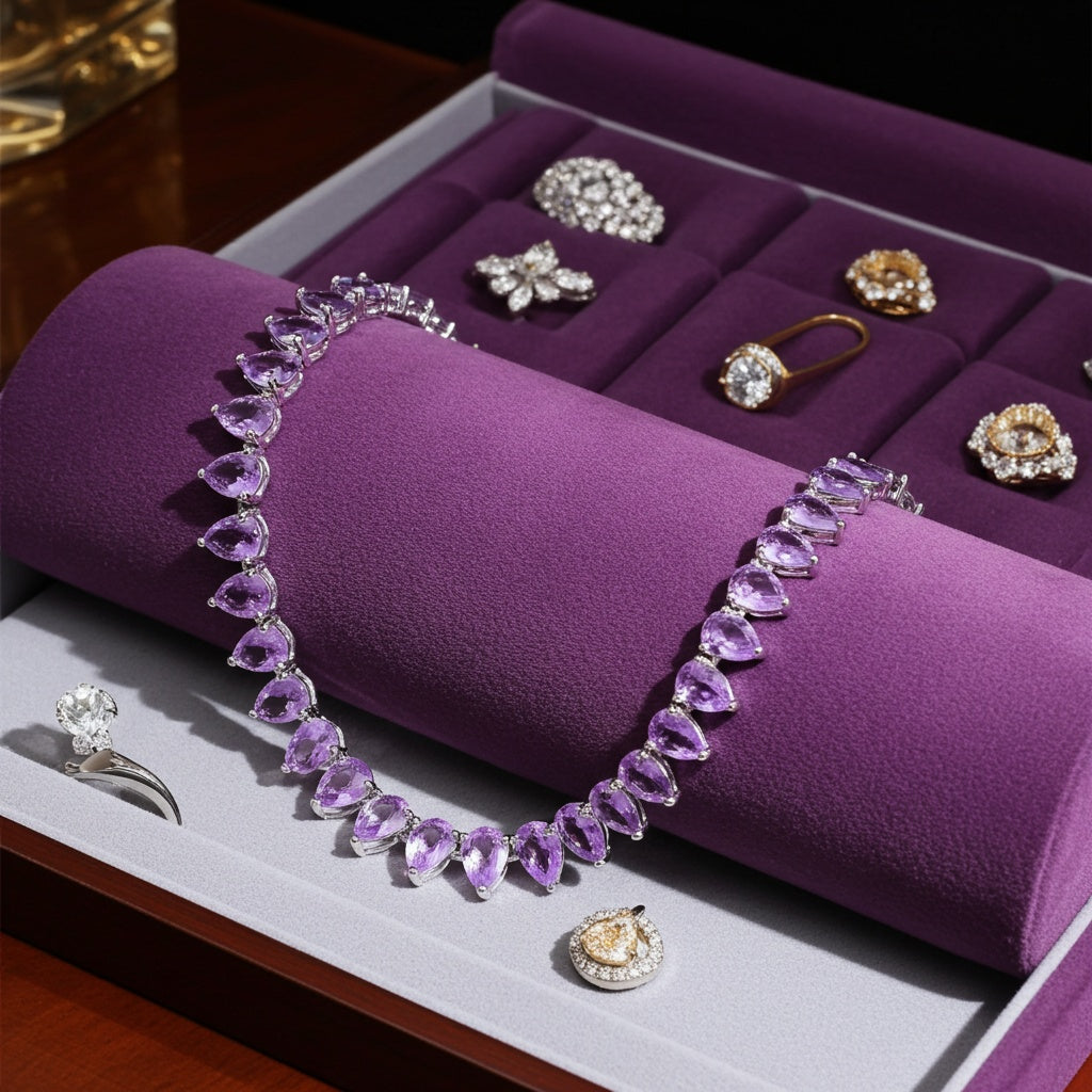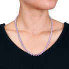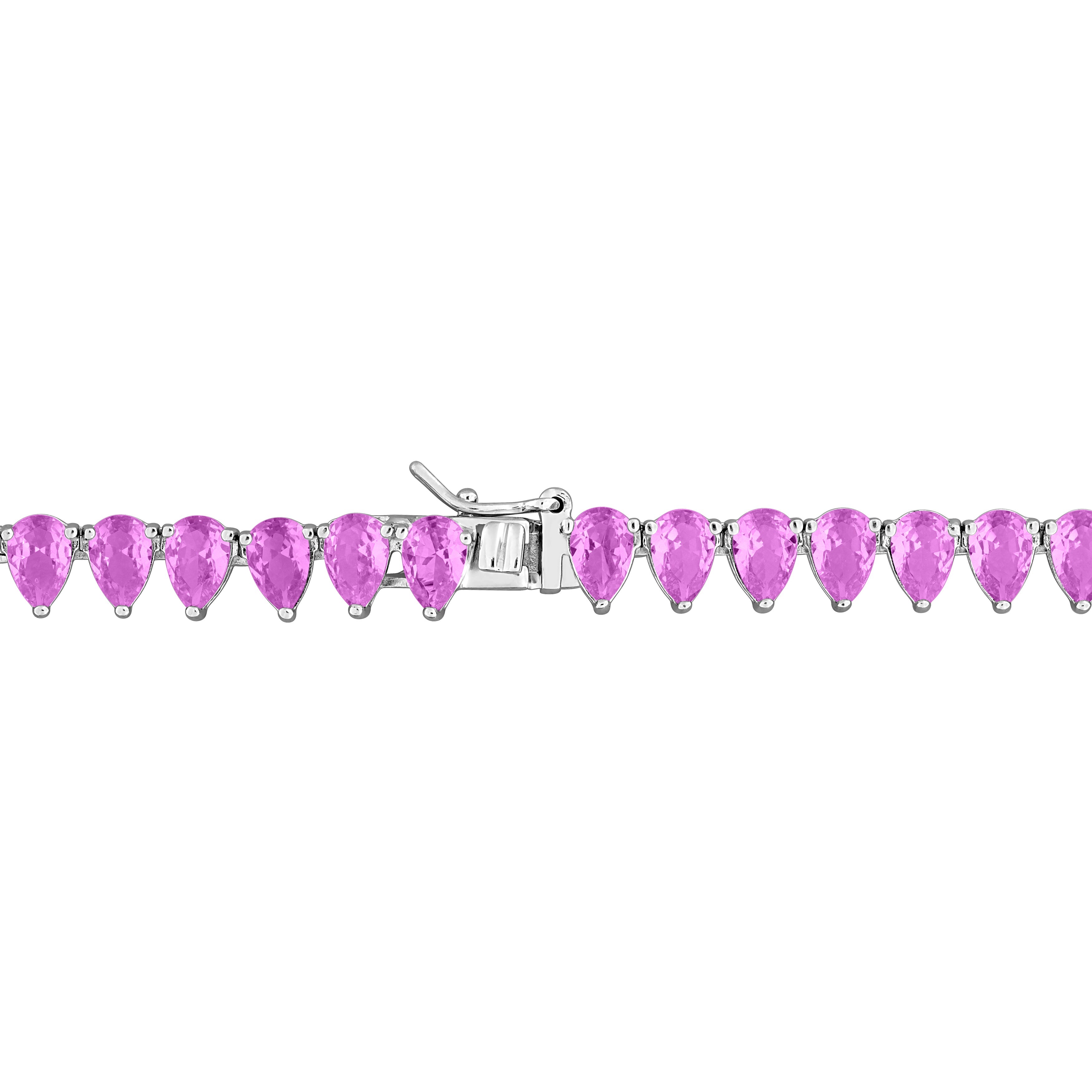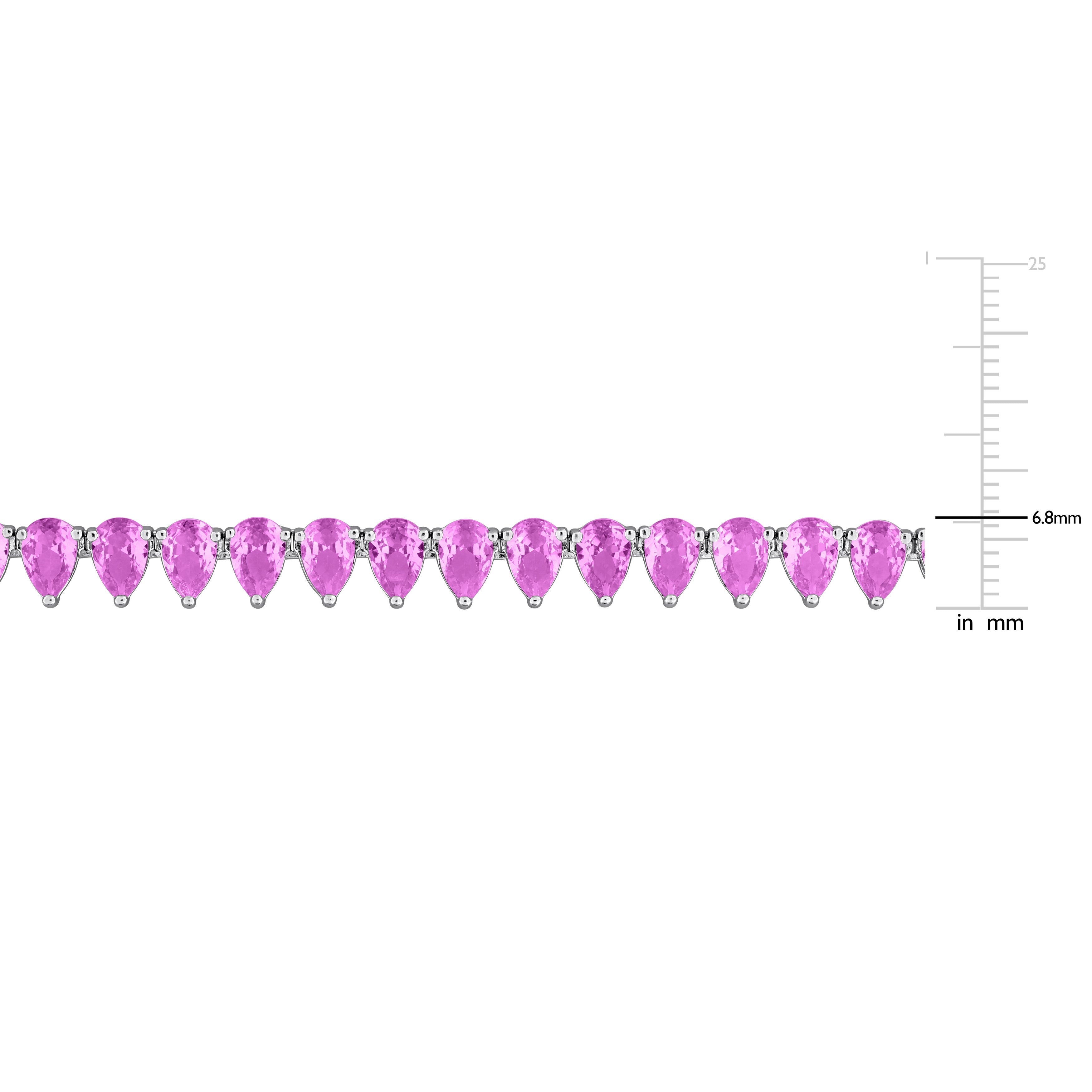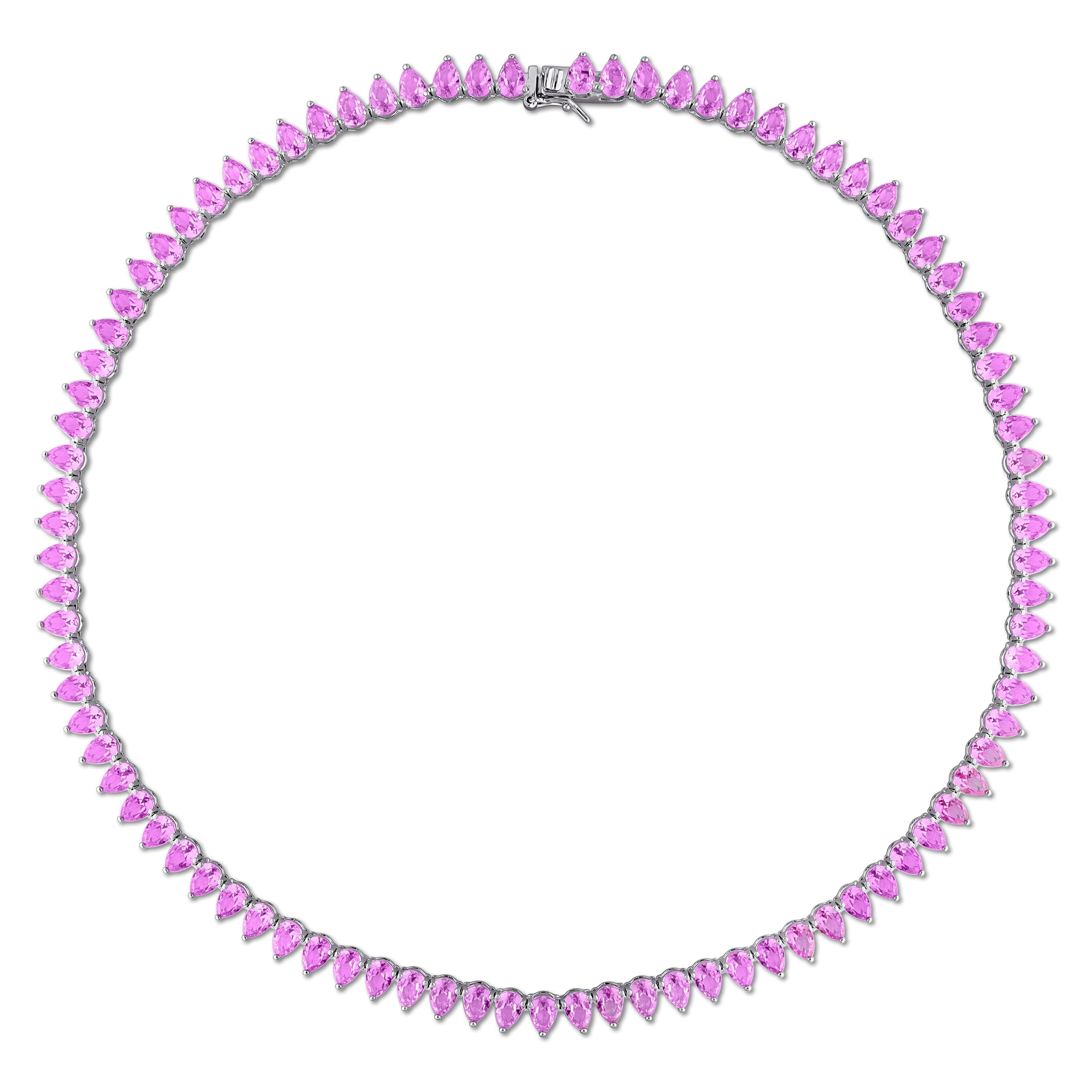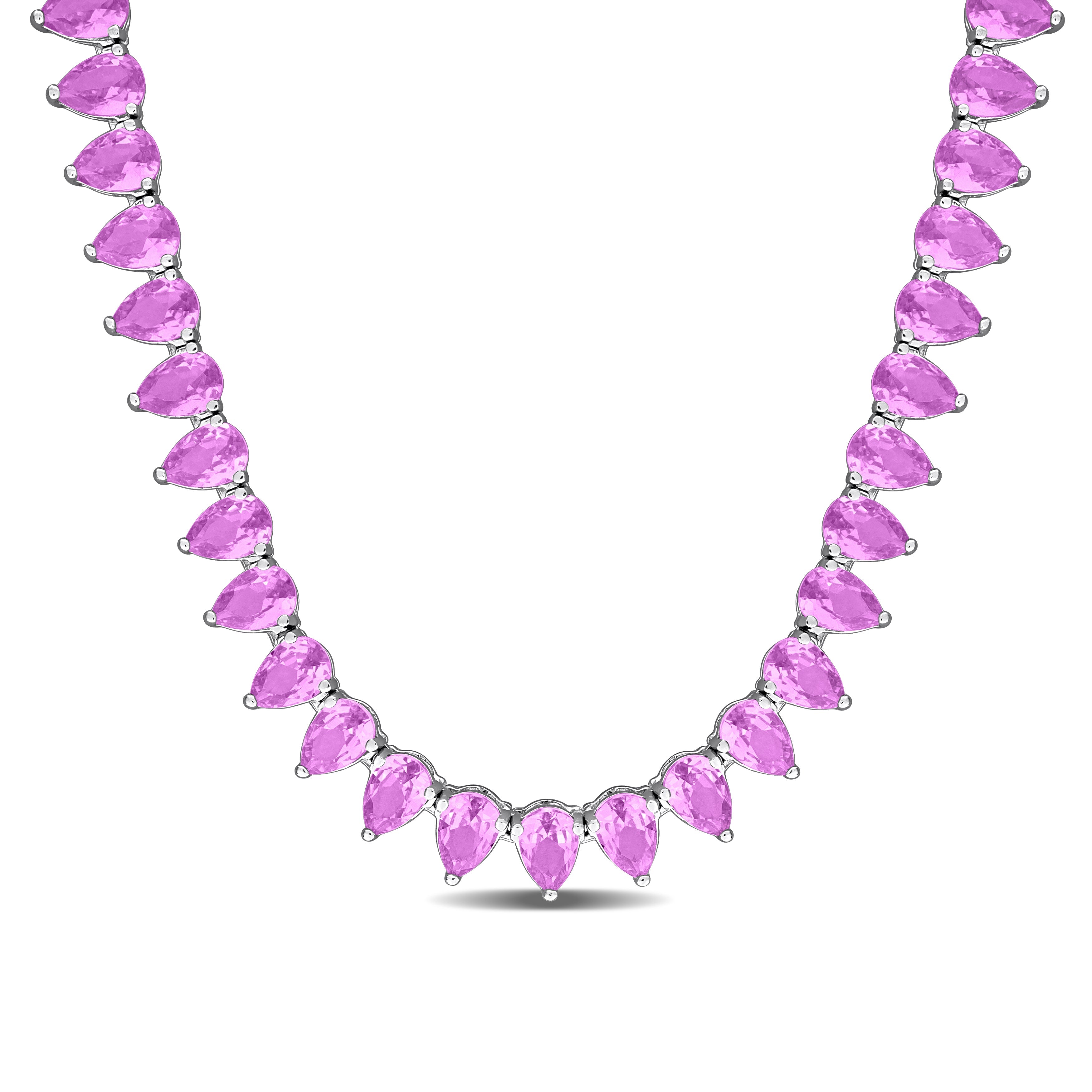This lovely tennis necklace is crafted in lustrous sterling silver and features pear-cut, prong-set lab-created pink sapphire gemstones in a tennis design. Enhanced with a polished finish, this exquisite necklace measures 18-inches in length and is secured with a tongue and groove clasp. This necklace is a perfect gift.