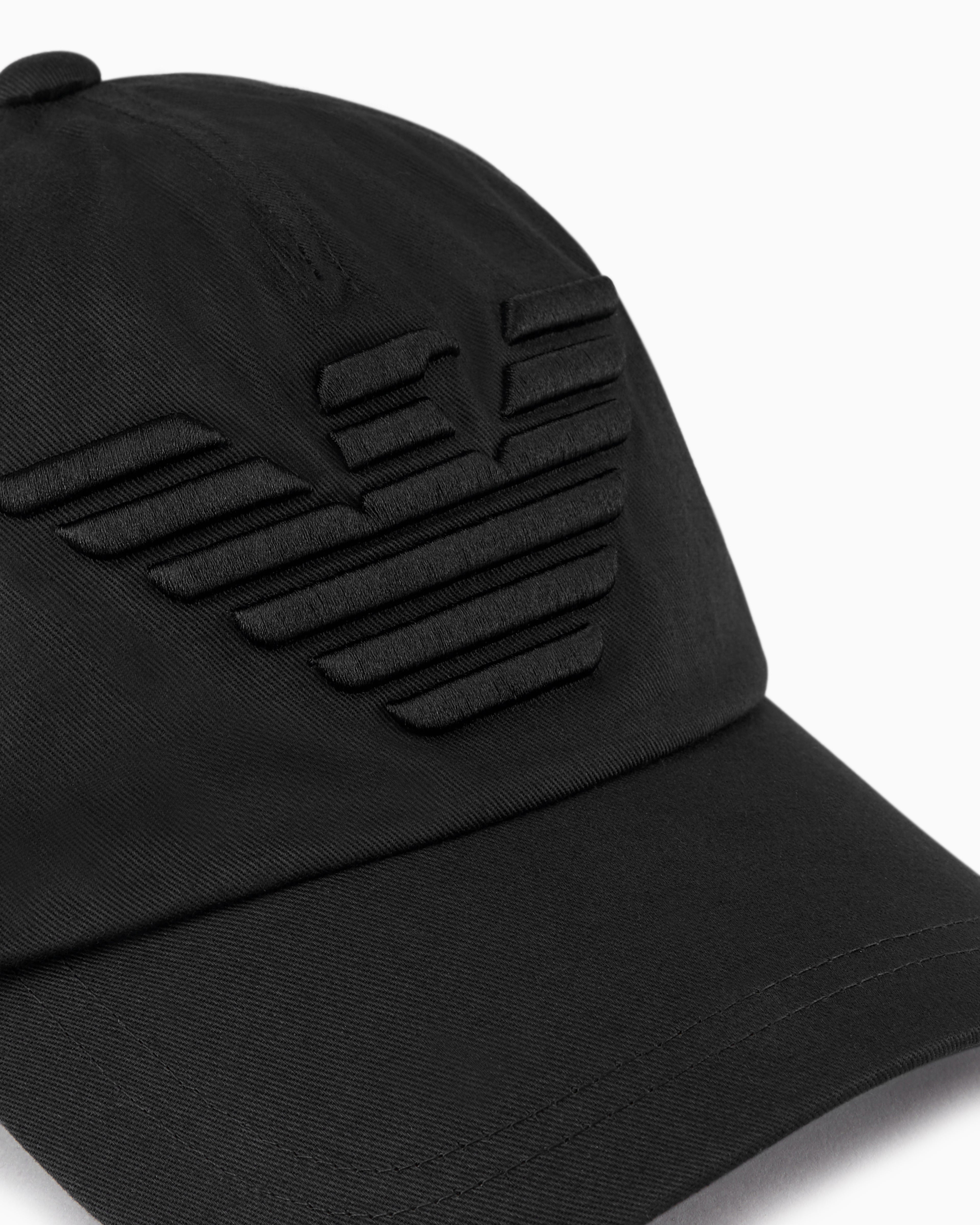 This baseball cap, crafted from 100% cotton, features an embossed embroidered oversized eagle, exemplifying refined craftsmanship. Part of the Emporio Armani Essentials collection, it offers timeless style with clean, thoughtfully designed lines suitable for any season. The cap includes a rigid visor, adjustable back, and details made from polyester, complemented by a cotton lining to ensure comfort and durability.