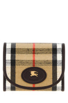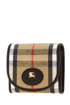 Crafted from Burberry's iconic beige check cotton and linen blend, this compact wallet features luxurious dark brown leather details and piping that frame the signature pattern beautifully. The gold-toned hardware and embossed logo patch add sophisticated finishing touches.