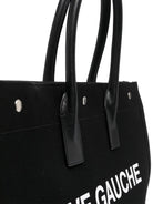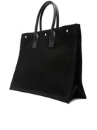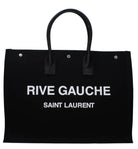 This spacious tote features durable black canvas construction with the signature "RIVE GAUCHE SAINT LAURENT" logo prominently displayed in white lettering, making a bold statement wherever you go. The elegant leather handles provide comfortable carrying while adding a refined touch to the design.