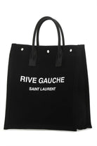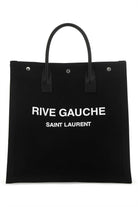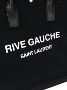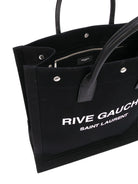 Elevate your everyday style with this iconic Black Canvas Rive Gauche Shopping Bag from Saint Laurent. Crafted from durable canvas with sleek leather handles, this timeless tote features the signature "RIVE GAUCHE SAINT LAURENT" logo in bold white lettering.