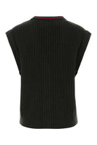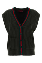 Elevate your knitwear collection with this exquisite bottle green wool vest from Gucci. Crafted from luxuriously soft wool with a refined ribbed texture, this sleeveless cardigan features the iconic red and green web stripe detailing along the V-neckline and button placket.