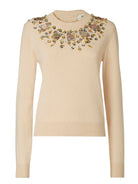 The crew neckline is beautifully adorned with an array of sparkling jeweled embellishments in warm tones, adding a touch of opulence to this classic silhouette. The long sleeves and fitted cut create a flattering, feminine shape that transitions effortlessly from day to evening.