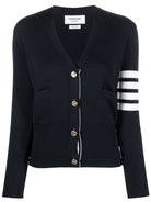 The classic V-neck silhouette is complemented by a front button fastening, long sleeves with ribbed cuffs, and a ribbed hem for a polished finish. Signature tricolour grosgrain trim and a distinctive tab at the back showcase Thom Browne's attention to detail and heritage craftsmanship.