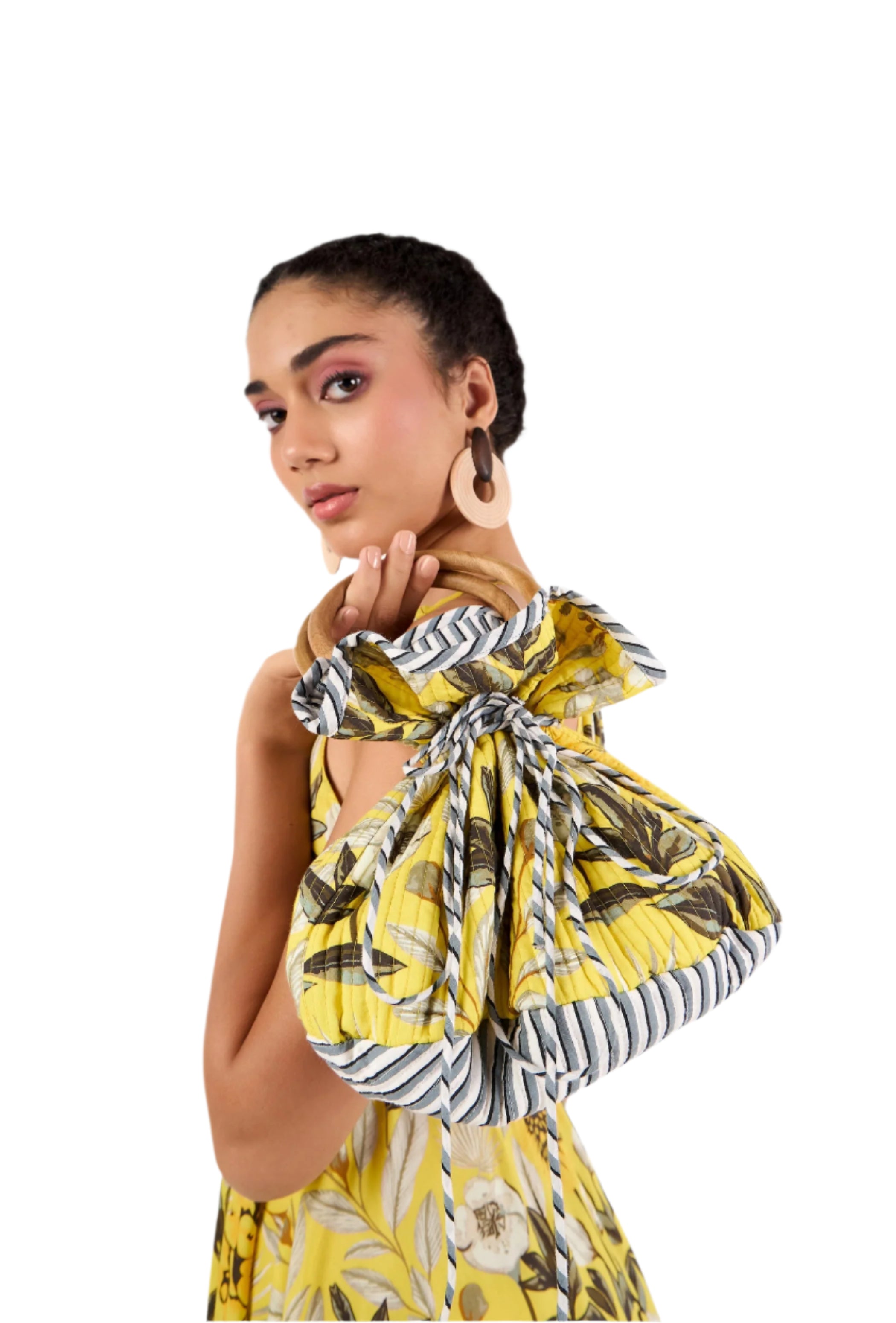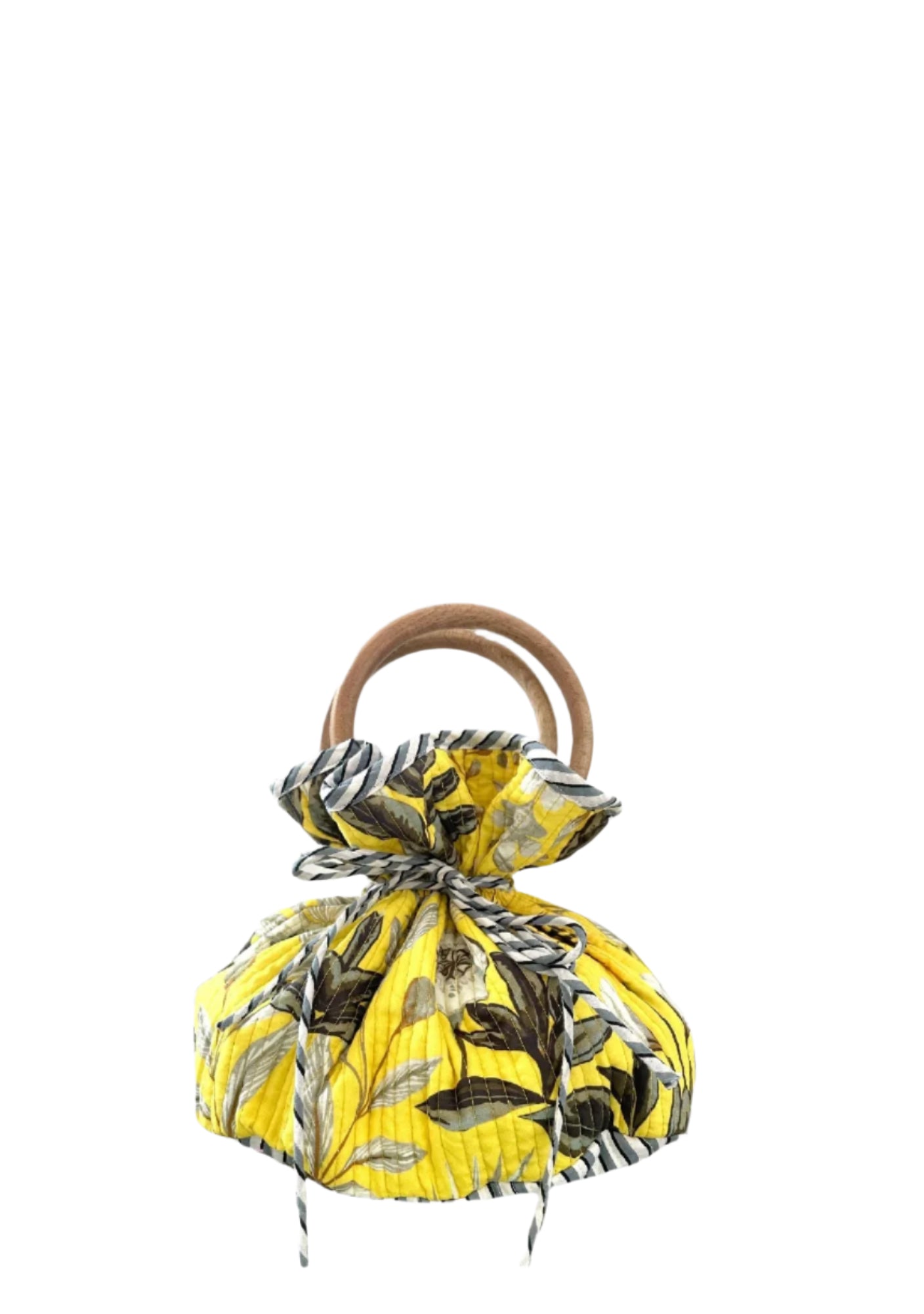 Bella's outer layer showcases our stunning hand-drawn print and is lined with recycled block-printed fabric. The drawstring closure adds a feminine touch, while the gathered fabric at the handles enhances its elegant design. Sturdy mango wood handles bring a natural, earthy element. This quilted bucket bag is a chic accessory that effortlessly elevates any outfit.