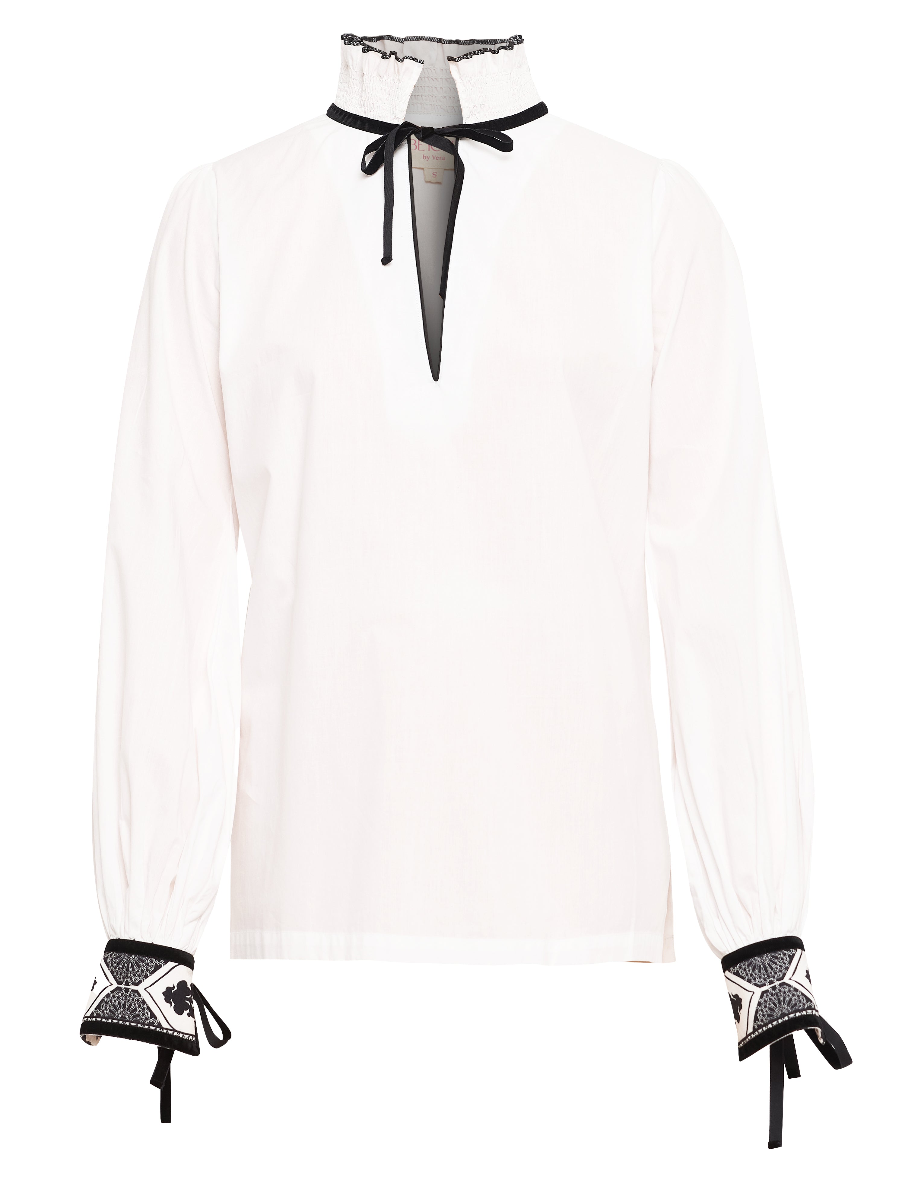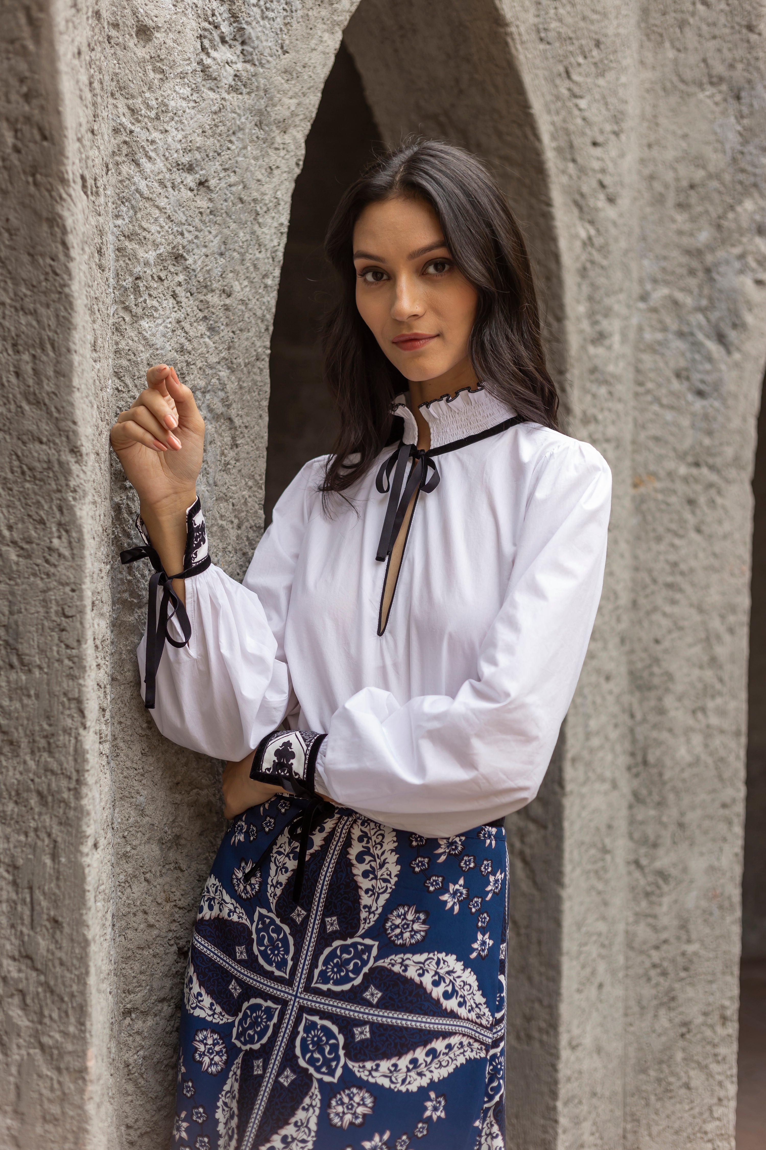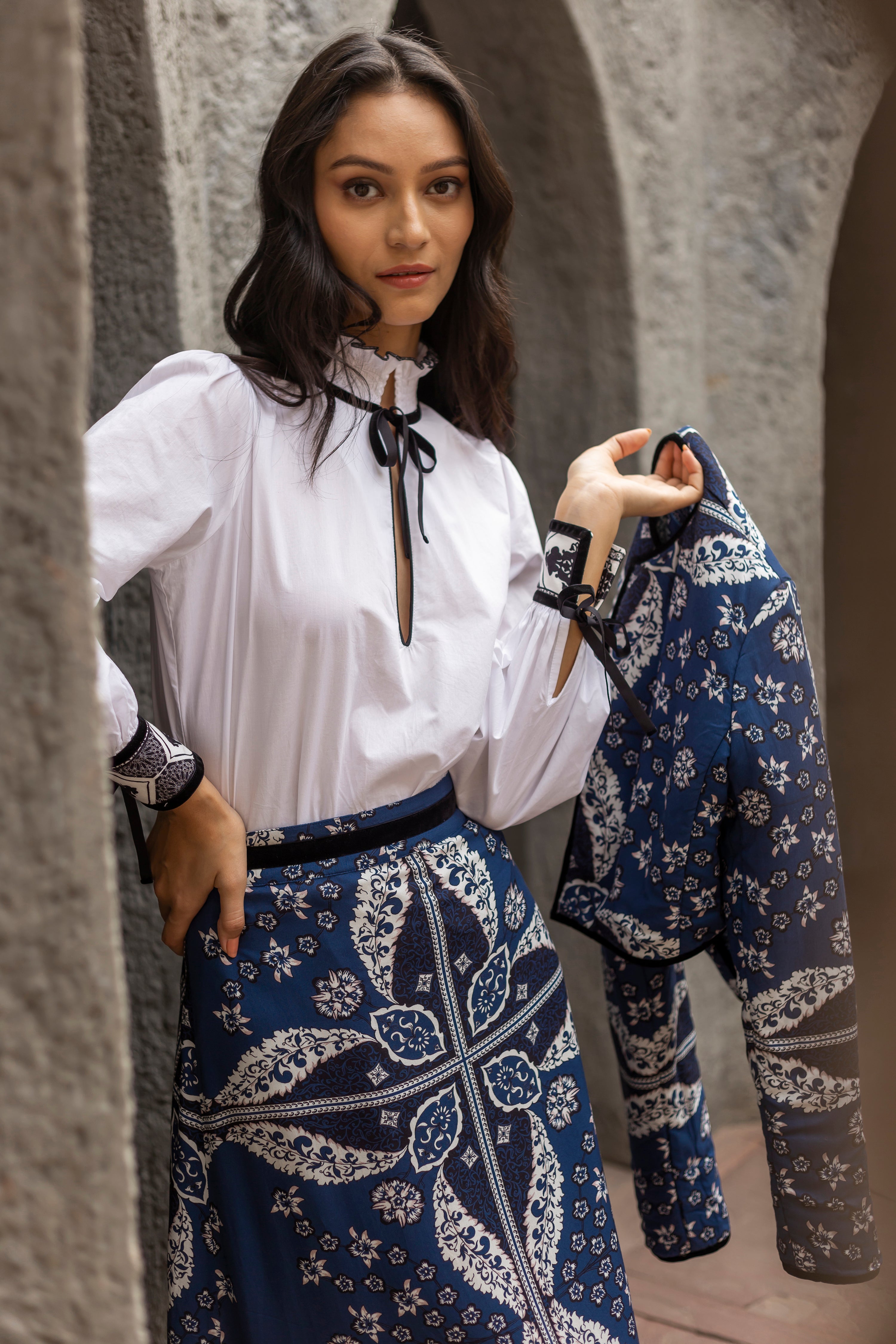 Crafted from crisp white cotton poplin, the Jill blouse exudes understated elegance for all occasions. The neck opening, adorned with chic velvet self-tie ribbons, offers versatile styling options, allowing you to effortlessly transition between a closed high collar or a relaxed, open V-neck. The cuffs feature our "Arabesque" print and velvet trims. This versatile white blouse is destined to be your fall favorite.