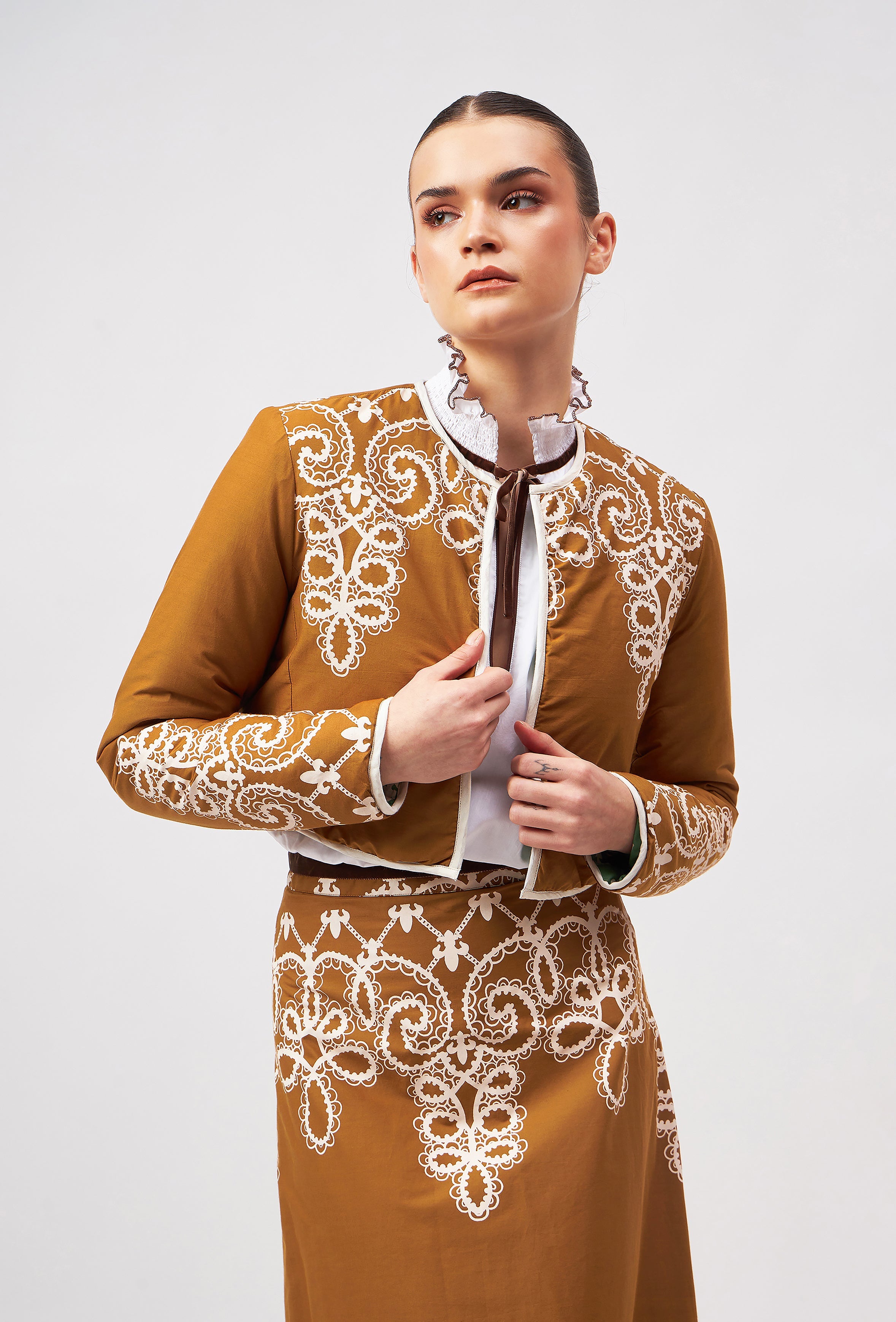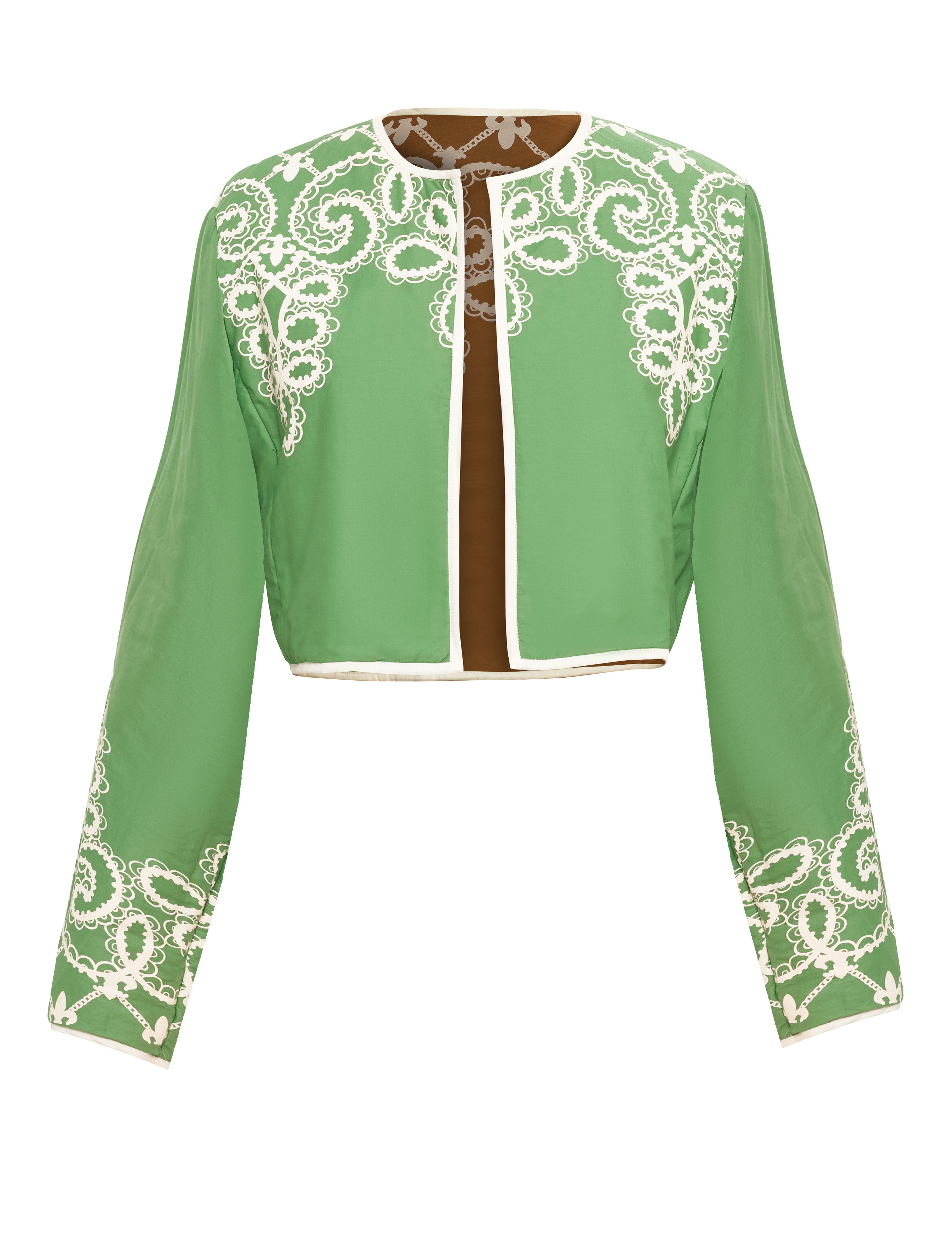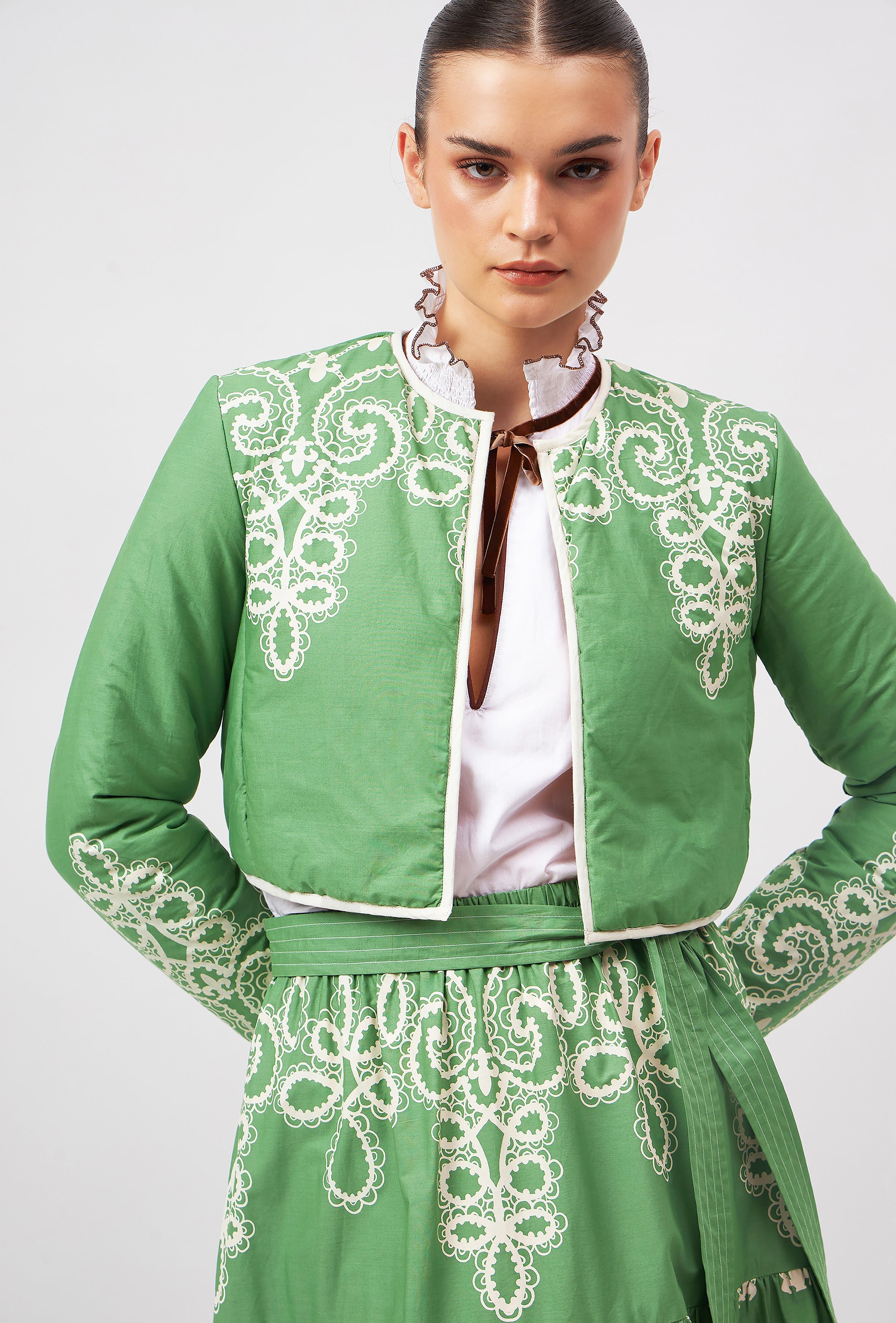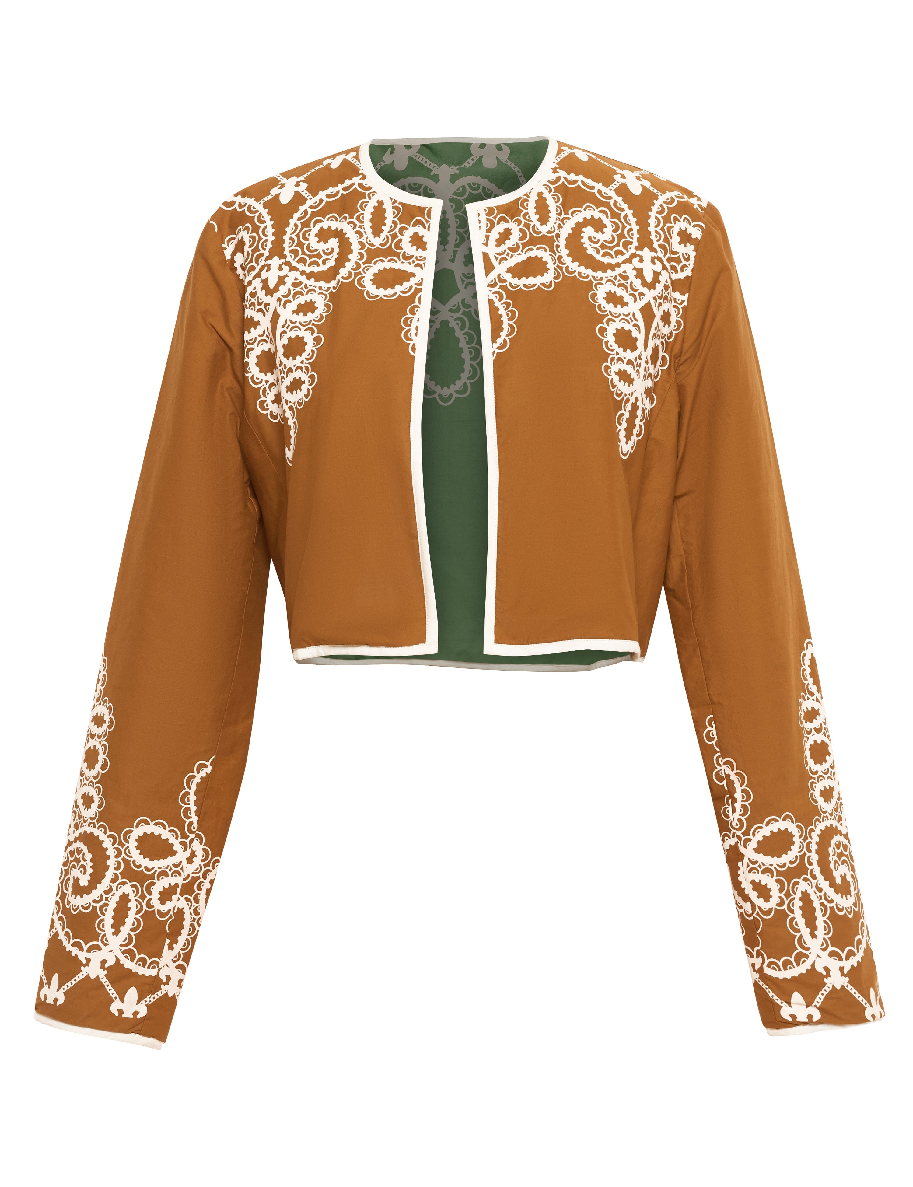 Introducing a contemporary masterpiece, this exquisite cropped jacket is a reversible marvel, offering two looks in one statement piece. Lined with the softest cotton, it not only provides unparalleled comfort but also shapes a beautiful silhouette. Versatile and refined, it effortlessly complements both elegant dresses and casual pants. The print design of the outer shell pays homage to the elegance and craftsmanship of a Moroccan vintage bridal gown.