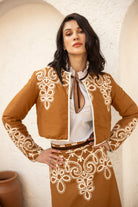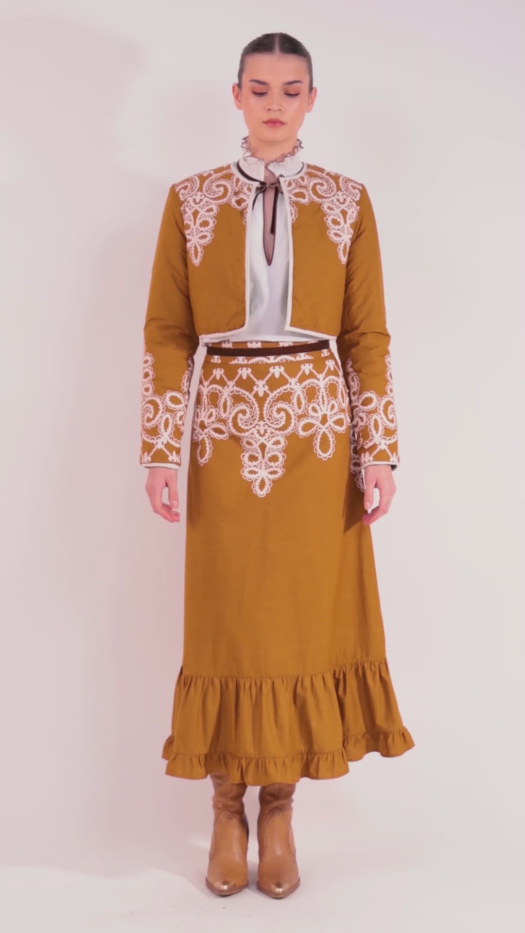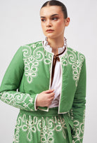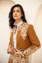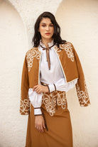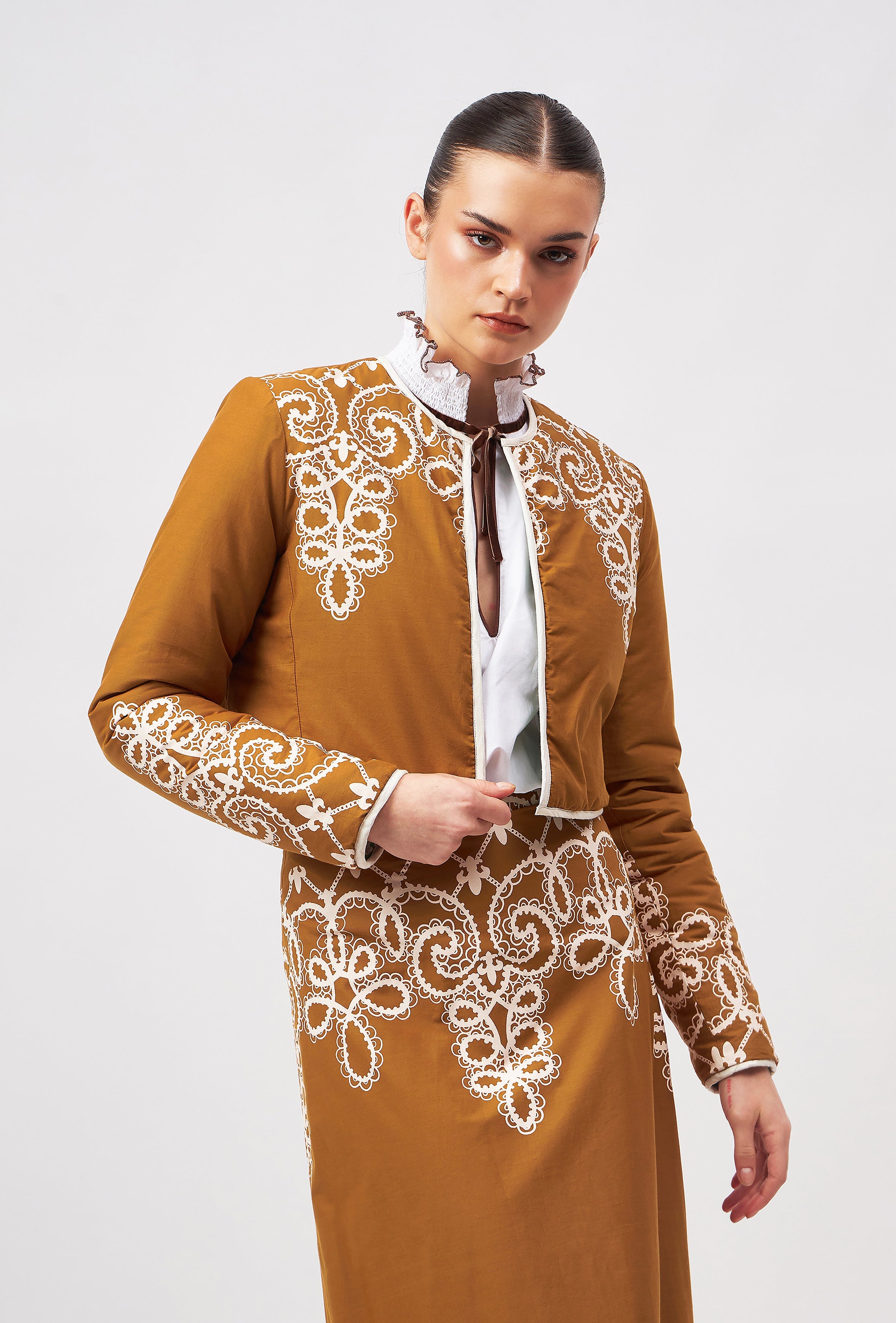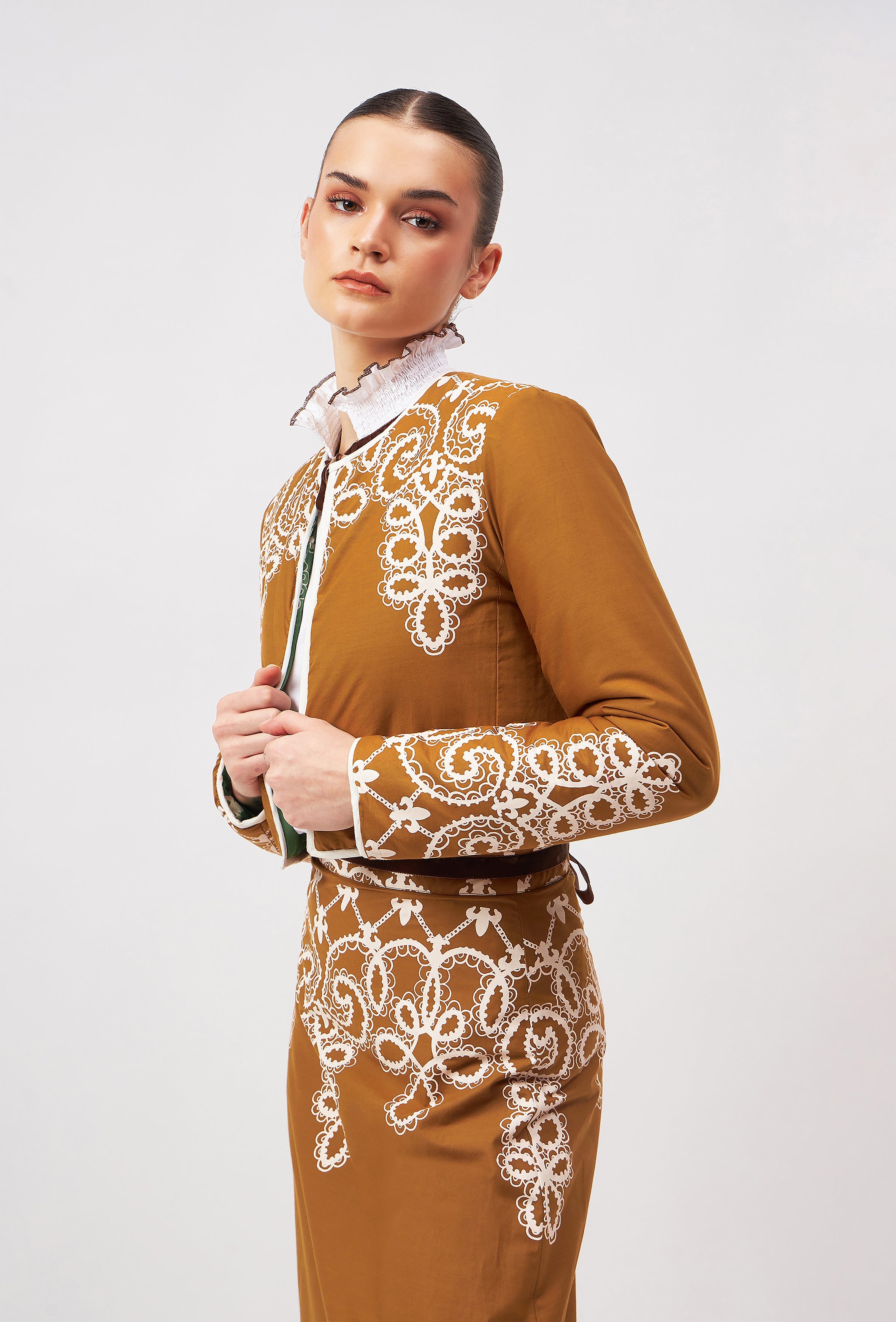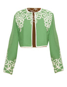 Introducing a contemporary masterpiece, this exquisite cropped jacket is a reversible marvel, offering two looks in one statement piece. Lined with the softest cotton, it not only provides unparalleled comfort but also shapes a beautiful silhouette. Versatile and refined, it effortlessly complements both elegant dresses and casual pants. The print design of the outer shell pays homage to the elegance and craftsmanship of a Moroccan vintage bridal gown.