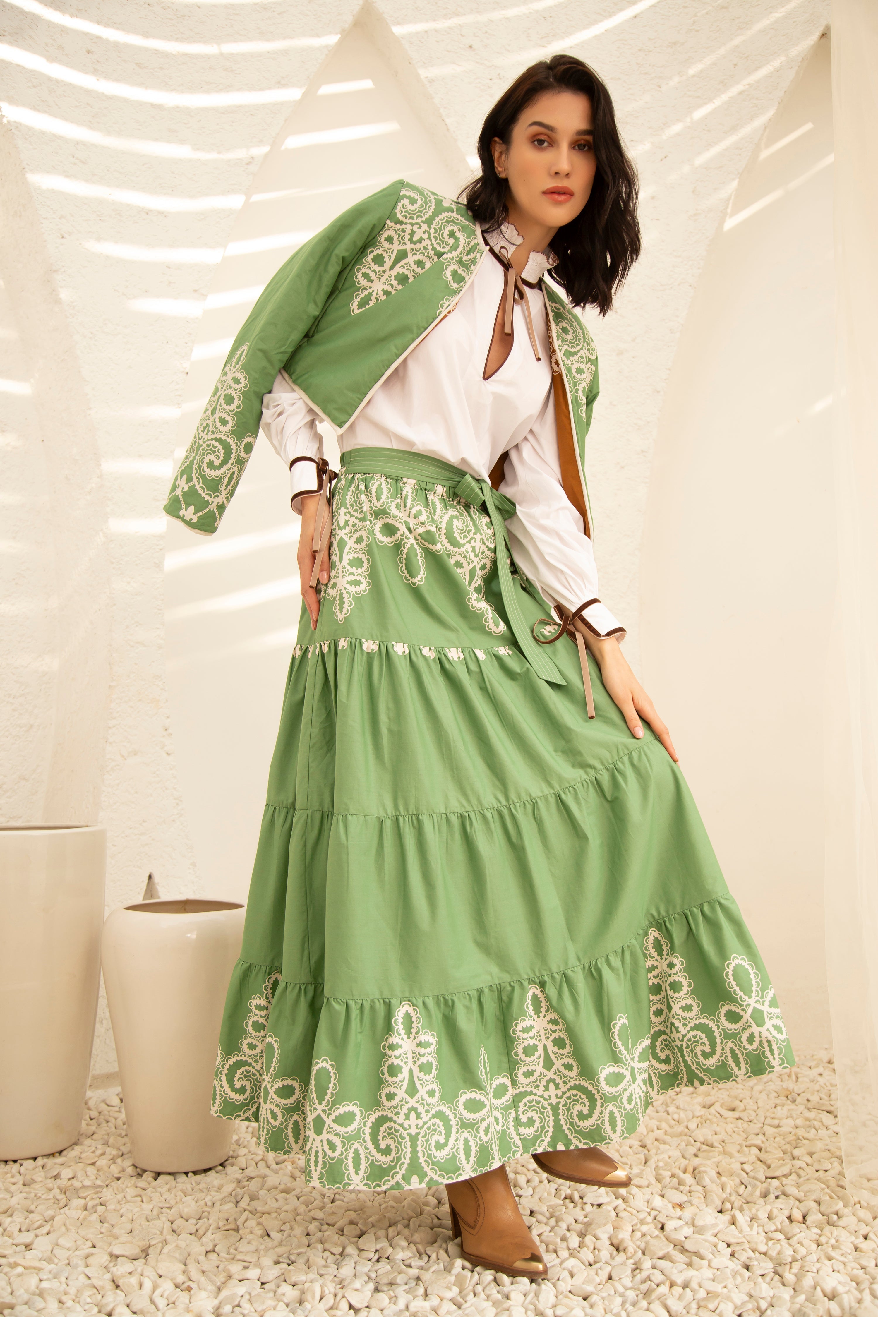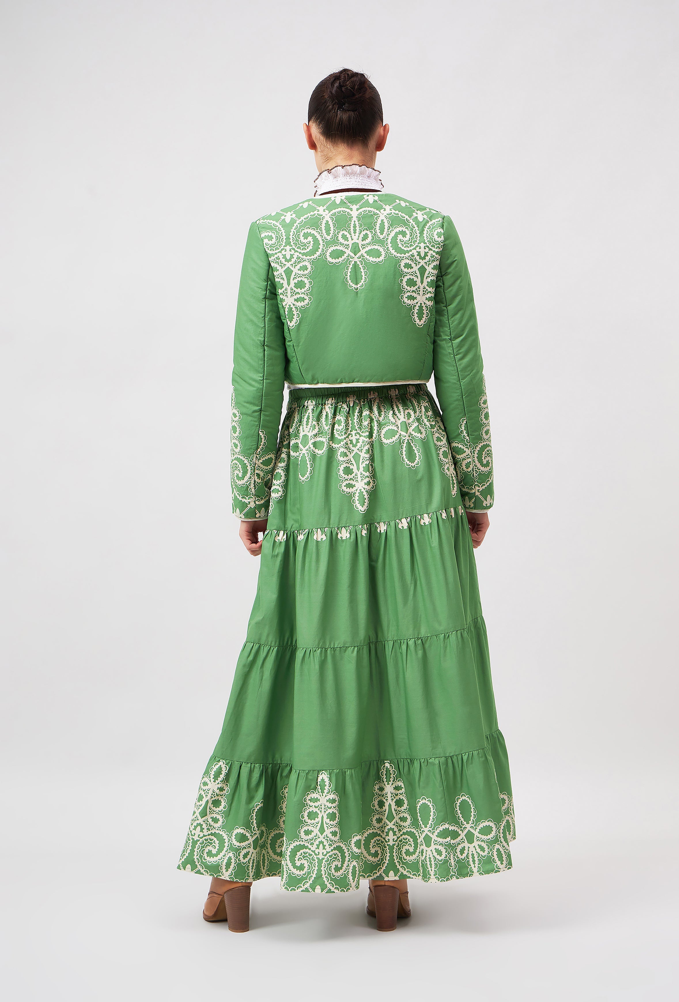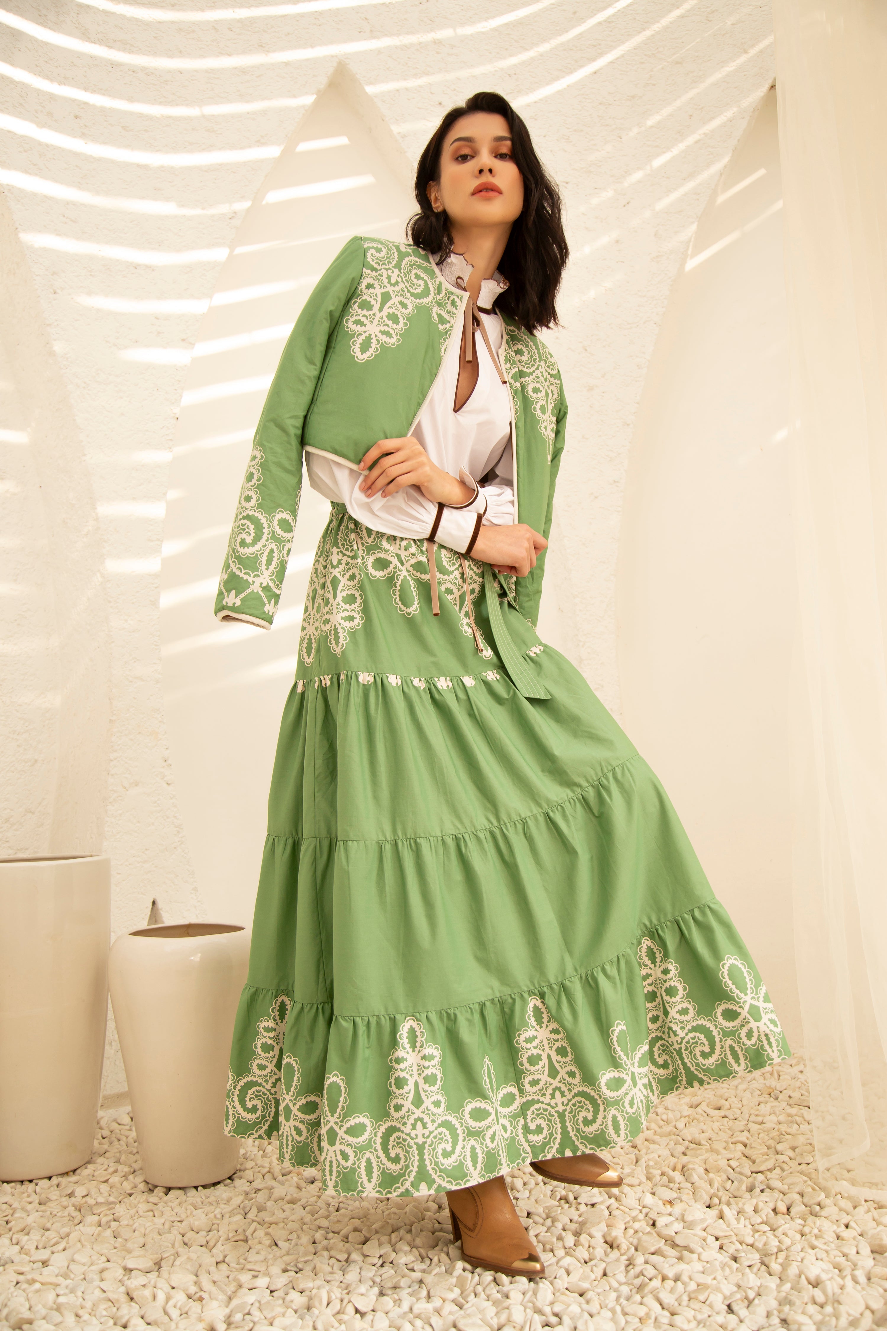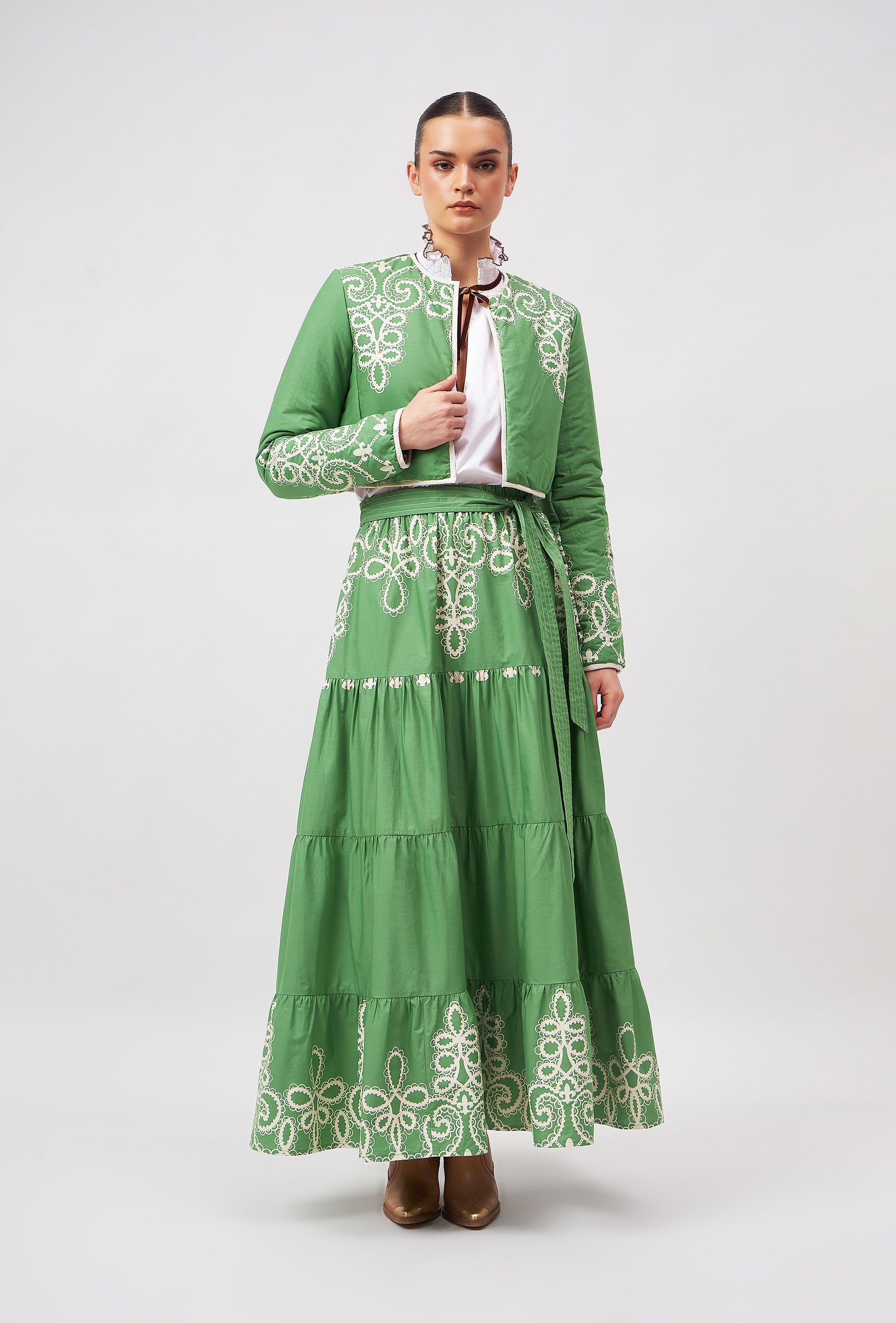 Introducing a contemporary masterpiece, this exquisite cropped jacket is a reversible marvel, offering two looks in one statement piece. Lined with the softest cotton, it not only provides unparalleled comfort but also shapes a beautiful silhouette. Versatile and refined, it effortlessly complements both elegant dresses and casual pants. The print design of the outer shell pays homage to the elegance and craftsmanship of a Moroccan vintage bridal gown.