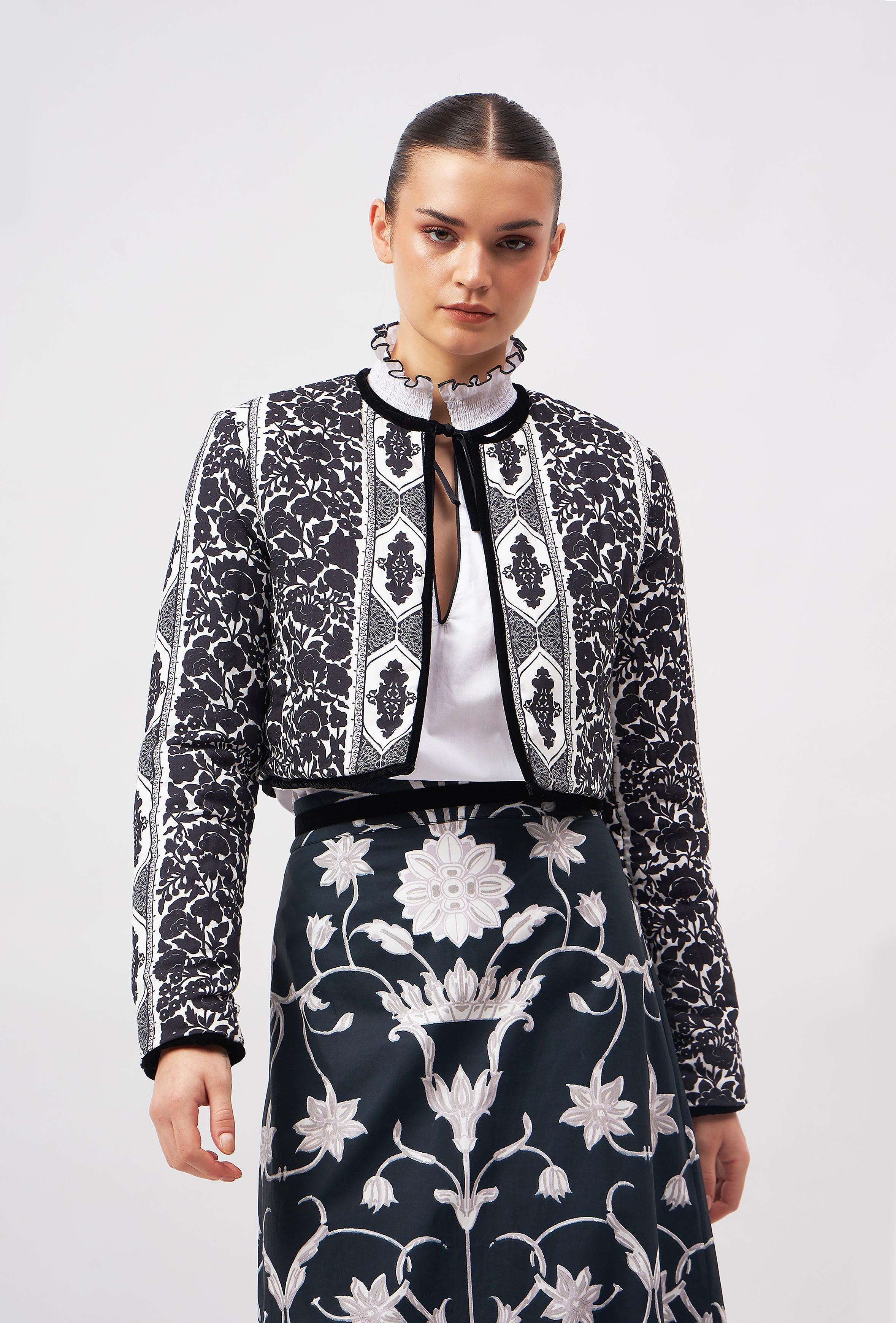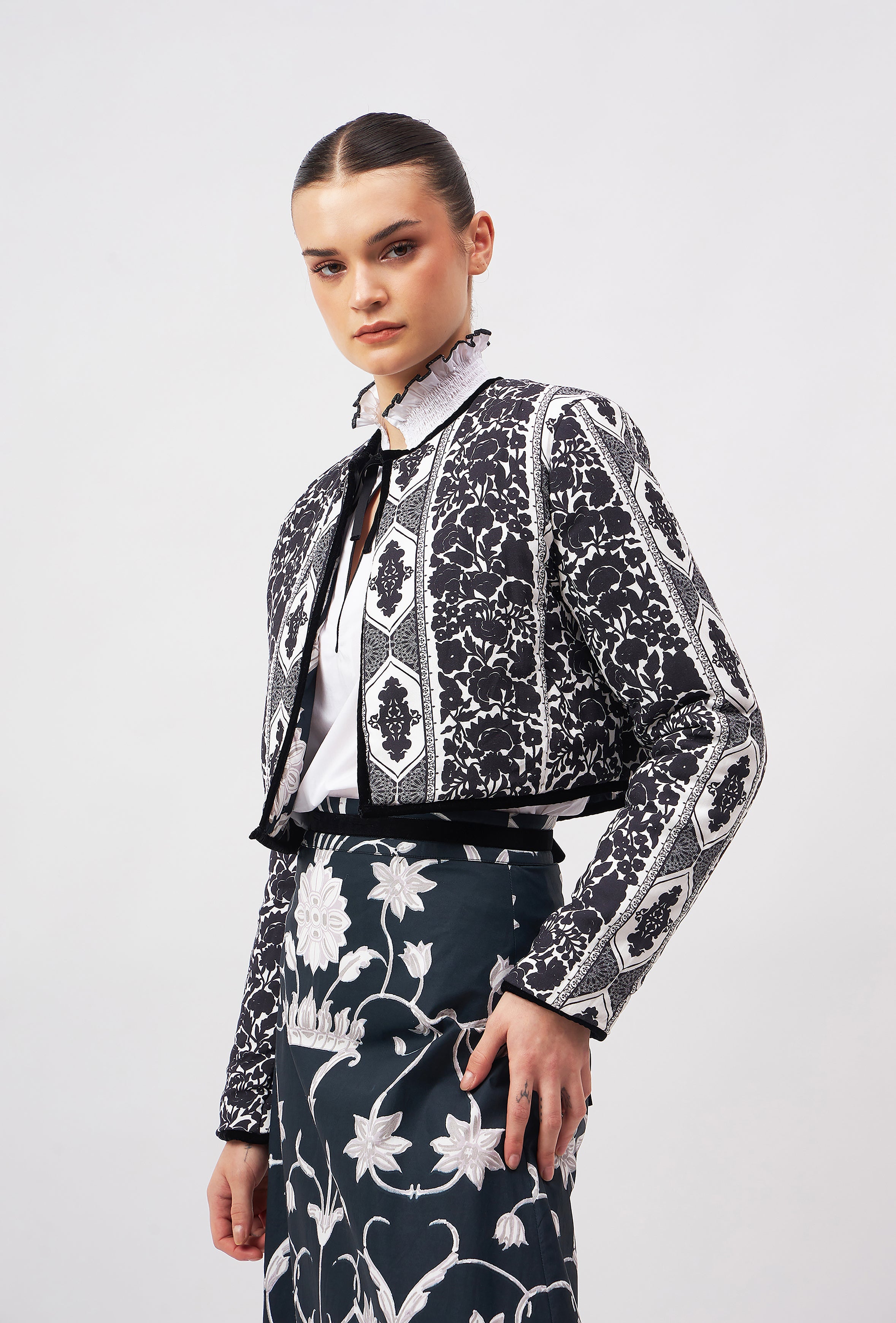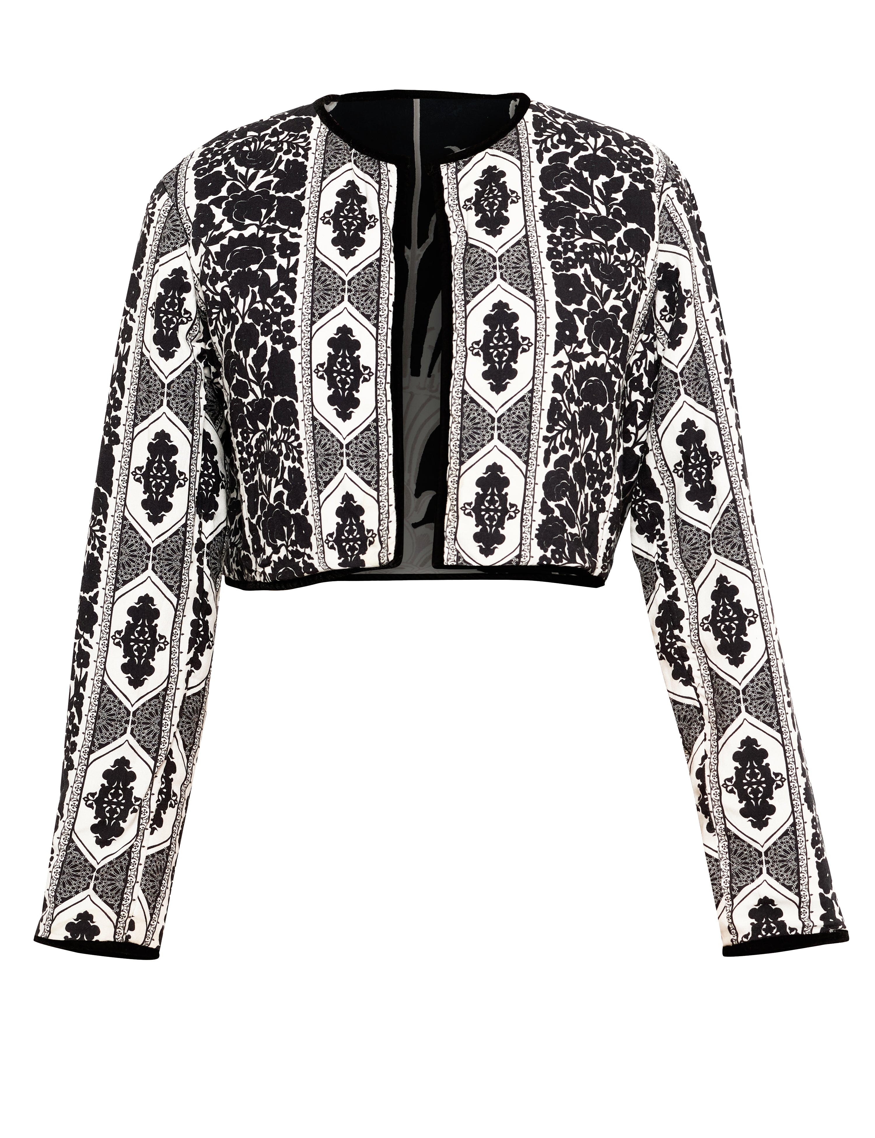 Introducing a contemporary masterpiece, this exquisite cropped jacket is a reversible marvel, offering two looks in one statement piece. Lined with the softest cotton, it not only provides unparalleled comfort but also shapes a beautiful silhouette. Versatile and refined, it effortlessly complements both elegant dresses and casual pants. The print design of the outer shell is influenced by ancient Berber-Roman stone carvings.