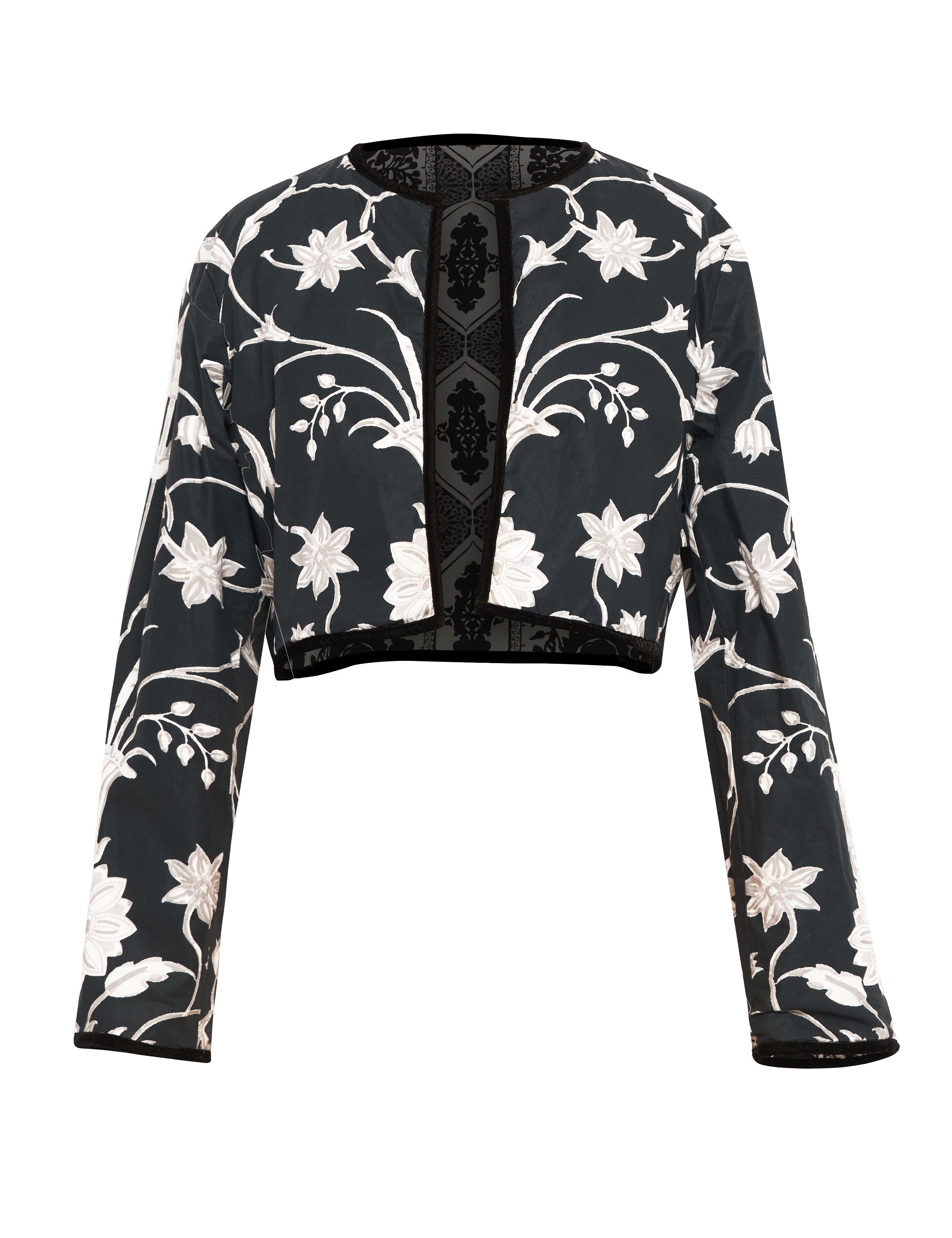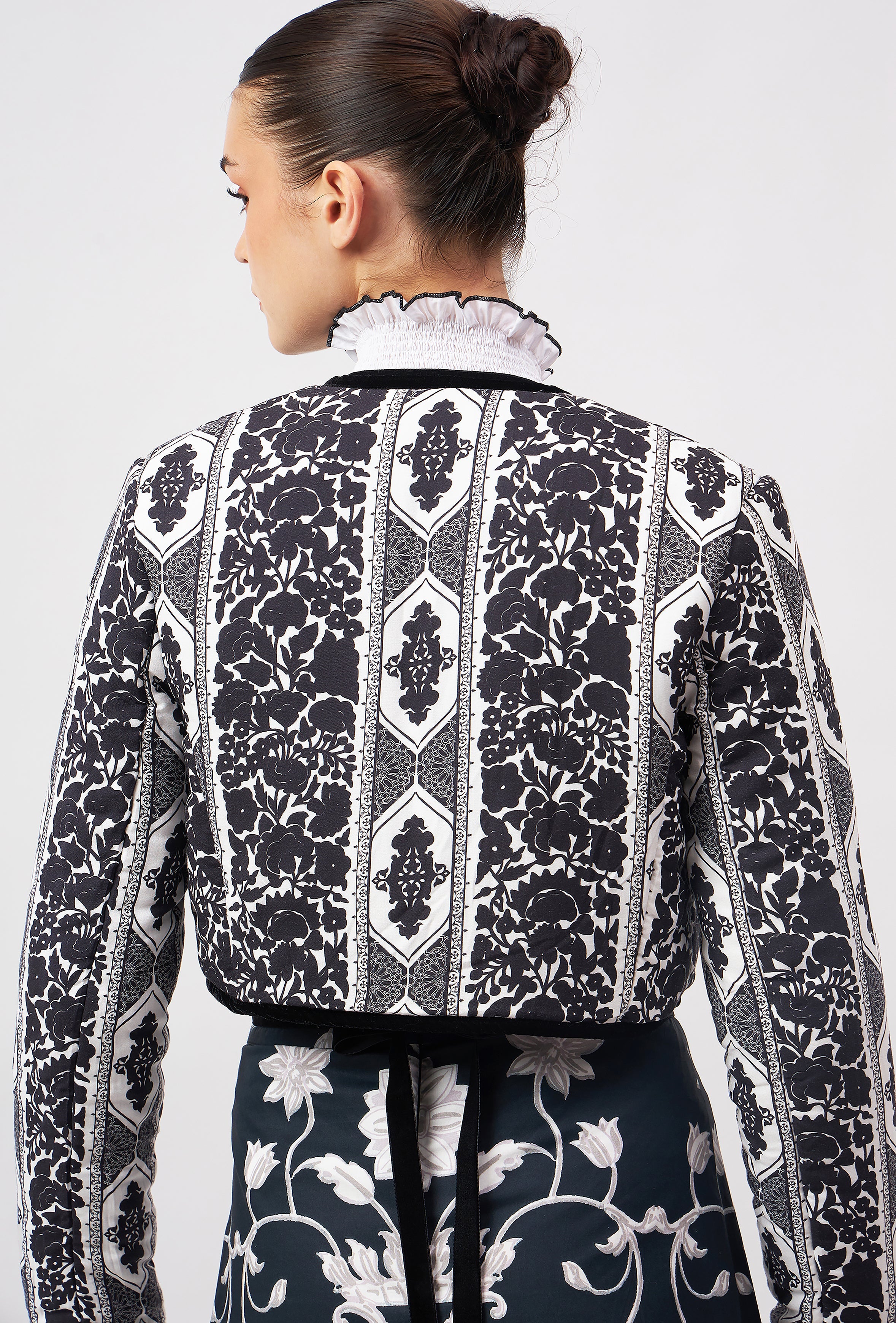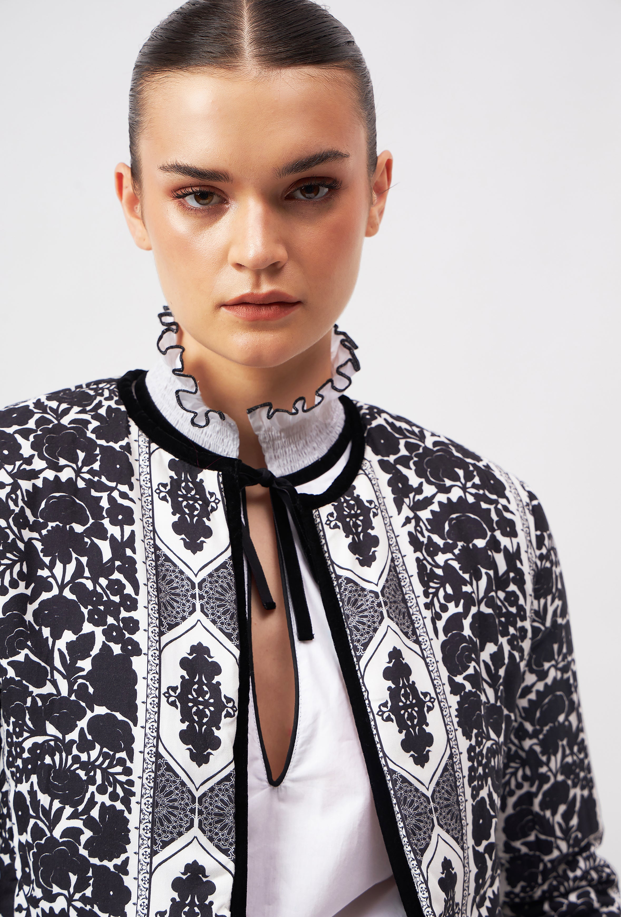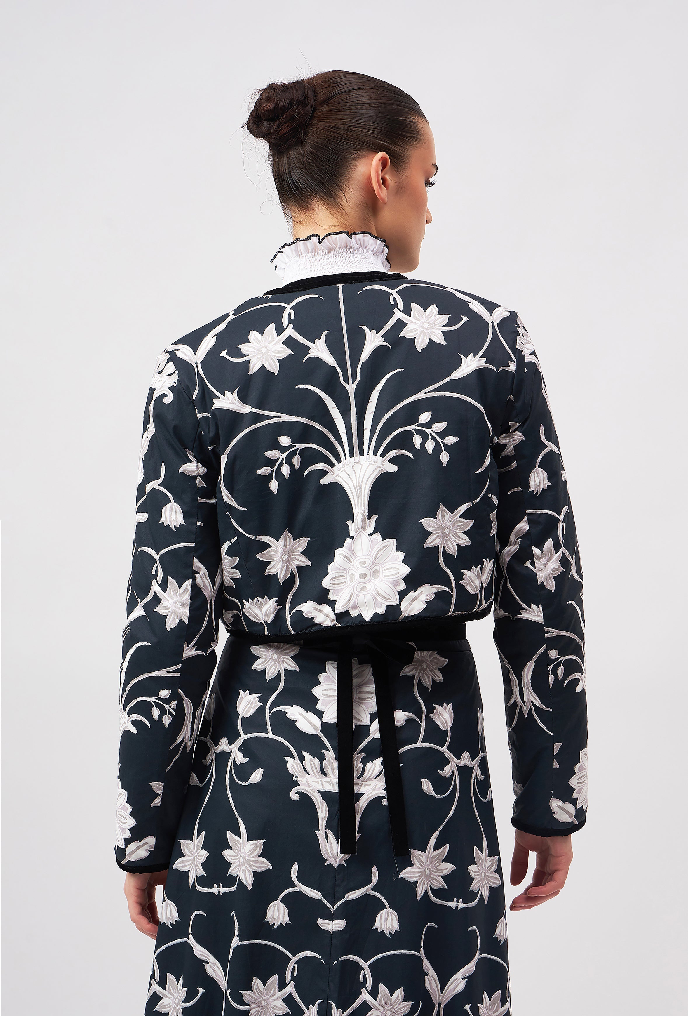 Introducing a contemporary masterpiece, this exquisite cropped jacket is a reversible marvel, offering two looks in one statement piece. Lined with the softest cotton, it not only provides unparalleled comfort but also shapes a beautiful silhouette. Versatile and refined, it effortlessly complements both elegant dresses and casual pants. The print design of the outer shell is influenced by ancient Berber-Roman stone carvings.