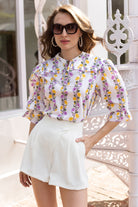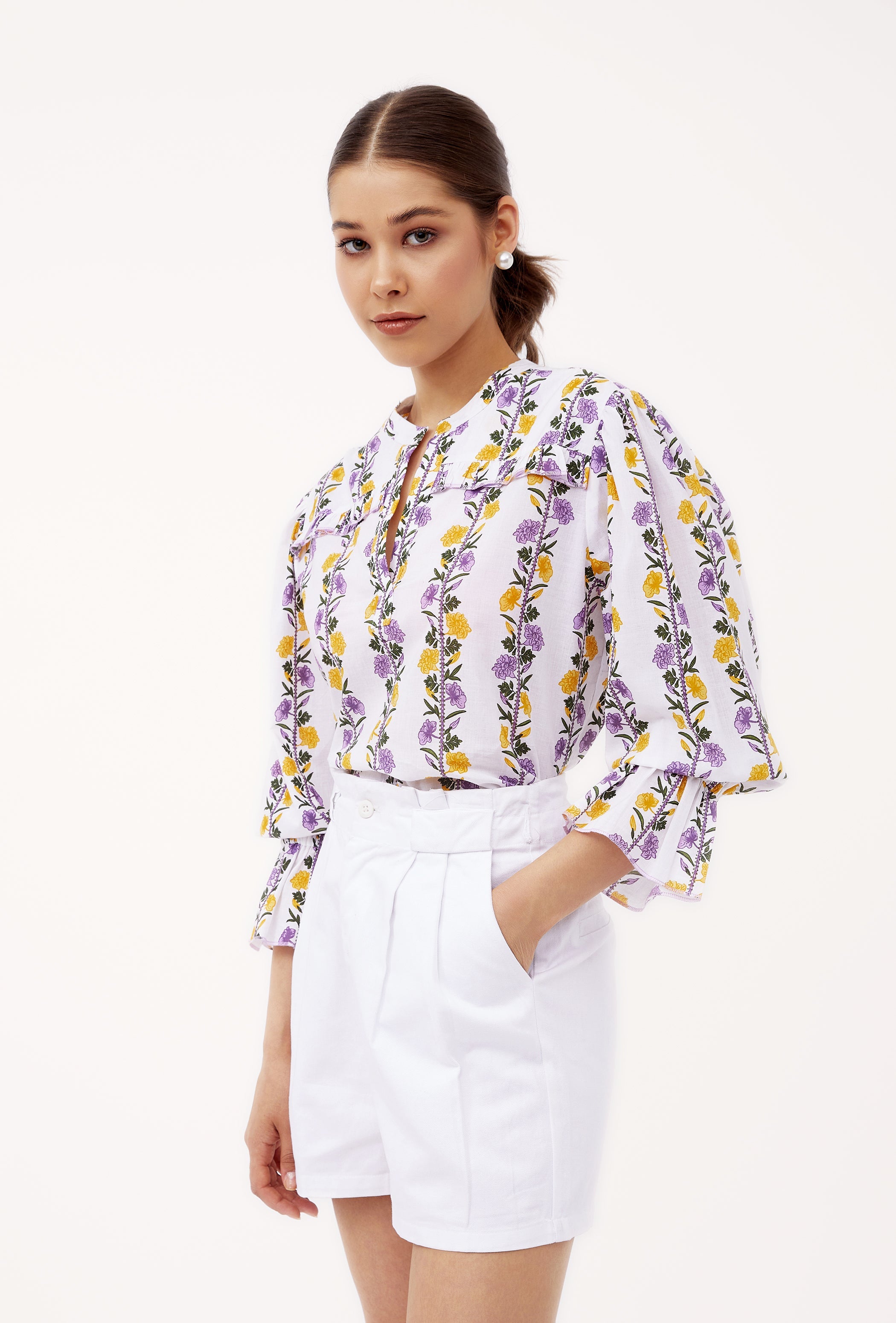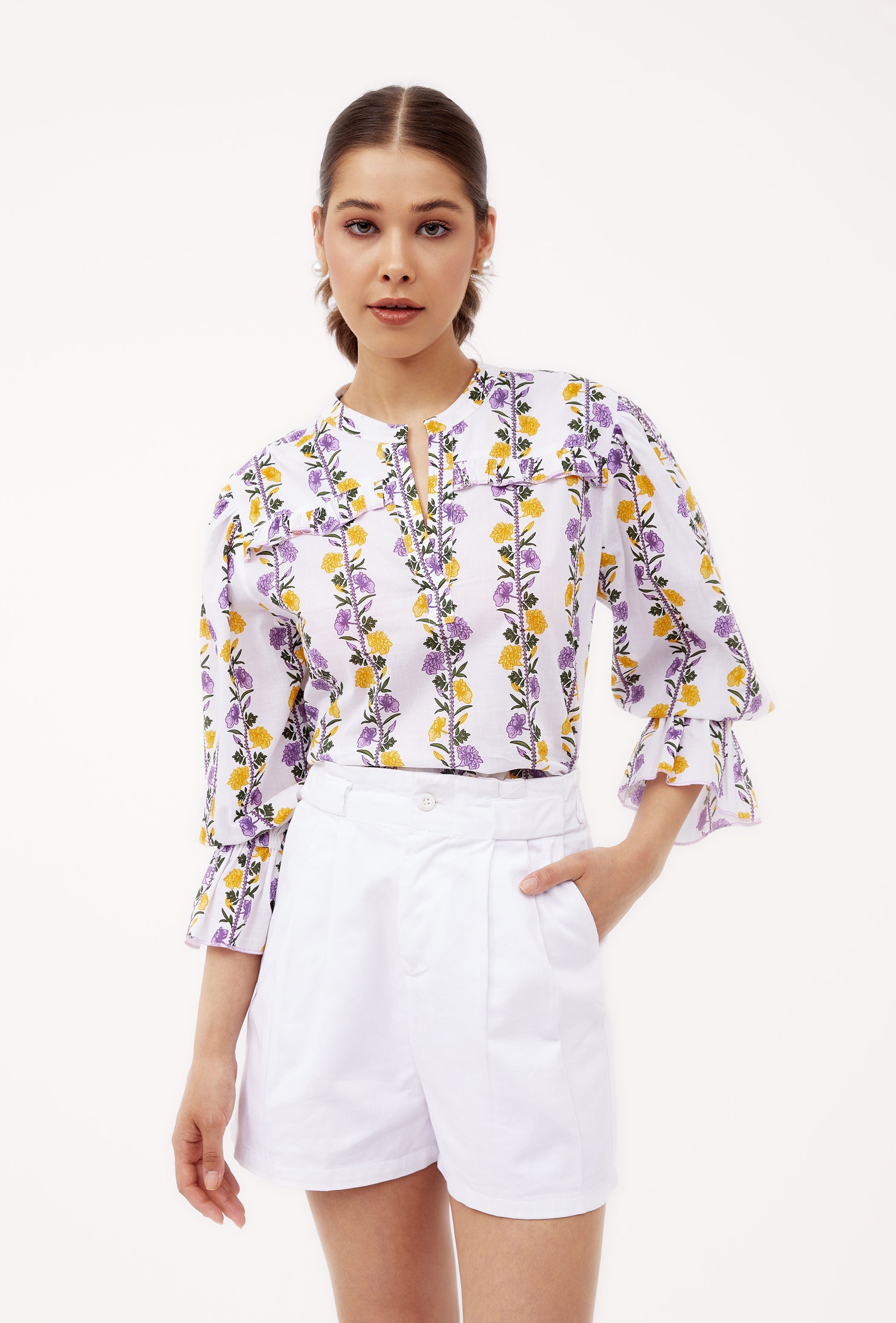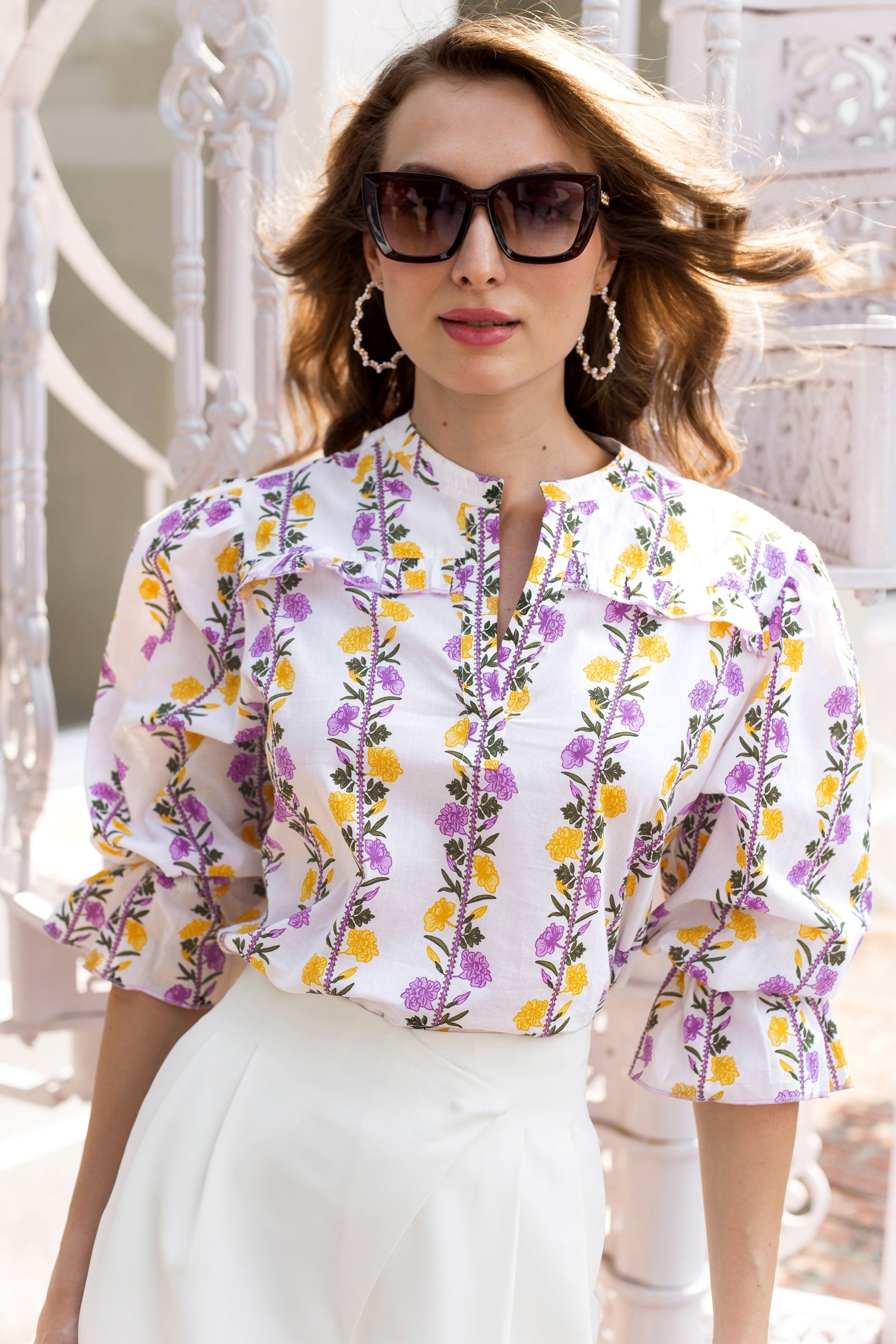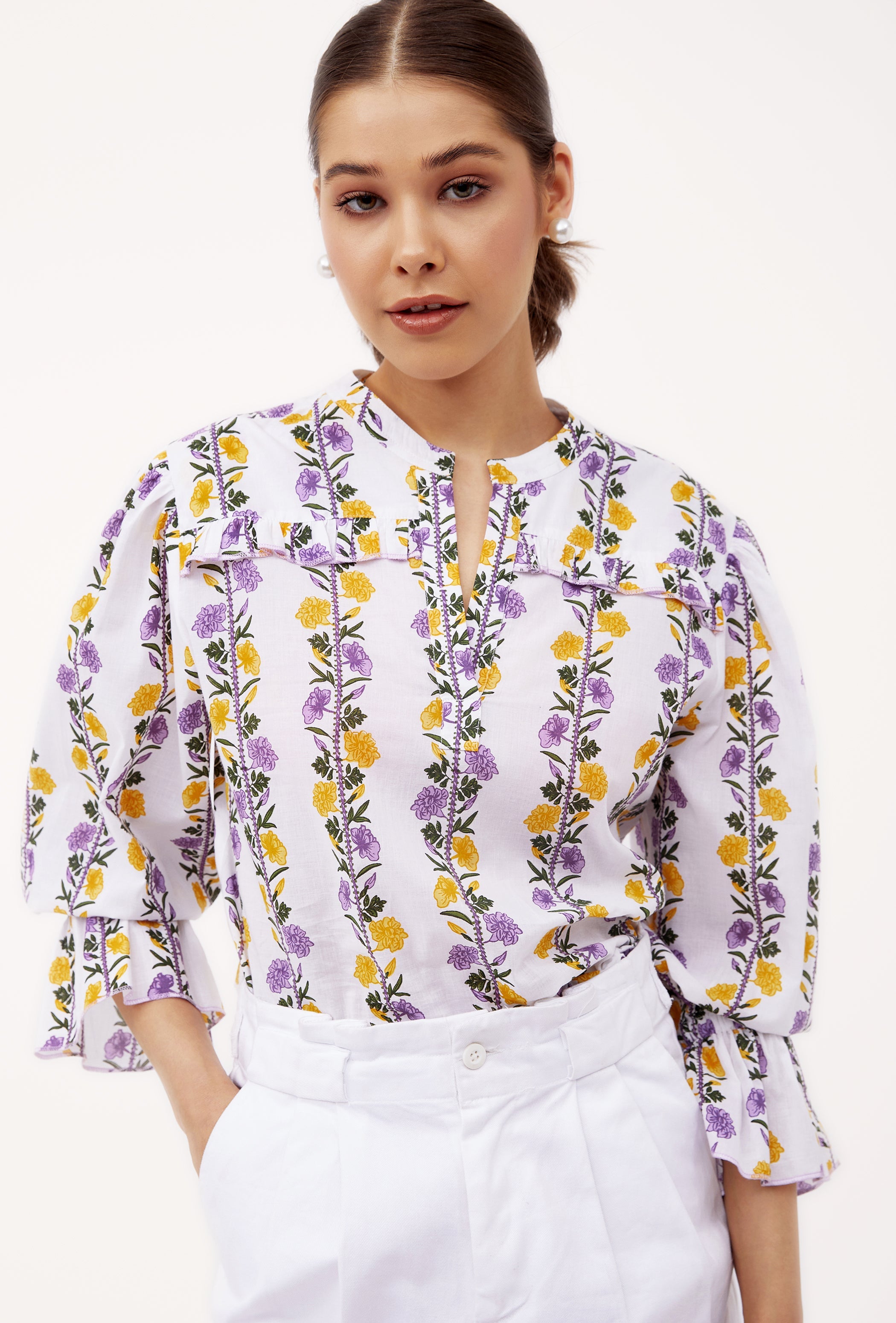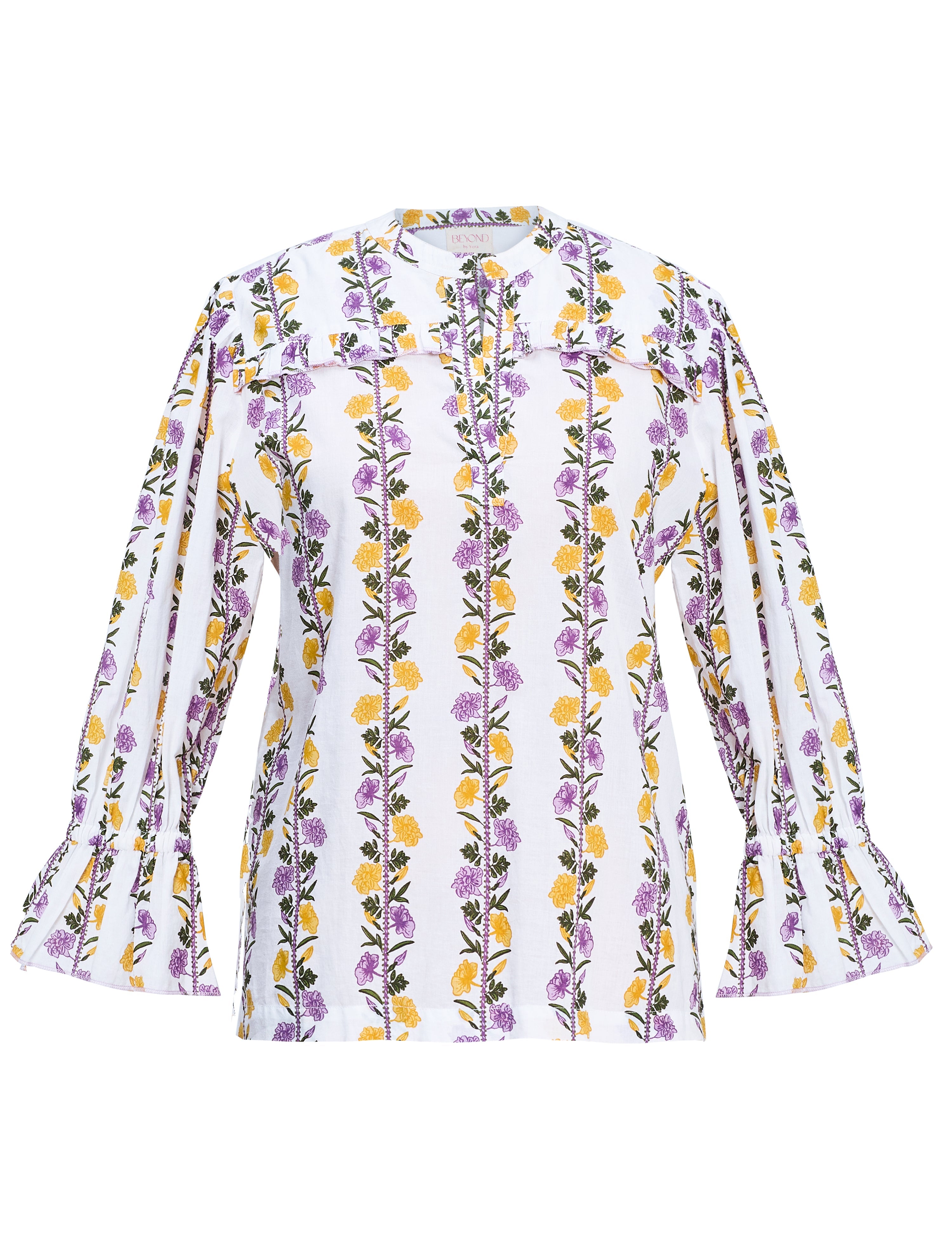 With its slightly puffed 3/4 sleeves, relaxed cut and delicate ruffle details, the Stella is a winner all year round. Pair it with our Gia Midi skirt or with Denim for a casual look. Stella is made from soft, breathable cotton. The print design captures the nostalgic ambiance of Italian country houses with its inspiration drawn from rustic drapes and table linens.