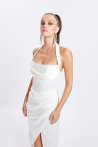 Embody sophistication and grace in the Beatris Dress by Gigii’s, a stunning white satin creation perfect for special occasions and elegant events. Crafted from luxurious satin, this dress softly drapes over the body, creating a flattering, feminine silhouette. The delicate draping at the bodice and gathered waistline add a modern, refined touch, while the floor-length skirt flows gracefully with each step.