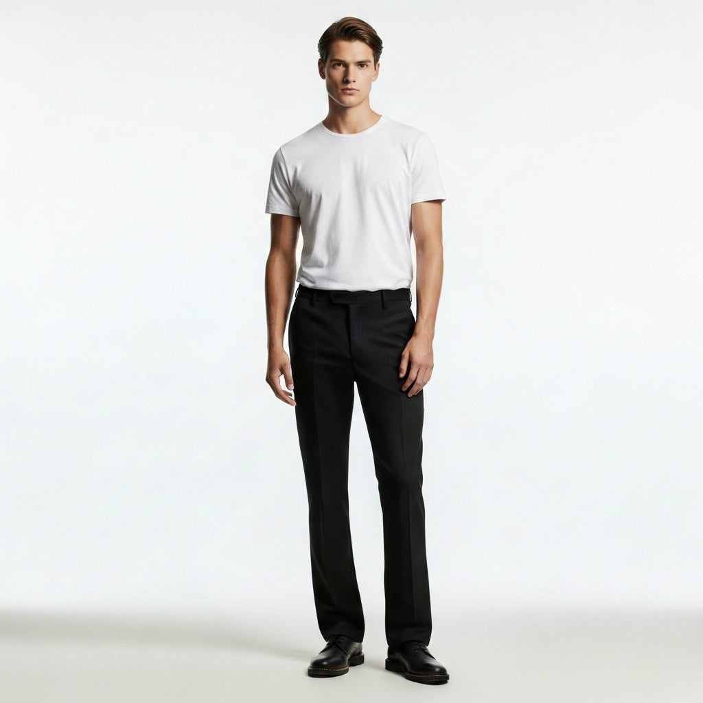Crafted from a premium blend of 74% cotton, 23% polyester, and 3% elastane, these pants offer a soft, breathable feel with just the right amount of stretch for all-day comfort and shape retention. The deep black hue provides timeless versatility, making them the perfect foundation for both formal and casual ensembles.