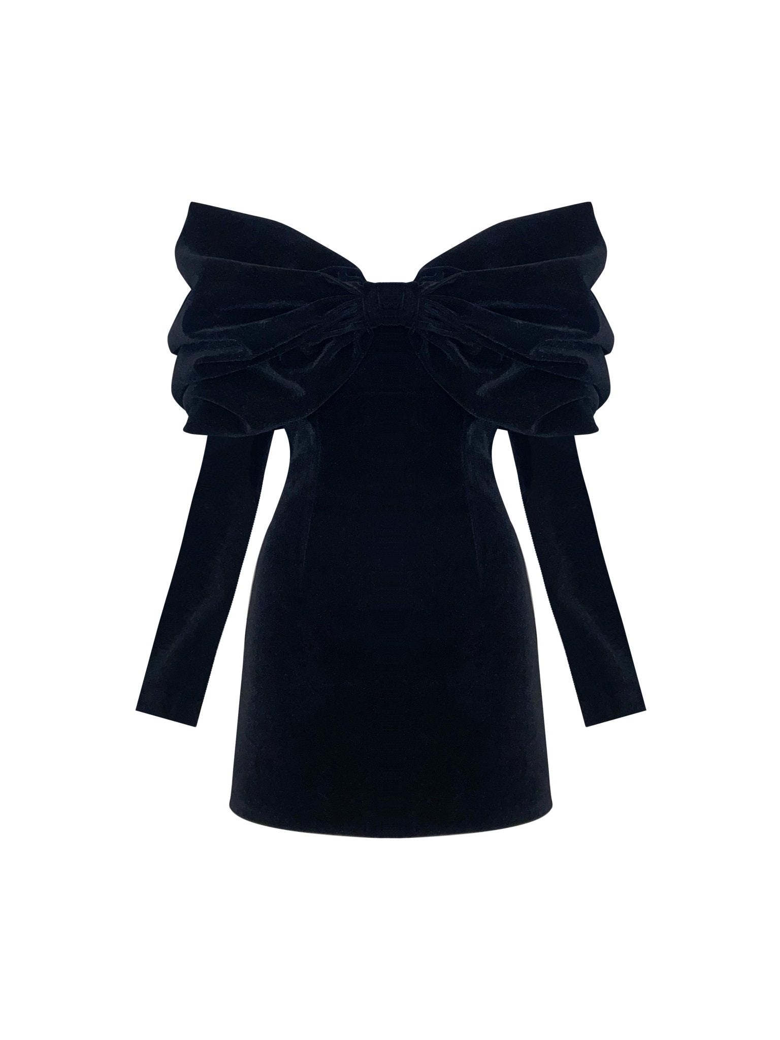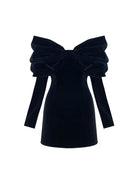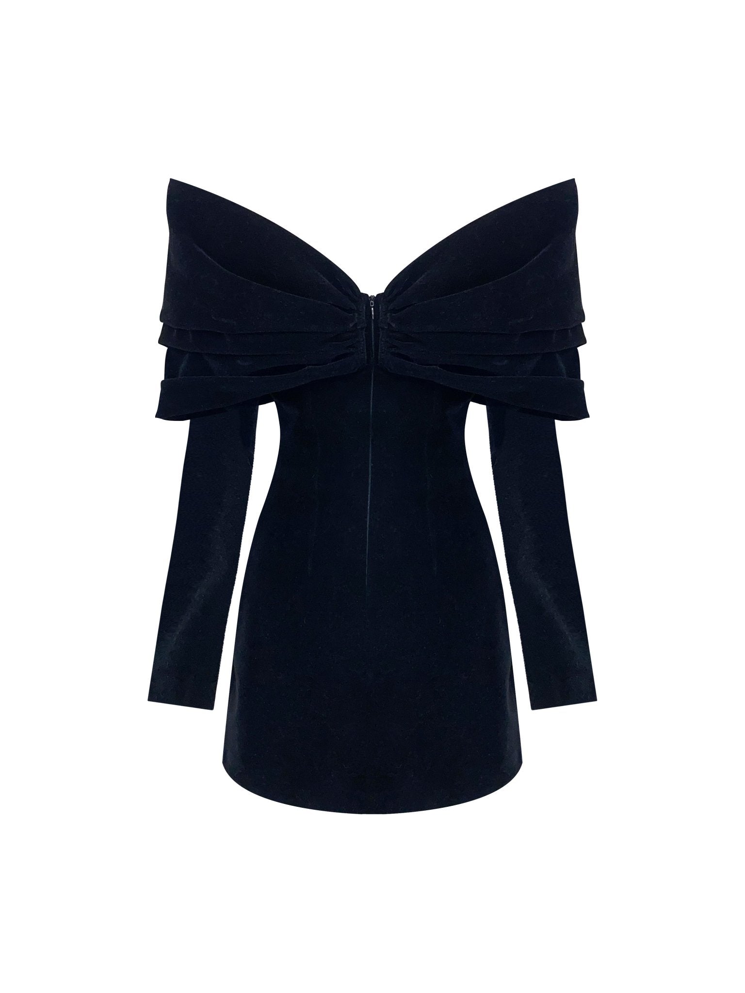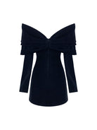 The off-the-shoulder neckline exudes modern elegance, while the gathered velvet bodice adds depth and texture for a rich, luxurious feel. Long sleeves offer a refined balance, complementing the structured yet graceful design. The skirt falls above the knee in a slight A-line silhouette, ensuring both comfort and ease of movement.