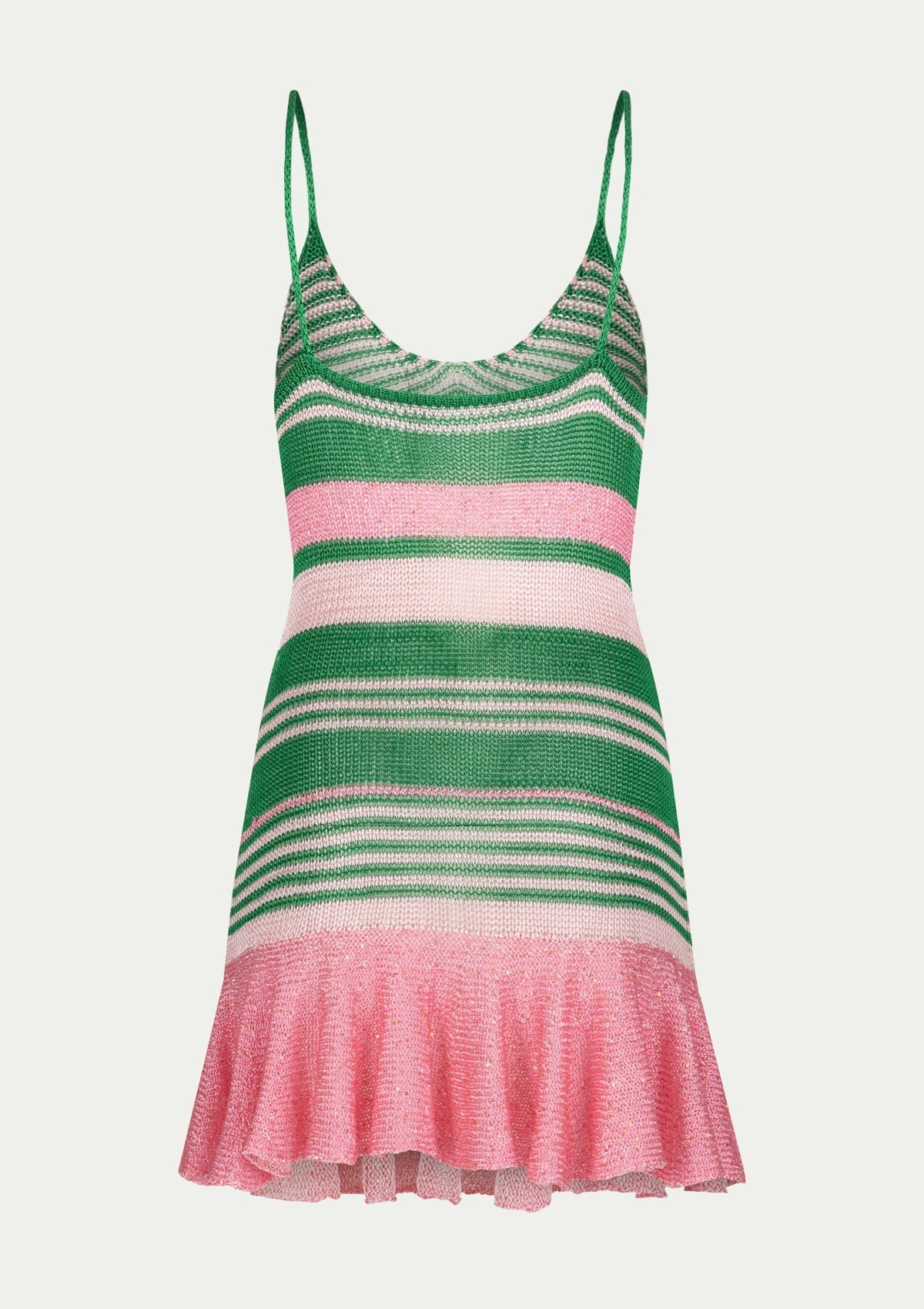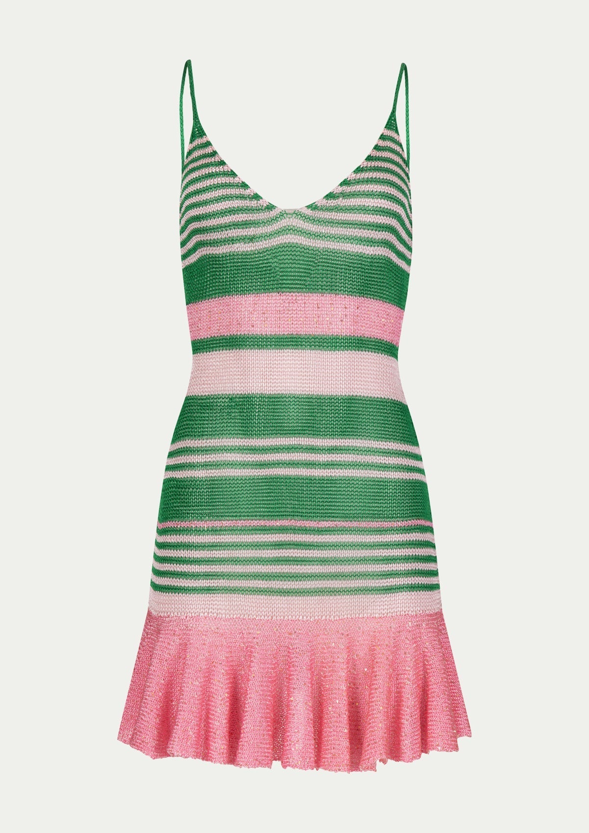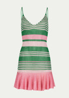PARAMIDONNA's short knitted LEA dress. The two coloured dress with thin straps is available in sizes XS/S and M/L. Carefully made from silk yarn, this dress in pink and green features a chic design that adds charm to the silhouette. With its above-the-knee length, the LEA dress gracefully hugs the body, highlighting your curves and is suitable for any summer occasion. The short summer dress model aims to enable you to express your unique style and radiate confidence.